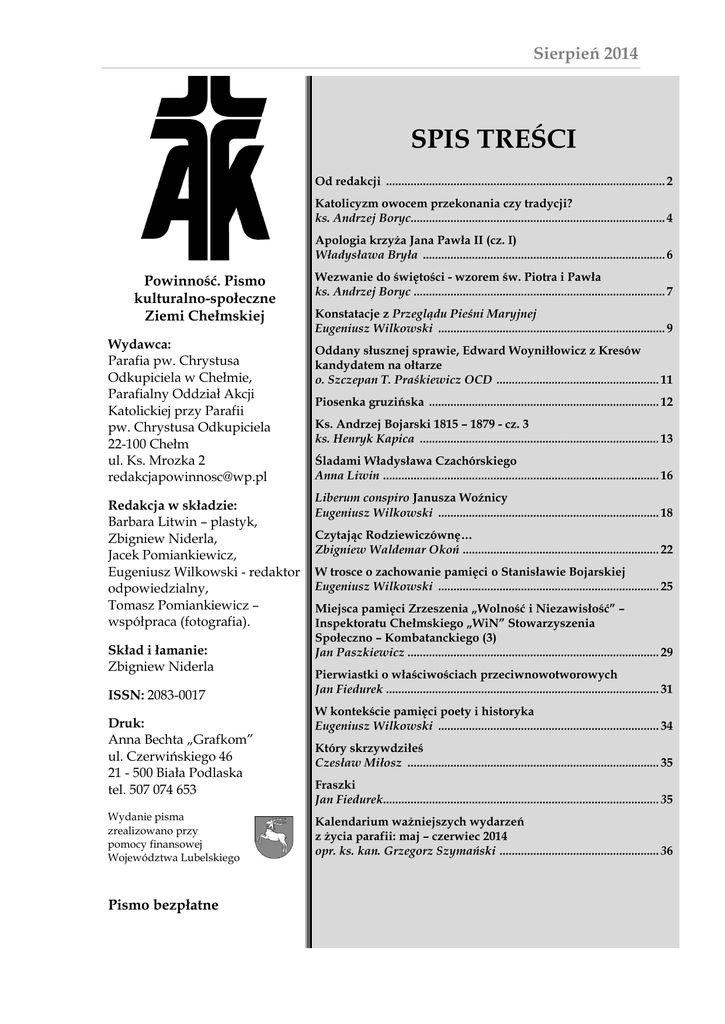 Sierpień 2014 SPIS TREŚCI Od redakcji ........................................................................................... 2 Katolicyzm owocem przekonania czy tradycji? ks. Andrzej Boryc ................................................................................... 4 Apologia krzyża Jana Pawła II (cz. I) Władysława Bryła ............................................................................... 6 Powinność. Pismo kulturalno-społeczne Ziemi Chełmskiej Wydawca: Parafia pw. Chrystusa Odkupiciela w Chełmie, Parafialny Oddział Akcji Katolickiej przy Parafii pw. Chrystusa Odkupiciela 22-100 Chełm ul. Ks. Mrozka 2 [email protected] Redakcja w składzie: Barbara Litwin – plastyk, Zbigniew Niderla, Jacek Pomiankiewicz, Eugeniusz Wilkowski - redaktor odpowiedzialny, Tomasz Pomiankiewicz – współpraca (fotografia). Skład i łamanie: Zbigniew Niderla ISSN: 2083-0017 Druk: Anna Bechta „Grafkom” ul. Czerwińskiego 46 21 - 500 Biała Podlaska tel. 507 074 653 Wydanie pisma zrealizowano przy pomocy finansowej Województwa Lubelskiego Wezwanie do świętości - wzorem św. Piotra i Pawła ks. Andrzej Boryc .................................................................................. 7 Konstatacje z Przeglądu Pieśni Maryjnej Eugeniusz Wilkowski .......................................................................... 9 Oddany słusznej sprawie, Edward Woyniłłowicz z Kresów kandydatem na ołtarze o. Szczepan T. Praśkiewicz OCD ..................................................... 11 Piosenka gruzińska ........................................................................... 12 Ks. Andrzej Bojarski 1815 – 1879 - cz. 3 ks. Henryk Kapica .............................................................................. 13 Śladami Władysława Czachórskiego Anna Liwin .......................................................................................... 16 Liberum conspiro Janusza Woźnicy Eugeniusz Wilkowski ........................................................................ 18 Czytając Rodziewiczównę… Zbigniew Waldemar Okoń ................................................................ 22 W trosce o zachowanie pamięci o Stanisławie Bojarskiej Eugeniusz Wilkowski ........................................................................ 25 Miejsca pamięci Zrzeszenia „Wolność i Niezawisłość” – Inspektoratu Chełmskiego „WiN” Stowarzyszenia Społeczno – Kombatanckiego (3) Jan Paszkiewicz .................................................................................. 29 Pierwiastki o właściwościach przeciwnowotworowych Jan Fiedurek ......................................................................................... 31 W kontekście pamięci poety i historyka Eugeniusz Wilkowski ........................................................................ 34 Który skrzywdziłeś Czesław Miłosz .................................................................................. 35 Fraszki Jan Fiedurek .......................................................................................... 35 Kalendarium ważniejszych wydarzeń z życia parafii: maj – czerwiec 2014 opr. ks. kan. Grzegorz Szymański .................................................... 36 6 Pismo bezpłatne Sierpień 2014 Powinność. Pismo kulturalno-społeczne Ziemi Chełmskiej Od redakcji S ierpień zaprasza do kolejnych refleksji, wpisanych w filozofię narodowych dziejów. Tyle przesądzających wydarzeń wycisnęło swe piętno w tej części roku. W 1920 r. Polacy stanęli przed niesłychanie ważną próbą, koniecznością obrony świeżo odzyskanej niepodległości. Strach pomyśleć, co byłoby, gdyby nie stawili skutecznego oporu na przedpolach Warszawy. Nie wolno nam zapominać o tym rozdziale polskiego oręża i postawie narodu determinowanej wolą płacenia najwyższej ceny, byle tylko Ta, co powstała, została uratowana. Jest to niewątpliwie rocznica czasu chwały. To tym rysem naznaczone zostały okładki niniejszego numeru, z pamięcią o bitwach: Warszawskiej i pod nieodległym Komarowem. Na froncie południowym to ona stała się momentem zwrotnym. 1 sierpnia 1944 r. rozpoczęło się Powstanie Warszawskie, które wpisuje się w jeden z najtrudniejszych rozdziałów naszej przeszłości. Weźmy w nawias spory, czy rzeczywiście musiała zostać podjęta decyzja o jego rozpoczęciu. Uwzględniając ówczesne uwarunkowania, patriotycznie nastawioną młodzież warszawską, jego wybuch stawał się przesądzony. O tych dwóch wielkich wydarzeniach przez kilka dziesięcioleci nie wolno było mówić, pisać, przekazywać rzetelnej wiedzy kolejnemu pokoleniu. W zamian zatruwano umysły rocznicami rewolucji bolszewickiej, lipcowego święta, będącego wyrazem uczynienia z Polski wasala dominium czerwonej Rosji, a na żołnierzy Armii Krajowej wskazywano jako na zaplutych karłów reakcji. Stan ten – trwający z różnym natężeniem - przerwał dopiero sierpień 1980 r., gdy powstała Solidarność. To kolejny wielki znak polskiego sierpnia, którego nie można wyrwać z narodowej tożsamości. Co prawda, przyszły jeszcze doświadczenia stanu wojennego, ale zniewalającemu systemowi powiewu wolności nie udało się już zdławić. W równej mierze powinniśmy pamiętać o sierpniu 1920, 1944 roku, jak i 1980. Nie można wobec przeszłości stosować wybiórczych narzędzi poznawczych czy aksjologicznych. Sierpień to okres dyskursu upominającego się o trzeźwość narodu. Może w ostatnich latach idea ta nieco przestygła w swoim natężeniu, ale powinna ożywiać pamięć o wysiłku podjętym w poprzednich dekadach czy nawet stuleciach. W połowie XIX wieku, na tej idei budowane było na Śląsku odrodzenie narodowe polskie, polskie trwanie w Wielkopolsce. Po zdławieniu Powstania Styczniowego, na terenach Kongresówki, rozwijana była praca nad trzeźwością ludu, głównie 2|Strona przez oo. kapucynów, z bł. o. Honoratem 