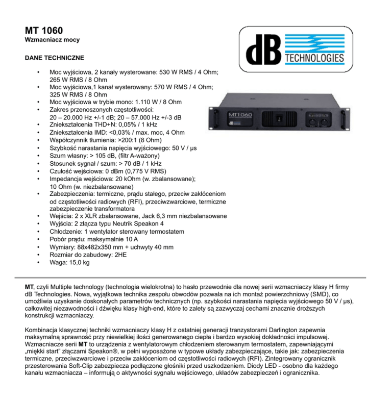 MT 1060 Wzmacniacz mocy DANE TECHNICZNE • • • • • • • • • • • • • • • • • • • • Moc wyjściowa, 2 kanały wysterowane: 530 W RMS / 4 Ohm; 265 W RMS / 8 Ohm Moc wyjściowa,1 kanał wysterowany: 570 W RMS / 4 Ohm; 325 W RMS / 8 Ohm Moc wyjściowa w trybie mono: 1.110 W / 8 Ohm Zakres przenoszonych częstotliwości: 20 – 20.000 Hz +/-1 dB; 20 – 57.000 Hz +/-3 dB Zniekształcenia THD+N: 0,05% / 1 kHz Zniekształcenia IMD: <0,03% / max. moc, 4 Ohm Współczynnik tłumienia: >200:1 (8 Ohm) Szybkość narastania napięcia wyjściowego: 50 V / µs Szum własny: > 105 dB, (filtr A-ważony) Stosunek sygnał / szum: > 70 dB / 1 kHz Czułość wejściowa: 0 dBm (0,775 V RMS) Impedancja wejściowa: 20 kOhm (w. zbalansowane); 10 Ohm (w. niezbalansowane) Zabezpieczenia: termiczne, prądu stałego, przeciw zakłóceniom od częstotliwości radiowych (RFI), przeciwzwarciowe, termiczne zabezpieczenie transformatora Wejścia: 2 x XLR zbalansowane, Jack 6,3 mm niezbalansowane Wyjścia: 2 złącza typu Neutrik Speakon 4 Chłodzenie: 1 wentylator sterowany termostatem Pobór prądu: maksymalnie 10 A Wymiary: 88x482x350 mm + uchwyty 40 mm Rozmiar do zabudowy: 2HE Waga: 15,0 kg MT, czyli Multiple technology (technologia wielokrotna) to hasło przewodnie dla nowej serii wzmacniaczy klasy H firmy dB Technologies. Nowa, wyjątkowa technika zespołu obwodów pozwala na ich montaż powierzchniowy (SMD), co umożliwia uzyskanie doskonałych parametrów technicznych (np. szybkości narastania napięcia wyjściowego 50 V / µs), całkowitej niezawodności i dźwięku klasy high-end, które to zalety są zazwyczaj cechami znacznie droższych konstrukcji wzmacniaczy. Kombinacja klasycznej techniki wzmacniaczy klasy H z ostatniej generacji tranzystorami Darlington zapewnia maksymalną sprawność przy niewielkiej ilości generowanego ciepła i bardzo wysokiej dokładności impulsowej. Wzmacniacze serii MT to urządzenia z wentylatorowym chłodzeniem sterowanym termostatem, zapewniającymi „miękki start” złączami Speakon®, w pełni wyposażone w typowe układy zabezpieczające, takie jak: zabezpieczenia termiczne, przeciwzwarciowe i przeciw zakłóceniom od częstotliwości radiowych (RFI). Zintegrowany ogranicznik przesterowania Soft-Clip zabezpiecza podłączone głośniki przed uszkodzeniem. Diody LED - osobno dla każdego kanału wzmacniacza – informują o aktywności sygnału wejściowego, układów zabezpieczeń i ogranicznika.