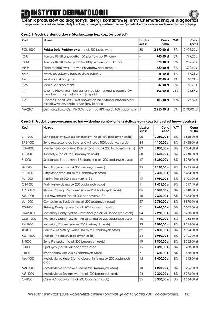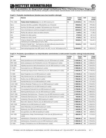 Cennik produktów do diagnostyki alergii kontaktowej Firmy Chemotechnique Diagnostics Uwaga: niniejszy cennik nie stanowi oferty handlowej, zastrzegamy możliwość błędów. Sprawdź aktualny cennik na stronie www.chemotechnique.pl Część I. Produkty standardowe (dostarczane bez kosztów obsługi) Kod Nazwa Liczba subst. Cena netto VAT Cena brutto POL-1000 Polska Seria Podstawowa (na ok 200 badanych) 30 2 690,00 zł 8% 2 905,20 zł IQ-U Komory IQ Ultra, pudełko 100 plastrów po 10 komór - 740,00 zł 8% 799,20 zł IQ-UL Komory IQ Ultimate, pudełko 100 plastrów po 10 komór - 870,00 zł 8% 939,60 zł AP-P Taca montażowa (ułatwia przygotowanie komór ) - 530,00 zł 8% 572,40 zł RP-P Płytka do odczytu testu ze skalą odczytu - 16,00 zł 8% 17,28 zł SM Marker do skóry gruby - 47,00 zł 8% 50,76 zł SMS Marker do skóry cienki - 47,00 zł 8% 50,76 zł NT Chemo Nickel Test - Test barwny do identyfikacji przedmiotów metalowych wydzielających jony niklu - 103,00 zł 23% 126,69 zł CoT Chemo Cobalt Test - Test barwny do identyfikacji przedmiotów metalowych wydzielających jony kobaltu - 103,00 zł 23% 126,69 zł Mx-21C Dermatophagoides Mix 30% (subst. do APT, na ok 100 badanych) 1 2 250,00 zł 8% 2 430,00 zł Część II. Produkty sprowadzane na indywidualne zamówienie (z doliczeniem kosztów obsługi indywidualnej) Kod Nazwa Liczba subst. Cena netto VAT Cena brutto EP-1000 Seria podstawowa do Fototestów (na ok 100 badanych osób) EPE-1000 Seria rozszerzona do Fototestów (na ok 100 badanych osób) 20 2 350,00 zł 8% 2 538,00 zł 34 4 100,00 zł 8% 4 428,00 zł ICB-1000 Międzynarodowa Seria Rozszerzona (na ok 200 badanych osób) 83 8 800,00 zł 8% 9 504,00 zł C-1000 Kosmetyki (na ok 200 badanych osób) 58 5 500,00 zł 8% 5 940,00 zł F-1000 Substancje Zapachowe i Perfumy (na ok 200 badanych osób) 47 5 350,00 zł 8% 5 778,00 zł H-1000 Seria Fryzjerska (na ok 200 badanych osób) 35 3 190,00 zł 8% 3 445,20 zł SU-1000 Filtry Słoneczne (na ok 200 badanych osób) 21 2 300,00 zł 8% 2 484,00 zł PL-1000 Rośliny (na ok 200 badanych osób) 17 1 950,00 zł 8% 2 106,00 zł CS-1000 Kortykosterydy (na ok 200 badanych osób) 11 1 405,00 zł 8% 1 517,40 zł CAD-1000 Skórne Reakcje Polekowe (na ok 200 badanych osób) 35 5 500,00 zł 8% 5 940,00 zł ME-1000 Leki zewnętrzne (na ok 200 badanych osób) 18 2 300,00 zł 8% 2 484,00 zł LU-1000 Owrzodzenia Podudzi (na ok 200 badanych osób) 27 2 750,00 zł 8% 2 970,00 zł DS-1000 Skrining Dentystyczny (na ok 200 badanych osób) 31 2 670,00 zł 8% 2 883,60 zł DMP-1000 Materiały Dentystyczne – Pacjenci (na ok 200 badanych osób) 24 2 250,00 zł 8% 2 430,00 zł DMS-1000 Materiały Dentystyczne – Personel (na ok 200 badanych osób) 10 960,00 zł 8% 1 036,80 zł SH-1000 Materiały Obuwia (na ok 200 badanych osób) 23 2 050,00 zł 8% 2 214,00 zł TF-1000 Barwniki i Apretury Tkanin (na ok 200 badanych osób) 32 2 800,00 zł 8% 3 024,00 zł MET-1000 Metale (na ok 200 badanych osób) 54 5 950,00 zł 8% 6 426,00 zł B-1000 Seria Piekarska (na ok 200 badanych osób) 19 1 900,00 zł 8% 2 052,00 zł E-1000 Epoksydy (na 200 ok badanych osób) 15 1 360,00 zł 8% 1 468,80 zł I-1000 Izocyjaniany (na 200 ok badanych osób) 7 610,00 zł 8% 658,80 zł MA-1000 Metakrylany: Kleje, Stomatologia, Inne (na ok 200 badanych osób) 15 1 400,00 zł 8% 1 512,00 zł MN-1000 Metakrylany: Paznokcie (na ok 200 badanych osób) 13 1 200,00 zł 8% 1 296,00 zł MP-1000 Metakrylany: Drukarstwo (na ok 200 badanych osób) 24 2 200,00 zł 8% 2 376,00 zł O-1000 Oleje i Chłodziwa (na ok 200 badanych osób) 35 3 300,00 zł 8% 3 564,00 zł Niniejszy cennik zastępuje wcześniejsze cenniki i obowiązuje od 1 stycznia 2017 do odwołania. str. 1 Cennik produktów do diagnostyki alergii kontaktowej Firmy Chemotechnique Diagnostics Uwaga: niniejszy cennik nie stanowi oferty handlowej, zastrzegamy możliwość błędów. Sprawdź aktualny cennik na stronie www.chemotechnique.pl Kod Nazwa Liczba subst. Cena netto VAT Cena brutto P-1000 Odczynniki Fotograficzne (na ok 200 badanych osób) 16 1 450,00 zł 8% 1 566,00 zł PG-1000 Tworzywa Sztuczne i Kleje (na ok 200 badanych osób) 25 2 260,00 zł 8% 2 440,80 zł R-1000 Składniki Gumy (na ok 200 badanych osób) 26 2 320,00 zł 8% 2 505,60 zł SMUV Marker UV (fluorescencyjny) do skóry cienki - 47,00 zł 8% 50,76 zł TRAY Tacka do przechowywania substancji testowych - 14,00 zł 8% 15,12 zł UV-Lamp Lampa UV (bez baterii) - 150,00 zł 23% 184,50 zł Część III. Pojedyncze substancje testowe Jedno opakowanie (strzykawka lub buteleczka) przy prawidłowym stosowaniu wystarcza na około 200 testów. Kategorie cenowe Kategoria cenowa A Cena netto VAT Cena brutto 96,00 zł 8% 103,68 zł 129,00 zł 8% 139,32 zł - do kategorii cenowej A należą wszystkie substancje nie wymienione w kategoriach B, C i D. Kategoria cenowa B - do kategorii cenowej B należą substancje o kodach: A-006A, A-006B, A-010, A-013, A-024, A-025, A-034, A-035, A-036, A-037, A-038, B-029B, B-029C, B-031, B-032A, B-032B, B-033A, B-033B, B-037, B-038, B-039, B-040, B-041, B-042, B-043, B-044, C-001, C-021, C-028, C-029, C-031, C-032, C-036, C-037, C-038, C-049, C-050, C-051, D-046, D-048, D-057, D-062, D-063, D-064, D-065, D-066A, D-066B, D-067, E-018B, E-018C, E-018D, E-019B, E-019C, E-021, E-023, E-025, E-026, E-027, F-003, F-004, F-005, F-006, G-005A, G-005B, G-006, G-007, H-014C, H-020B, H-021A, H-021B, H-023C, H-024A, H-024B, H-025, H-033, I-009, I-011, I-012, I-013, I-014, I-015, I-016, I-017, J-002, K-001, L-003, L-005B, L-006C, L-007, L-008, M-004, M-008, M-010B, M-022, M-024B, M-026, M-027, M-030, M-031, M-032, M-033, M-034, M-036, M-037, M-038, M-040, Mx-13, Mx-18, Mx-19, Mx-20, Mx-24, Mx-27, Mx-28, Mx-31 N-005, N-006, N-008, O-001, O-007A, O-007B, O-008, O-009, O-010, P-001, P-015, P-022, P-024B, P-029, P-035, P-036, P-039, Q-001, R-003, R-012, S-007, S-009, S-010, S-013, S-014, S-015, S-017, S-018, S-019, T-024B, T-030, T-031A, T-031B, T-032, T-033, T-034, T-035