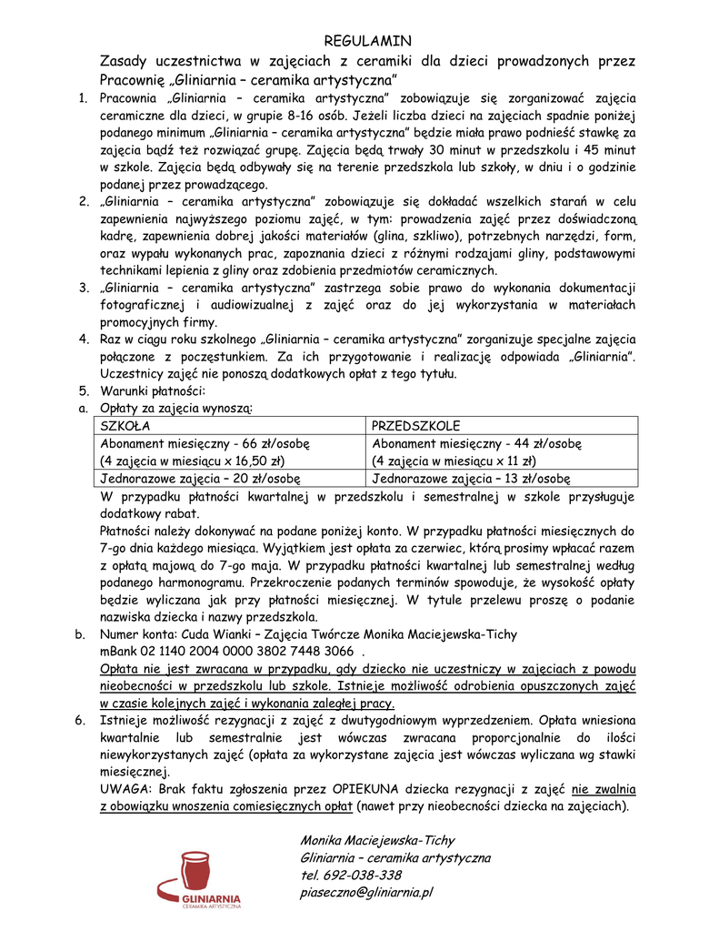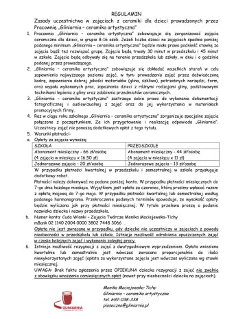 1. 2. 3. 4. 5. a. b. 6. REGULAMIN Zasady uczestnictwa w zajęciach z ceramiki dla dzieci prowadzonych przez Pracownię „Gliniarnia – ceramika artystyczna” Pracownia „Gliniarnia – ceramika artystyczna” zobowiązuje się zorganizować zajęcia ceramiczne dla dzieci, w grupie 8-16 osób. Jeżeli liczba dzieci na zajęciach spadnie poniżej podanego minimum „Gliniarnia – ceramika artystyczna” będzie miała prawo podnieść stawkę za zajęcia bądź też rozwiązać grupę. Zajęcia będą trwały 30 minut w przedszkolu i 45 minut w szkole. Zajęcia będą odbywały się na terenie przedszkola lub szkoły, w dniu i o godzinie podanej przez prowadzącego. „Gliniarnia – ceramika artystyczna” zobowiązuje się dokładać wszelkich starań w celu zapewnienia najwyższego poziomu zajęć, w tym: prowadzenia zajęć przez doświadczoną kadrę, zapewnienia dobrej jakości materiałów (glina, szkliwo), potrzebnych narzędzi, form, oraz wypału wykonanych prac, zapoznania dzieci z różnymi rodzajami gliny, podstawowymi technikami lepienia z gliny oraz zdobienia przedmiotów ceramicznych. „Gliniarnia – ceramika artystyczna” zastrzega sobie prawo do wykonania dokumentacji fotograficznej i audiowizualnej z zajęć oraz do jej wykorzystania w materiałach promocyjnych firmy. Raz w ciągu roku szkolnego „Gliniarnia – ceramika artystyczna” zorganizuje specjalne zajęcia połączone z poczęstunkiem. Za ich przygotowanie i realizację odpowiada „Gliniarnia”. Uczestnicy zajęć nie ponoszą dodatkowych opłat z tego tytułu. Warunki płatności: Opłaty za zajęcia wynoszą: SZKOŁA PRZEDSZKOLE Abonament miesięczny - 66 zł/osobę Abonament miesięczny - 44 zł/osobę (4 zajęcia w miesiącu x 16,50 zł) (4 zajęcia w miesiącu x 11 zł) Jednorazowe zajęcia – 20 zł/osobę Jednorazowe zajęcia – 13 zł/osobę W przypadku płatności kwartalnej w przedszkolu i semestralnej w szkole przysługuje dodatkowy rabat. Płatności należy dokonywać na podane poniżej konto. W przypadku płatności miesięcznych do 7-go dnia każdego miesiąca. Wyjątkiem jest opłata za czerwiec, którą prosimy wpłacać razem z opłatą majową do 7-go maja. W przypadku płatności kwartalnej lub semestralnej według podanego harmonogramu. Przekroczenie podanych terminów spowoduje, że wysokość opłaty będzie wyliczana jak przy płatności miesięcznej. W tytule przelewu proszę o podanie nazwiska dziecka i nazwy przedszkola. Numer konta: Cuda Wianki – Zajęcia Twórcze Monika Maciejewska-Tichy mBank 02 1140 2004 0000 3802 7448 3066 . Opłata nie jest zwracana w przypadku, gdy dziecko nie uczestniczy w zajęciach z powodu nieobecności w przedszkolu lub szkole. Istnieje możliwość odrobienia opuszczonych zajęć w czasie kolejnych zajęć i wykonania zaległej pracy. Istnieje możliwość rezygnacji z zajęć z dwutygodniowym wyprzedzeniem. Opłata wniesiona kwartalnie lub semestralnie jest wówczas zwracana proporcjonalnie do ilości niewykorzystanych zajęć (opłata za wykorzystane zajęcia jest wówczas wyliczana wg stawki miesięcznej. UWAGA: Brak faktu zgłoszenia przez OPIEKUNA dziecka rezygnacji z zajęć nie zwalnia z obowiązku wnoszenia comiesięcznych opłat (nawet przy nieobecności dziecka na zajęciach). Monika Maciejewska-Tichy Gliniarnia – ceramika artystyczna tel. 692-038-338 [email protected]