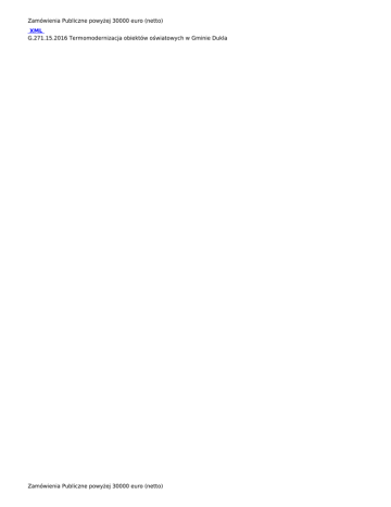 Zamówienia Publiczne powyżej 30000 euro (netto) XML G.271.15.2016 Termomodernizacja obiektów oświatowych w Gminie Dukla Zamówienia Publiczne powyżej 30000 euro (netto) Zamówienia Publiczne powyżej 30000 euro (netto) Adres strony internetowej, na której zamieszczona będzie specyfikacja istotnych warunków zamówienia (jeżeli dotyczy): http://bip.dukla.pl// Ogłoszenie nr 332970 - 2016 z dnia 2016-10-28 r. Dukla: „Termomodernizacja obiektów oświatowych w Gminie Dukla” 1) Termomodernizacja Zespołu Szkół w Jasionce 2) Termomodernizacja w Zespole Szkół w Tylawie 3) Termomodernizacja Szkoły Podstawowej w Wietrznie 4) Termomodernizacja Szkoły Podstawowej w Iwli 5) Termomodernizacja Szkoły Podstawowej w Głojscach OGŁOSZENIE O ZAMÓWIENIU Zamieszczanie ogłoszenia: obowiązkowe Ogłoszenie dotyczy: Zamówienie dotyczy projektu lub programu współfinansowanego ze środków Unii Europejskiej tak Nazwa projektu lub programu Regionalny Program Operacyjny Województwa Podkarpackiego na lata 2014-2020 finansowany w ramach Europejskiego Funduszu Rozwoju Regionalnego O zamówienie mogą ubiegać się wyłącznie zakłady pracy chronionej oraz wykonawcy, których działalność, lub działalność ich wyodrębnionych organizacyjnie jednostek, które będą realizowały zamówienie, obejmuje społeczną i zawodową integrację osób będących członkami grup społecznie marginalizowanych nie Należy podać minimalny procentowy wskaźnik zatrudnienia osób należących do jednej lub więcej kategorii, o których mowa w art. 22 ust. 2 ustawy Pzp, nie mniejszy niż 30%, osób zatrudnionych przez zakłady pracy chronionej lub wykonawców albo ich jednostki (w %) SEKCJA I: ZAMAWIAJĄCY Postępowanie przeprowadza centralny zamawiający nie Postępowanie przeprowadza podmiot, któremu zamawiający powierzył/powierzyli przeprowadzenie postępowania nie Informacje na temat podmiotu któremu zamawiający powierzył/powierzyli prowadzenie postępowania: Postępowanie jest przeprowadzane wspólnie przez zamawiających nie Jeżeli tak, należy wymienić zamawiających, którzy wspólnie przeprowadzają postępowanie oraz podać adresy ich siedzib, krajowe numery identyfikacyjne oraz osoby do kontaktów wraz z danymi do kontaktów: Postępowanie jest przeprowadzane wspólnie z zamawiającymi z innych państw członkowskich Unii Europejskiej nie W przypadku przeprowadzania postępowania wspólnie z zamawiającymi z innych państw członkowskich Unii Europejskiej – mające zastosowanie krajowe prawo zamówień publicznych: Informacje dodatkowe: I. 1) NAZWA I ADRES: Gmina Dukla, krajowy numer identyfikacyjny , ul. ul. Trakt Węgierski 11, 38450 Dukla, woj. podkarpackie, państwo Polska, tel. 134 329 135, e-mail , faks 134 331 011. Adres strony internetowej (URL): I. 2) RODZAJ ZAMAWIAJĄCEGO: Administracja samorządowa I.3) WSPÓLNE UDZIELANIE ZAMÓWIENIA (jeżeli dotyczy): Podział obowiązków między zamawiającymi w przypadku wspólnego przeprowadzania postępowania, w tym w przypadku wspólnego przeprowadzania postępowania z zamawiającymi z innych państw członkowskich Unii Europejskiej (który z zamawiających jest odpowiedzialny za przeprowadzenie postępowania, czy i w jakim zakresie za przeprowadzenie postępowania odpowiadają pozostali zamawiający, czy zamówienie będzie udzielane przez każdego z zamawiających indywidualnie, czy zamówienie zostanie udzielone w imieniu i na rzecz pozostałych zamawiających): Podział obowiązków między zamawiającymi w przypadku wspólnego przeprowadzania postępowania, w tym w przypadku wspólnego przeprowadzania postępowania z zamawiającymi z innych państw członkowskich Unii Europejskiej (który z zamawiających jest odpowiedzialny za przeprowadzenie postępowania, czy i w jakim zakresie za przeprowadzenie postępowania odpowiadają pozostali zamawiający, czy zamówienie będzie udzielane przez każdego z zamawiających indywidualnie, czy zamówienie zostanie udzielone w imieniu i na rzecz pozostałych zamawiających): I.4) KOMUNIKACJA: Nieograniczony, pełny i bezpośredni dostęp do dokumentów z postępowania można uzyskać pod adresem (URL) nie Adres strony internetowej, na której zamieszczona będzie specyfikacja istotnych warunków zamówienia tak http://bip.dukla.pl// Dostęp do dokumentów z postępowania jest ograniczony - więcej informacji można uzyskać pod adresem nie Oferty lub wnioski o dopuszczenie do udziału w postępowaniu należy przesyłać: Elektronicznie nie adres Dopuszczone jest przesłanie ofert lub wniosków o dopuszczenie do udziału w postępowaniu w inny sposób: nie Wymagane jest przesłanie ofert lub wniosków o dopuszczenie do udziału w postępowaniu w inny sposób: nie Adres: Komunikacja elektroniczna wymaga korzystania z narzędzi i urządzeń lub formatów plików, które nie są ogólnie dostępne nie Nieograniczony, pełny, bezpośredni i bezpłatny dostęp do tych narzędzi można uzyskać pod adresem: (URL) SEKCJA II: PRZEDMIOT ZAMÓWIENIA II.1) Nazwa nadana zamówieniu przez zamawiającego: „Termomodernizacja obiektów oświatowych w Gminie Dukla” 1) Termomodernizacja Zespołu Szkół w Jasionce 2) Termomodernizacja w Zespole Szkół w Tylawie 3) Termomodernizacja Szkoły Podstawowej w Wietrznie 4) Termomodernizacja Szkoły Podstawowej w Iwli 5) Termomodernizacja Szkoły Podstawowej w Głojscach Numer referencyjny: G.271.15.2016 Przed wszczęciem postępowania o udzielenie zamówienia przeprowadzono dialog techniczny nie II.2) Rodzaj zamówienia: II.3) Informacja o możliwości składania ofert częściowych Zamówienie podzielone jest na części: Tak Oferty lub wnioski o dopuszczenie do udziału w postępowaniu można składać w odniesieniu do: wszystkich części Maksymalna liczba części zamówienia, na które może zostać udzielone zamówienie jednemu wykonawcy: 5 II.4) Krótki opis przedmiotu zamówienia (wielkość, zakres, rodzaj i ilość dostaw, usług lub robót budowla