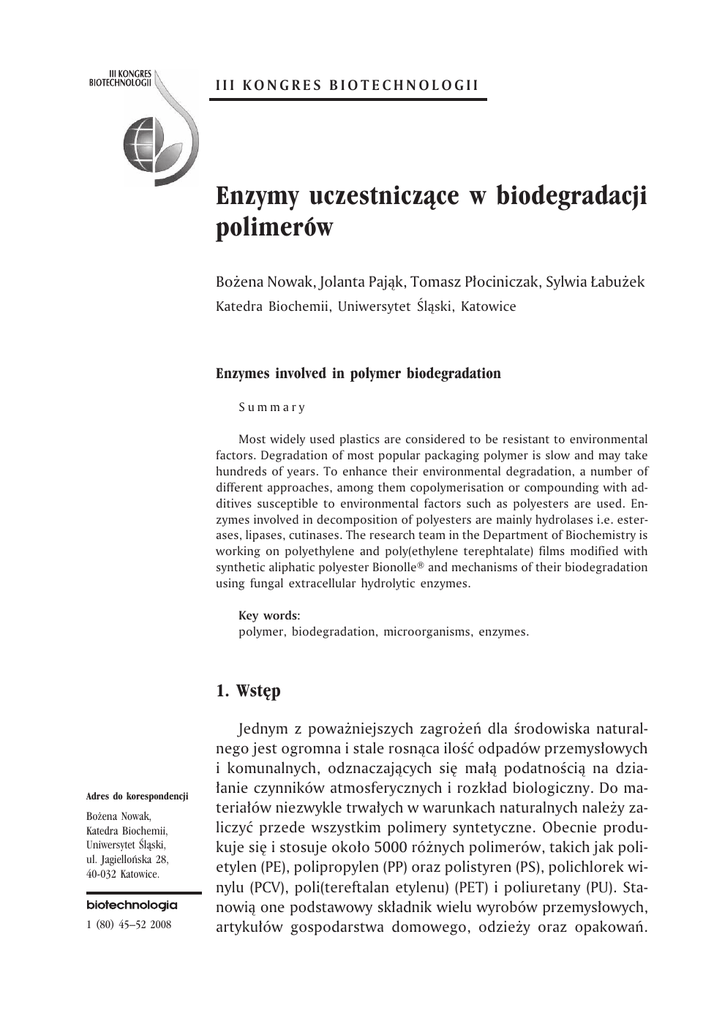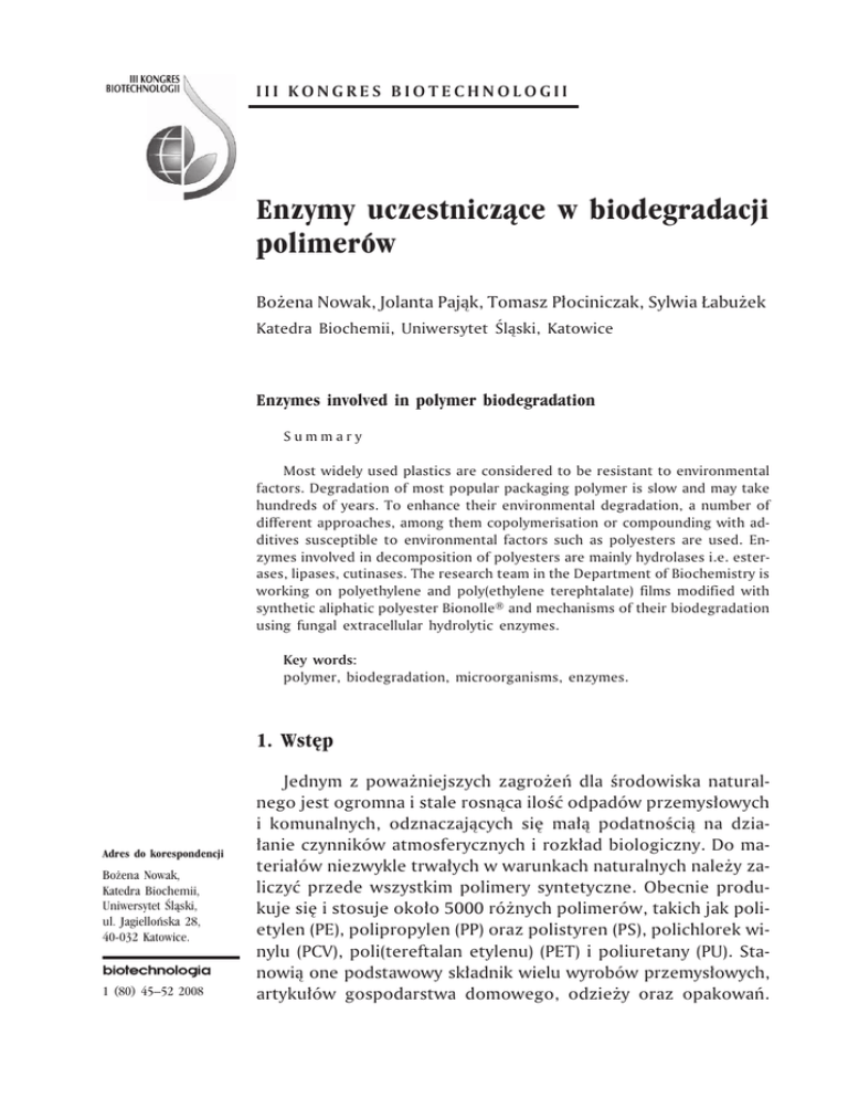 III KONGRES BIOTECHNOLOGII Enzymy uczestnicz¹ce w biodegradacji polimerów Bo¿ena Nowak, Jolanta Paj¹k, Tomasz P³ociniczak, Sylwia £abu¿ek Katedra Biochemii, Uniwersytet Œl¹ski, Katowice Enzymes involved in polymer biodegradation Summary Most widely used plastics are considered to be resistant to environmental factors. Degradation of most popular packaging polymer is slow and may take hundreds of years. To enhance their environmental degradation, a number of different approaches, among them copolymerisation or compounding with additives susceptible to environmental factors such as polyesters are used. Enzymes involved in decomposition of polyesters are mainly hydrolases i.e. esterases, lipases, cutinases. The research team in the Department of Biochemistry is working on polyethylene and poly(ethylene terephtalate) films modified with synthetic aliphatic polyester Bionolle® and mechanisms of their biodegradation using fungal extracellular hydrolytic enzymes. Key words: polymer, biodegradation, microorganisms, enzymes. 1. Wstêp Adres do korespondencji Bo¿ena Nowak, Katedra Biochemii, Uniwersytet Œl¹ski, ul. Jagielloñska 28, 40-032 Katowice. 1 (80) 45–52 2008 Jednym z powa¿niejszych zagro¿eñ dla œrodowiska naturalnego jest ogromna i stale rosn¹ca iloœæ odpadów przemys³owych i komunalnych, odznaczaj¹cych siê ma³¹ podatnoœci¹ na dzia³anie czynników atmosferycznych i rozk³ad biologiczny. Do materia³ów niezwykle trwa³ych w warunkach naturalnych nale¿y zaliczyæ przede wszystkim polimery syntetyczne. Obecnie produkuje siê i stosuje oko³o 5000 ró¿nych polimerów, takich jak polietylen (PE), polipropylen (PP) oraz polistyren (PS), polichlorek winylu (PCV), poli(tereftalan etylenu) (PET) i poliuretany (PU). Stanowi¹ one podstawowy sk³adnik wielu wyrobów przemys³owych, artyku³ów gospodarstwa domowego, odzie¿y oraz opakowañ. Bo¿ena Nowak i inni Tworzywa opakowaniowe bardzo szybko staj¹ siê odpadami podobnie jak du¿e iloœci wytwarzanych produktów jednorazowego u¿ytku. W województwie œl¹skim w 2005 r. zebrano 1 306 601,80 Mg odpadów komunalnych, wœród których 12,1% stanowi³y tworzywa sztuczne. Podstawow¹ metod¹ unieszkodliwiania odpadów komunalnych jest sk³adowanie. Obecnie na Œl¹sku czynne s¹ 43 sk³adowiska zajmuj¹ce powierzchniê 300 ha (1). Polimery syntetyczne ulegaj¹ w œrodowisku degradacji pod wp³ywem czynników abiotycznych takich jak promieniowanie s³oneczne, zanieczyszczenia atmosferyczne, energia cieplna, obecnoœæ wody, jak równie¿ pod wp³ywem czynników biologicznych obejmuj¹cych dzia³alnoœæ makro- i mikroorganizmów (2). Biologiczny rozk³ad polimerów przebiega g³ównie z udzia³em mikroorganizmów, takich jak bakterie lub grzyby, które maj¹ tê przewagê nad czynnikami abiotycznymi, ¿e posiadaj¹ fizjologiczne oraz genetyczne mechanizmy adaptacyjne umo¿liwiaj¹ce rozk³ad zupe³nie nowych, czasami jedynie teoretycznie odpornych na ich dzia³anie kompozycji polimerowych. Wœród polimerów syntetycznych najbardziej podatne na rozk³ad mikrobiologiczny s¹ alifatyczne poliestry. Obecnoœæ polimeru sk³ania lub zwiêksza drobnoustrojow¹ syntezê enzymów, które wydzielone do œrodowiska i zaadsorbowane na powierzchni tworzywa, rozrywaj¹ jego wi¹zania polimerowe (3). Przyjmuje siê, ¿e poliestry ulegaj¹ degradacji enzymatycznej g³ównie na drodze hydrolizy z udzia³em proteaz, esteraz, lipaz i kutynaz (4). Ze wzglêdu na mechanizm dzia³ania enzymy te zalicza siê do hydrolaz serynowych, zawieraj¹cych aktywne centrum w postaci triady katalitycznej (Ser-His-Asp). W artykule tym prezentujemy ogólne informacje na temat prowadzonych w Zespole badañ nad biodegradacj¹ polimerów. 2. Biodegradacja kompozycji polietylen/Bionolle® oraz poli(tereftalan etylenu)/ Bionolle® z udzia³em drobnoustrojów Jedn¹ z metod pozwalaj¹cych na ograniczenie iloœci zalegaj¹cych w œrodowisku odpadów opakowaniowych jest produkcja tworzyw ulegaj¹cych ca³kowitej biodegradacji (5). Nale¿¹ tu opakowania z surowców naturalnych, produkowane m.in. ze skrobi ziemniaczanej i kukurydzianej, b¹dŸ w pe³ni syntetyczne alifatyczne i aromatyczne poliestry, polietery czy poliuretany (6). Niestety koszt ich wytworzenia niejednokrotnie przewy¿sza koszt produkcji tradycyjnych opakowañ z poliolefin o ³añcuchu czysto wêglowym. Kompromisem, pomiêdzy wysok¹ cen¹ jednych a s³ab¹ podatnoœci¹ na degradacjê innych polimerów, mo¿e byæ modyfikacja polietylenu (PE), polipropylenu (PP), polistyrenu (PS) lub poli(chlorku winylu) (PVC) substancjami pochodzenia naturalnego lub syntetycznego w celu przyspieszenia ich biodegradacji (7,8). Jesteœmy jedynym Zespo³em, w którym rozpoczêto pracê nad biodegradacj¹ polietylenu zmodyfikowanego od 10 do 60% zawartoœci¹ syntetycznego poliestru Bio46 III KONGRES BIOTECHNOLOGII Enzymy uczestnicz¹ce w biodegradacji polimerów nolle®. Alifatyczny poliester Bionolle® powstaje w wyniku reakcji polimeryzacji dioli z kwasami dikarboksylowymi. Na rynku dostêpne s¹ ró¿ne rodzaje polimeru ró¿ni¹ce siê merami, którymi mog¹ byæ: kwas adypinowy, kwas bursztynowy, glikol butylenowy, a tak¿e glikol etylenowy. Rodzaj merów wchodz¹cych w sk³ad ³añcucha wp³ywa na w³aœciwoœci polimeru (9). Projekt badawczy zmierza³ do uzyskania opakowaniowych folii polietylenowych modyfikowanych, które bêd¹ rozk³adane przez powszechnie wystêpuj¹ce w œrodowisku mikroorganizmy szybciej ni¿ polietylen. W prowadzonych przez nas wczeœniej badaniach polowych wykazano, ¿e modyfikowane folie polietylenowe ulegaj¹ rozk³adowi w glebie (10). Wyizolowano 65 szczepów mikroorganizmów bytuj¹cych na powierzchniach kompozytów polimerowych. Wœród nich dominowa³y bakterie rodzajów Bacillus, Paenibacillus, Staphylococcus, Micrococcus, Acinetobacter, Arthrobacter, Burkholderia, Pseudomonas, Rahnella, Cellulomonas, Rhodococcus, Chryseobacterium, Pantoea, Sporosarcina i Nocardia oraz grzy