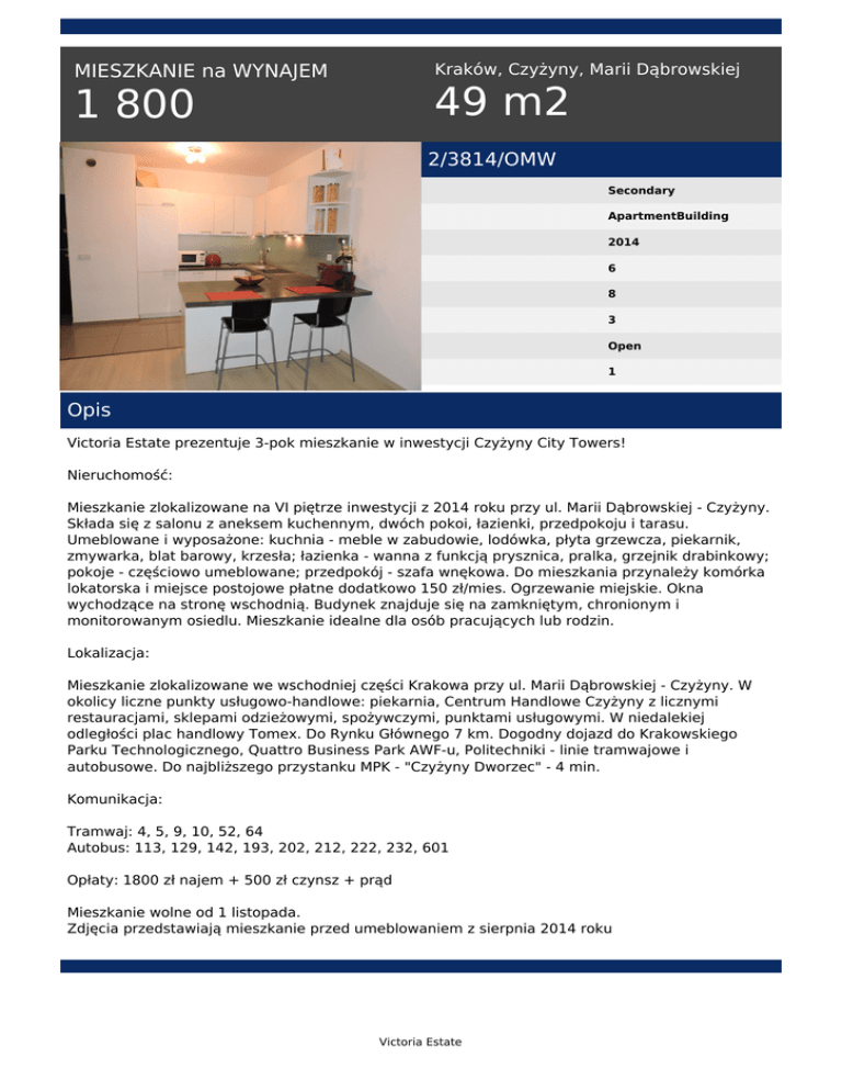 Kraków, Czyżyny, Marii Dąbrowskiej MIESZKANIE na WYNAJEM 49 m2 1 800 2/3814/OMW Secondary ApartmentBuilding 2014 6 8 3 Open 1 Opis Victoria Estate prezentuje 3-pok mieszkanie w inwestycji Czyżyny City Towers! Nieruchomość: Mieszkanie zlokalizowane na VI piętrze inwestycji z 2014 roku przy ul. Marii Dąbrowskiej - Czyżyny. Składa się z salonu z aneksem kuchennym, dwóch pokoi, łazienki, przedpokoju i tarasu. Umeblowane i wyposażone: kuchnia - meble w zabudowie, lodówka, płyta grzewcza, piekarnik, zmywarka, blat barowy, krzesła; łazienka - wanna z funkcją prysznica, pralka, grzejnik drabinkowy; pokoje - częściowo umeblowane; przedpokój - szafa wnękowa. Do mieszkania przynależy komórka lokatorska i miejsce postojowe płatne dodatkowo 150 zł/mies. Ogrzewanie miejskie. Okna wychodzące na stronę wschodnią. Budynek znajduje się na zamkniętym, chronionym i monitorowanym osiedlu. Mieszkanie idealne dla osób pracujących lub rodzin. Lokalizacja: Mieszkanie zlokalizowane we wschodniej części Krakowa przy ul. Marii Dąbrowskiej - Czyżyny. W okolicy liczne punkty usługowo-handlowe: piekarnia, Centrum Handlowe Czyżyny z licznymi restauracjami, sklepami odzieżowymi, spożywczymi, punktami usługowymi. W niedalekiej odległości plac handlowy Tomex. Do Rynku Głównego 7 km. Dogodny dojazd do Krakowskiego Parku Technologicznego, Quattro Business Park AWF-u, Politechniki - linie tramwajowe i autobusowe. Do najbliższego przystanku MPK - "Czyżyny Dworzec" - 4 min. Komunikacja: Tramwaj: 4, 5, 9, 10, 52, 64 Autobus: 113, 129, 142, 193, 202, 212, 222, 232, 601 Opłaty: 1800 zł najem + 500 zł czynsz + prąd Mieszkanie wolne od 1 listopada. Zdjęcia przedstawiają mieszkanie przed umeblowaniem z sierpnia 2014 roku Victoria Estate Małgorzata Wicha tel. +48 511 560 721 email: [email protected] Victoria Estate Powered by TCPDF (www.tcpdf.org)