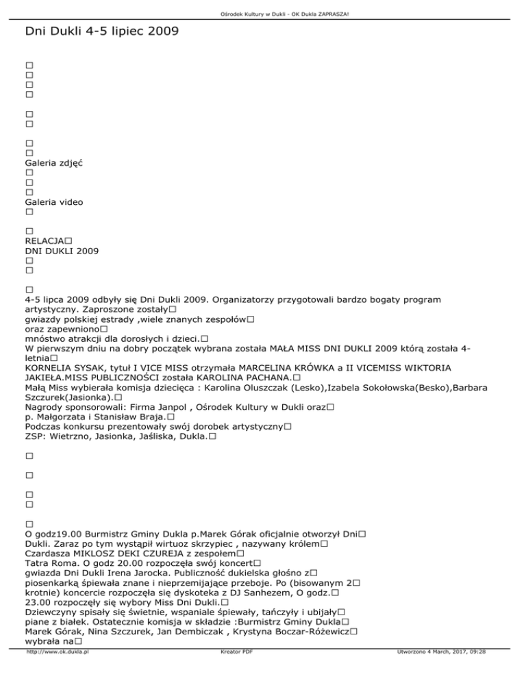 Ośrodek Kultury w Dukli - OK Dukla ZAPRASZA! Dni Dukli 4-5 lipiec 2009 Galeria zdjęć Galeria video RELACJA DNI DUKLI 2009 4-5 lipca 2009 odbyły się Dni Dukli 2009. Organizatorzy przygotowali bardzo bogaty program artystyczny. Zaproszone zostały gwiazdy polskiej estrady ,wiele znanych zespołów oraz zapewniono mnóstwo atrakcji dla dorosłych i dzieci. W pierwszym dniu na dobry początek wybrana została MAŁA MISS DNI DUKLI 2009 którą została 4letnia KORNELIA SYSAK, tytuł I VICE MISS otrzymała MARCELINA KRÓWKA a II VICEMISS WIKTORIA JAKIEŁA.MISS PUBLICZNOŚCI została KAROLINA PACHANA. Małą Miss wybierała komisja dziecięca : Karolina Oluszczak (Lesko),Izabela Sokołowska(Besko),Barbara Szczurek(Jasionka). Nagrody sponsorowali: Firma Janpol , Ośrodek Kultury w Dukli oraz p. Małgorzata i Stanisław Braja. Podczas konkursu prezentowały swój dorobek artystyczny ZSP: Wietrzno, Jasionka, Jaśliska, Dukla. O godz19.00 Burmistrz Gminy Dukla p.Marek Górak oficjalnie otworzył Dni Dukli. Zaraz po tym wystąpił wirtuoz skrzypiec , nazywany królem Czardasza MIKLOSZ DEKI CZUREJA z zespołem Tatra Roma. O godz 20.00 rozpoczęła swój koncert gwiazda Dni Dukli Irena Jarocka. Publiczność dukielska głośno z piosenkarką śpiewała znane i nieprzemijające przeboje. Po (bisowanym 2 krotnie) koncercie rozpoczęła się dyskoteka z DJ Sanhezem, O godz. 23.00 rozpoczęły się wybory Miss Dni Dukli. Dziewczyny spisały się świetnie, wspaniale śpiewały, tańczyły i ubijały piane z białek. Ostatecznie komisja w składzie :Burmistrz Gminy Dukla Marek Górak, Nina Szczurek, Jan Dembiczak , Krystyna Boczar-Różewicz wybrała na http://www.ok.dukla.pl Kreator PDF Utworzono 4 March, 2017, 09:28 Ośrodek Kultury w Dukli - OK Dukla ZAPRASZA! Miss Dni Dukli 2009- GABRIELĘ KARBOWNICZYN. I VICE MISS została DIANA DERENIOWSKA a tytuł MISS PUBLICZNOŚCI otrzymała WIOLETTA MADEJ. Nagrody rzeczowe ufundowali : Ośrodek Kultury w Dukli (kuchenka mikrofalowa, radio-odtwarzacz CD, opiekacz), Salon Kosmetyczny w Dukli p. Sabiny Okońskiej (kosmetyki)oraz Firma ORIFLAME. Po wyborach, licznie przybyła publiczność bawiła się do wczesnych godzin rannych(zdjęcia w naszej galerii) Niedziela rozpoczęła się programem jubileuszowym zespołu „SZAROTKA” a następnie wystąpili „ŁĘCZANIE” , „WIETRZNIANKI” i „RÓWNIANIE”. Po indywidualnych prezentacjach ,zespoły wspólnie odśpiewały piosenkę napisaną specjalnie na tę okazję przez Henryka Kyca. Od godz.17.00 przyszedł czas na turniej sołtysów. Drużyny przygotowały się wspaniale. Walka była zacięta ale przebiegała w atmosferze wesołej zabawy. Ostatecznie sołectwa zajęły miejsca: I - ZAWADKA RYMANOWSKA II - BARWINEK III - TEODORÓWKA IV -IWLA IV - MSZANA Podczas przerw turniejowych, publiczność mogła podziwiać pokaz tańca towarzyskiego w wykonaniu pary tanecznej ALICJI WÓJCIK I WOJCIECHA PIETRUSIA oraz wysłuchać prezentacji wokalistów :DIANY DERENIOWSKIEJ, WIOLETTY MADEJ i TOMASZA SZCZEPANIKA. http://www.ok.dukla.pl Kreator PDF Utworzono 4 March, 2017, 09:28 Ośrodek Kultury w Dukli - OK Dukla ZAPRASZA! Następnie odbył się barwny występ zespołu pieśni i tańca „MAKOVICA” ze Słovacji. Jak zwykle ciepło przyjęty przez dukielską publiczność. O 21.00 rozpoczął się koncert kolejnej gwiazdy Dni Dukli 2009 – zespółu VOX. Licznie zgromadzona publiczność wspaniale bawiła się przy powszechnie znanych utworach zespołu. Na zakończenie Dni Dukli wystąpił egzotyczny zespół „BABYLON” z repertuarem znanej grupy BONEY M. Pogoda i publiczność dopisała. Te Dni Dukli możemy śmiało zapisać do rekordu pod względem frekwencji ,co cieszy nas organizatorów chyba najbardziej a jednocześnie świadczy o tym że ciszą się one coraz większą popularnością. http://www.ok.dukla.pl Kreator PDF Utworzono 4 March, 2017, 09:28
