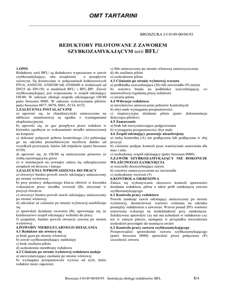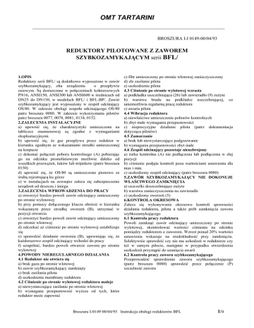OMT TARTARINI BROSZURA I-I 0149-00/04/93 REDUKTORY PILOTOWANE Z ZAWOREM SZYBKOZAMYKAJĄCYM serii BFL/ 1.OPIS Reduktory serii BFL/ są dodatkowo wyposażone w zawór szybkozamykający, oba urządzenia o przepływie osiowym. Są dostarczane w połączeniach kołnierzowych PN16, ANSI150, ANSI300 lub ANSI600 w średnicach od DN25 do DN150, w modelach BFL/ i BFL-BP/. Zawór szybkozamykający jest wyposażony w zespół odcinający OS/80. W zakresie obsługi zespołu odcinającego OS/80 patrz broszura 0080. W zakresie wykorzystania pilotów patrz broszura 0077, 0078, 0081, 0134, 0152. 2.ZALECENIA INSTALACYJNE a) upewnić się, że charakterystyki umieszczone na tabliczce znamionowej są zgodne z wymaganiami eksploatacyjnymi. b) upewnić się, że gaz przepływa przez reduktor w kierunku zgodnym ze wskazaniami strzałki umieszczonej na korpusie c) dokonać połączeń poboru kontrolnego (A) pobierając go na odcinku prostoliniowym możliwie daleko od wszelkich przewężeń, łuków lub trójników (patrz broszura 0150) d) upewnić się, że OS/80 są umieszczone pionowo ze śrubą rejestrującą ku górze e) w instalacjach na zewnątrz zaleca się zabezpieczenie urządzeń od deszczu i śniegu 3.ZALECENIA WPROWADZENIA DO PRACY a) otworzyć bardzo powoli zawór odcinający umieszczony po stronie wylotowej b) przy pomocy dołączonego klucza obrócić w kierunku wskazanym przez strzałkę sworzeń (B), utrzymać w pozycji otwarcia c) otworzyć bardzo powoli zawór odcinający umieszczony po stronie wlotowej d) odczekać aż ciśnienie po stronie wylotowej ustabilizuje się e) sprawdzić działanie sworznia (B), upewniając się, że każdorazowo zespół odcinający wchodzi do pracy f) uzupełnić, bardzo powoli otwarcie zaworu po stronie wylotowej 4.POWODY NIEREGULARNEGO DZIAŁANIA 4.1 Reduktor nie otwiera się a) brak gazu po stronie wlotowej b) zawór szybkozamykający zamknięty c) brak zasilania pilota d) uszkodzenie membrany reduktora 4.2 Ciśnienie po stronie wylotowej reduktora maleje a) niewystarczające zasilanie po stronie wlotowej b) wymagana przepustowość wyższa od tych, które reduktor może zapewnić c) filtr umieszczony po stronie wlotowej zanieczyszczony d) złe zasilanie pilota e) uszkodzenie pilota 4.3 Ciśnienie po stronie wylotowej wzrasta a) podkładka uszczelniająca (26) lub zawieradło (9) zużyte b) warstwa brudu na podkładce uszczelniającej, co uniemożliwia regularną pracę reduktora c) awaria pilota 4.4 Wibracja reduktora a) niewłaściwe umieszczenie poborów kontrolnych b) zbyt małe wymagania przepustowości c) nieprecyzyjne działanie pilota (patrz dokumentacja dotycząca pilotów) 4.5 Zamarzanie a) brak lub niewystarczające podgrzewanie b) wymagania przepustowości zbyt małe 4.6 Zespół odcinający pozostaje nieuzbrojony a) rurka kontrolna (A) nie podłączona lub podłączona w złej pozycji b) ciśnienie podjęte kontroli poza wartościami ustawienia dla max i min. c) uszkodzony zespół odcinający (patrz broszura 0080) 5.ZAWÓR SZYBKOZAMYKAJĄCY NIE DOKONUJE WŁAŚCIWEGO ZAMKNIĘCIA a) uszczelki doszczelniające zużyte b) warstwa zanieczyszczenia na zawieradle c) uszkodzony sworzeń (5) 6.KONTROLA OKRESOWA Zaleca się wykonywanie okresowo kontroli sprawności działania reduktora, pilota a także prób zamknięcia zaworu szybkozamykającego 6.1 Kontrola pracy reduktora Powoli zamknąć zawór odcinający umieszczony po stronie wylotowej, skontrolować wartości ciśnienia na odcinku pomiędzy reduktorem a zaworem. Wzrost ponad 20% wartości ustawienia wskazuje na niedokładność przy zamknięciu. Selektywnie sprawdzić czy nie ma uchodzeń w reduktorze czy też w samym pilocie, następnie w przypadku stwierdzenia uszkodzeń przystąpić do usunięcia awarii 6.2 Kontrola pracy zaworu szybkozamykającego Przeprowadzić sprawdzenie zaworu szybkozamykającego (patrz broszura 0080) sprawdzić przez połączenie (P) szczelność zaworu Broszura I-0149 00/04/93 Instrukcja obsługi reduktorów BFL 1/4 OMT TARTARINI 7.OBSŁUGA 7.1 Wprowadzenie Dla właściwego przeprowadzenia prac niezbędne jest korzystanie z usług osób przeszkolonych. W razie konieczności pytać się w naszym, biurze technicznym lub u osób koncesjonowanych. Przed przystąpieniem do obsługi upewnić się, że wewnątrz korpusu nie znajduje się gaz od ciśnieniem, dlatego należy odciąć dopływ gazu po stronie wlotowej i wylotowej, wypuścić gaz pod ciśnieniem otwierając właściwy kurek spustowy. Zaleca się przy okazji wykonywanej obsługi wymianę wszystkich części gumowych - wykorzystać oryginalne części zapasowe. 7.2 Wymiana podkładki doszczelniającej reduktora a) zdemontować dystans (29) lub odcinek wylotowy b) wykręcić śruby (25) poluzować kołnierz (24) c) zdemontować podkładkę wraz z jej uchwytem (28) wykręcić śrubę (30), następnie wymienić podkładkę (26) i O-RING (27, 32) d) sprawdzić czy powierzchnia doszczelniająca zawieradła jest nieuszkodzona w przeciwnym wypadku dokonać obsługi głównej i wymienić zawieradło e) zamontować wszystkie elementy. Dla ułatwienia montażu podkładki doszczelniającej posługiwać się pompką podłączoną do połączenia (M) 7.3 Obsługa główna a) poluzować wszystkie połączenia i zdemontować reduktor z ciągu b) przed przystąpieniem do demontażu poluzować wszystkie pozycje dla odpowiednich kołnierzy 967 i 24) oraz korpusu (8, 15, 21) zawór szybkozamykający c) wykręcić śruby (68) wyjąć zespół odcinający d) wykręcić śruby (69) zdemontować uchwyt (3), zdemontować SEEGER (4), zdemontować wszystkie elementy, wymienić O-RING (6, 70, 71, 76). Skontrolować łożysko (7) lub (7, 24), wymienić w razie konieczności e) poluzować stopniowo nakrętki (56) utrzymując półkorpusy (67 i 8) skręcone ze sobą, to dla pokonania napięcia wywołanego przez sprężynę f) poluzować półkorpusy (67 i 8), powoli aż do zwolnienia napięcia sprężyny (55) g) zdjąć uchwyt podkładki (66), pie