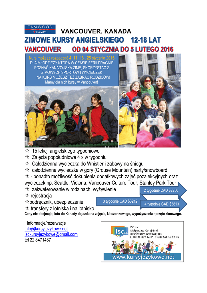 VANCOUVER, KANADA Kurs możesz rozpocząć 4, 11, 18 , 25 stycznia 2016 DLA MŁODZIEŻY KTORA W CZASIE FERII PRAGNIE POZNAĆ KANADYJSKĄ ZIMĘ, SKORZYSTAĆ Z ZIMOWYCH SPORTÓW I WYCIECZEK NA KURS MOŻESZ TEŻ ZABRAĆ RODZICÓW! Mamy dla nich kursy w Vancouver! 15 lekcji angielskiego tygodniowo Zajęcia popołudniowe 4 x w tygodniu Całodzienna wycieczka do Whistler i zabawy na śniegu całodzienna wycieczka w góry (Grouse Mountain) narty/snowboard - ponadto możliwość dokupienia dodatkowych zajęć pozalekcyjnych oraz wycieczek np. Seattle, Victoria, Vancouver Culture Tour, Stanley Park Tour zakwaterowanie w rodzinach, wyżywienie 2 tygodnie CAD $2250 rejestracja 3 tygodnie CAD $3212 podręcznik, ubezpieczenie 4 tygodnie CAD $3813 transfery z lotniska i na lotnisko Ceny nie obejmują: lotu do Kanady dojazdu na zajęcia, kieszonkowego, wypożyczenia sprzętu zimowego. Informacje/rezerwacje [email protected] [email protected] tel 22 8471487