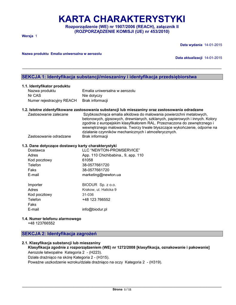 KARTA CHARAKTERYSTYKI Rozporządzenie (WE) nr 1907/2006 (REACH), załącznik II (ROZPORZĄDZENIE KOMISJI (UE) nr 453/2010) Wersja 1 Data wydania 14-01-2015 Nazwa produktu Emalia uniwersalna w aerozolu Data aktualizacji 14-01-2015 _____________________________________________________________________________________________ SEKCJA 1: Identyfikacja substancji/mieszaniny i identyfikacja przedsiębiorstwa 1.1. Identyfikator produktu Nazwa produktu Nr CAS Numer rejestracyjny REACH Emalia uniwersalna w aerozolu Nie dotyczy Brak informacji 1.2. Istotne zidentyfikowane zastosowania substancji lub mieszaniny oraz zastosowania odradzane Zastosowanie zalecane Szybkoschnąca emalia alkidowa do malowania powierzchni metalowych, betonowych, gipsowych, drewnianych, szklanych, papierowych i innych. Kolory zgodnie z europejskim klasyfikatorem RAL. Przeznaczona do zewnętrznego i wewnętrznego malowania. Tworzy trwałe błyszczące wykończenie, odporne na działanie czynników mechanicznych i atmosferycznych. Zastosowanie odradzane Brak informacji 1.3. Dane dotyczące dostawcy karty charakterystyki Dostawca LLC “NEWTON-PROMSERVICE” Adres App. 110 Chichibabina., 9, app. 110 Kod pocztowy 61058 Telefon 38-0577661720 Faks 38-0577661720 E-mail [email protected] Importer Adres Kod pocztowy Telefon Faks E-mail BIODUR Sp. z o.o. Krakow, ul. Halicka 9 31-036 +48 123 766552 [email protected] 1.4. Numer telefonu alarmowego +48 123766552 SEKCJA 2: Identyfikacja zagrożeń 2.1. Klasyfikacja substancji lub mieszaniny Klasyfikacja zgodnie z rozporządzeniem (WE) nr 1272/2008 [klasyfikacja, oznakowanie i pakowanie] Aerozole łatwopalne Kategoria 2 - (H223). Działa drażniąco na skórę Kategoria 2 - (H315). Poważne uszkodzenie wzroku/działa drażniąco na oczy Kategoria 2 - (H319). _____________________________________________________________________________________________ Strona 1 / 11 Nazwa produktu Emalia uniwersalna w aerozolu Data aktualizacji 14-01-2015 Toksyczność szczególna na organ docelowy (pojedyncze narażenie Kategoria 3 - (H336). Klasyfikacja zgodnie z Dyrektywą 67/548/EEC lub 1999/45/EC Xi; R36 R67 Xi; R38 2.2. Elementy oznakowania Symbole/piktogramy Słowo sygnalizujące Zwroty H Ostrzeżenie H223 - Aerozol łatwopalny. H315 - Działa drażniąco na skórę. H319 - Działa silnie drażniąco na oczy. H336 - Może wywoływać uczucie senności lub zawroty głowy. P261 - Unikać wdychania pyłu/dymu/gazu/mgły/par/rozpylonej cieczy. P271 - Stosować wyłącznie na zewnątrz lub w dobrze wentylowanym pomieszczeniu. P280 - Stosować rękawice ochronne/odzież ochronną/ochronę oczu/ochronę twarzy. P210 - Przechowywać z dala od źródeł ciepła/iskrzenia/otwartego ognia/gorących powierzchni. - Palenie wzbronione. P211 - Nie rozpylać nad otwartym ogniem lub innym źródłem zapłonu. P251 - Pojemnik pod ciśnieniem. Nie przekłuwać ani nie spalać, nawet po zużyciu. P305 + P351 + P338 - W PRZYPADKU DOSTANIA SIĘ DO OCZU: Ostrożnie płukać wodą przez kilka minut. Wyjąć soczewki kontaktowe, jeżeli są i można je łatwo usunąć. Kontynuować płukanie. P405 - Przechowywać pod zamknięciem. P410 + P412 - Chronić przed światłem słonecznym. Nie wystawiać na działanie temperatury przekraczającej 50 °C/ 122°F. P501 - Zawartość/ pojemnik usuwać do autoryzowanego zakładu utylizacji odpadów. Zwroty P 2.3. Inne zagrożenia Brak informacji SEKCJA 3: Skład/informacja o składnikach 3.1 Mieszanina Nazwa chemiczna Nr EC Nr CAS Masa-% Klasyfikacja zgodnie z Dyrektywą 67/548/EEC lub 1999/45/EC Butan 203-448-7 106-97-8 16-40 F+; R12 Propan 200-827-9 74-98-6 4-10 F+; R12 Emalia alkidowa - - 20-35 R10 Xi; R38 Klasyfikacja zgodnie z rozporządzeniem (WE) nr 1272/2008 [klasyfikacja, oznakowanie i pakowanie] Gaz łatwopalny 1 (H220) Gaz pod ciśnieniem Gaz łatwopalny 1 (H220) Gaz pod ciśnieniem Ciecz łatwopalna 3 (H226) Drażniąca dla skóry 2 (H315) _____________________________________________________________________________________________ Strona 2 / 11 Nazwa produktu Emalia uniwersalna w aerozolu Data aktualizacji 14-01-2015 Octan metylu 201-185-2 79-20-9 16.5-24.75 Octan etylu 205-500-4 141-78-6 9-13.5 Octan butylu 204-658-1 123-86-4 4.5-6.75 F; R11 Xi; R36 R66 R67 F; R11 Xi; R36 R66 R67 R10 R66 R67 Drażniący dla oczu 2 (H319) (EUH066) STOT SE 3 (H336) Ciecz łatwopalna 2 (H225) Drażniący dla oczu 2 (H319) (EUH066) STOT SE 3 (H336) Ciecz łatwopalna 2 (H225) (EUH066) STOT SE 3 (H336) Ciecz łatwopalna 3 (H226) SEKCJA 4: Środki pierwszej pomocy 4.1. Opis środków pierwszej pomocy Zalecenia ogólne Zdjąć zanieczyszczoną odzież i obuwie. Jeśli symptomy nie ustępują to wezwać lekarza. Wdychanie JEŚLI ZOSTANIE WCHŁONIĘTY PRZEZ WDYCHANIE: Przenieść ofiarę na świeże powietrze i pozwolić odpoczywać w pozycji wygodnej do oddychania. W przypadku złego samopoczucia zasięgnąć porady lekarskiej. Kontakt ze skórą Natychmiast umyć mydłem i dużą ilością wody oraz zdjąć zanieczyszczoną odzież i obuwie. Przed ponownym użyciem zanieczyszczonej odzieży należy ją wyprać. Jeśli podrażnienie skóry nie ustępuje to wezwać lekarza. Kontakt z oczami W PRZYPADKU DOSTANIA SIĘ DO OCZU: Przez kilka minut ostrożnie płukać wodą. Zdjąć soczewki kontaktowe, jeśli są i łatwo to zrobić. Kontynuować płukanie. Jeśli podrażnienie oczu nie ustępuje: Zasięgnąć porady lekarskiej. Spożycie Przepłukać usta. Zasięgnąć porady lekarskiej. Nigdy nie podawać nic doustnie osobie nieprzytomnej. 4.2. Najważniejsze ostre i opóźnione objawy oraz skutki narażenia Brak informacji 4.3. Wskazania dotyczące wszelkiej natychmiastowej pomocy lekarskiej i szczególnego postępowania z poszkodowanym Leczyć objawowo. SEKCJA 5: Postępowanie w przypadku pożaru 5.1. Środki gaśnicze Odpowiednie środki gaśnicze Nieodpowiednie środki gaśnicze CO2 lub suche środki chemiczne. Brak informacji 5.2. Szczególne zagrożenia związane z substancją lub mieszaniną Roz