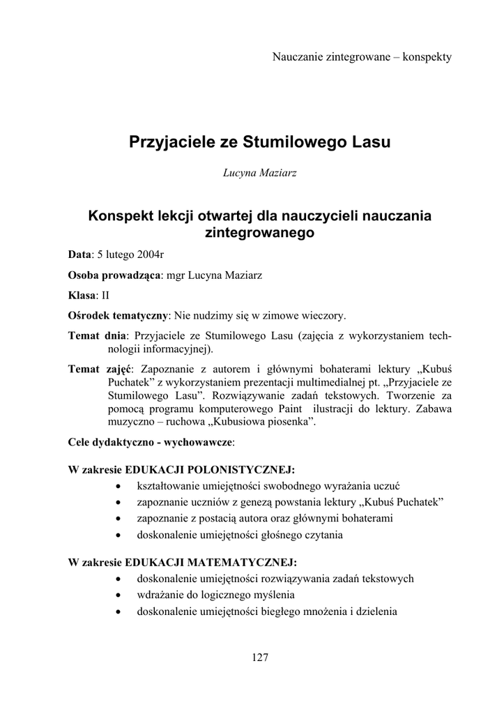 Nauczanie zintegrowane – konspekty Przyjaciele ze Stumilowego Lasu Lucyna Maziarz Konspekt lekcji otwartej dla nauczycieli nauczania zintegrowanego Data: 5 lutego 2004r Osoba prowadząca: mgr Lucyna Maziarz Klasa: II Ośrodek tematyczny: Nie nudzimy się w zimowe wieczory. Temat dnia: Przyjaciele ze Stumilowego Lasu (zajęcia z wykorzystaniem technologii informacyjnej). Temat zajęć: Zapoznanie z autorem i głównymi bohaterami lektury „Kubuś Puchatek” z wykorzystaniem prezentacji multimedialnej pt. „Przyjaciele ze Stumilowego Lasu”. Rozwiązywanie zadań tekstowych. Tworzenie za pomocą programu komputerowego Paint ilustracji do lektury. Zabawa muzyczno – ruchowa „Kubusiowa piosenka”. Cele dydaktyczno - wychowawcze: W zakresie EDUKACJI POLONISTYCZNEJ: • kształtowanie umiejętności swobodnego wyrażania uczuć • zapoznanie uczniów z genezą powstania lektury „Kubuś Puchatek” • zapoznanie z postacią autora oraz głównymi bohaterami • doskonalenie umiejętności głośnego czytania W zakresie EDUKACJI MATEMATYCZNEJ: • doskonalenie umiejętności rozwiązywania zadań tekstowych • wdrażanie do logicznego myślenia • doskonalenie umiejętności biegłego mnożenia i dzielenia 127 Lucyna Maziarz – Przyjaciele ze Stumilowego Lasu W zakresie EDUKACJI TECHNICZNO – INFORMATYCZNEJ: • doskonalenie umiejętności posługiwania się komputerem • higiena i bezpieczeństwo pracy z komputerem • estetyka dobierania kolorów i tworzenia ilustracji w programie komputerowym Paint W zakresie EDUKACJI MUZYCZNO – RUCHOWEJ: • utrwalenie słów i melodii utworu muzycznego „Kubusiowa piosenka” • wykorzystanie ruchu podczas śpiewu piosenki Metody: a) b) c) d) e) f) Pogadanka Pokaz Ćwiczenia praktyczne Obserwacja Bezpośrednia praca z komputerem Stymulowanie aktywności twórczej Formy pracy: zbiorowa, indywidualna Środki dydaktyczne: maskotki, pluszowa postać Kubusia Puchatka, lektura „Kubuś Puchatek” i inne książki autorstwa A.A. Milne, urządzenia technologii informacyjnej: komputery, prezentacja multimedialna pt. „Przyjaciele ze Stumilowego Lasu” własnego autorstwa, treść zadania tekstowego (zadanie domowe) Przebieg zajęć: 1. Wprowadzenie do tematyki zajęć – przedstawianie swoich przyjaciół maskotek. Dzieci siedzą w kole na dywanie, trzymają w ręku ulubioną maskotkę przyniesioną z domu. Przedstawiają swoje pluszaki i krótko o nich opowiadają. 2. Przedstawienie postaci Kubusia Puchatka. Nauczyciel przedstawia dzieciom pluszową postać bohatera zajęć, krótko przybliża historię powstania książki „Kubuś Puchatek” i innych pozycji autorstwa A.A. Milne. 3. Przedstawienie postaci autora i głównych bohaterów lektury przy wykorzystaniu prezentacji multimedialnej „Przyjaciele ze Stumilowego Lasu”. 128 CKPiDN w Mielcu – Zeszyty nauczycielskie – Nr3/2005 Dzieci zajmują miejsca przy stanowiskach komputerowych, oglądają prezentację, głośno odczytują informacje o poszczególnych postaciach. 4. Przerwa śródlekcyjna: z wykorzystaniem ruchu. śpiewanie „Kubusiowej piosenki” 5. Rozwiązywanie matematycznych zadań z Kubusiem. Treść zadań znajduje się w prezentacji multimedialnej, uczniowie odczytują treść zadania, wspólnie dokonują jego analizy, rozwiązują wybierając prawidłową odpowiedź (dzieci klikają na guziku z prawidłową odpowiedzią, mogą również spróbować co się stanie jeżeli klikną na błędnej odpowiedzi). 6. Kolorowanie postaci z lektury „Kubuś Puchatek” wykorzystując program komputerowy Paint. Dzieci wybierają jedną ilustrację do lektury znajdującą się w prezentacji multimedialnej i kolorują ją. Mogą również sami dorysowywać elementy za pomocą dostępnych w programie Paint narzędzi. 7. Podsumowanie zajęć i ocena aktywności uczniów. Pytania do uczniów: Dlaczego Kubuś Puchatek stał się bohaterem książki? Czy potraficie wymienić innych bohaterów lektury? Czy podobały wam się dzisiejsze zajęcia, co wam się wam najbardziej podobało? W nagrodę za aktywność w lekcji uczniowie otrzymują znaczki z postacią Kubusia Puchatka. 8. Zadanie pracy domowej. Uczniowie dostają kartki z treścią zadania domowego. 129