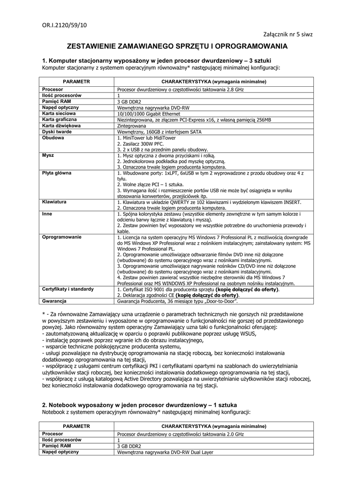 OR.I.2120/59/10 Załącznik nr 5 siwz ZESTAWIENIE ZAMAWIANEGO SPRZĘTU I OPROGRAMOWANIA 1. Komputer stacjonarny wyposaŜony w jeden procesor dwurdzeniowy – 3 sztuki Komputer stacjonarny z systemem operacyjnym równowaŜny* następującej minimalnej konfiguracji: PARAMETR Procesor Ilość procesorów Pamięć RAM Napęd optyczny Karta sieciowa Karta graficzna Karta dźwiękowa Dyski twarde Obudowa Mysz Płyta główna Klawiatura Inne Oprogramowanie Certyfikaty i standardy Gwarancja CHARAKTERYSTYKA (wymagania minimalne) Procesor dwurdzeniowy o częstotliwości taktowania 2.8 GHz 1 3 GB DDR2 Wewnętrzna nagrywarka DVD-RW 10/100/1000 Gigabit Ethernet Niezintegrowana, ze złączem PCI-Express x16, z własną pamięcią 256MB Zintegrowana Wewnętrzny, 160GB z interfejsem SATA 1. MiniTower lub MidiTower 2. Zasilacz 300W PFC. 3. 2 x USB z na przednim panelu obudowy. 1. Mysz optyczna z dwoma przyciskami i rolką. 2. Jednokolorowa podkładka pod myszkę optyczną. 3. Oznaczona trwale logiem producenta komputera. 1. Wbudowane porty: 1xLPT, 6xUSB w tym 2 wyprowadzone z przodu obudowy oraz 4 z tyłu. 2. Wolne złącze PCI – 1 sztuka. 3. Wymagana ilość i rozmieszczenie portów USB nie moŜe być osiągnięta w wyniku stosowania konwerterów, przejściówek itp. 1. Klawiatura w układzie QWERTY ze 102 klawiszami i wydzielonym klawiszem INSERT. 2. Oznaczona trwale logiem producenta komputera. 1. Spójna kolorystyka zestawu (wszystkie elementy zewnętrzne w tym samym kolorze i odcieniu barwy łącznie z klawiaturą i myszą). 2. Zestaw powinien być wyposaŜony we wszystkie potrzebne do uruchomienia przewody i kable. 1. Licencja na system operacyjny MS Windows 7 Professional PL z moŜliwością downgrade do MS Windows XP Professional wraz z nośnikiem instalacyjnym; zainstalowany system: MS Windows 7 Professional PL. 2. Oprogramowanie umoŜliwiające odtwarzanie filmów DVD inne niŜ dołączone (wbudowane) do systemu operacyjnego wraz z nośnikami instalacyjnymi. 3. Oprogramowanie umoŜliwiające nagrywanie nośników CD/DVD inne niŜ dołączone (wbudowane) do systemu operacyjnego wraz z nośnikami instalacyjnymi. 4. Zestaw powinien zawierać wszystkie niezbędne sterowniki dla MS Windows 7 Professional oraz MS WINDOWS XP Professional na osobnym nośniku instalacyjnym. 1. Certyfikat ISO 9001 dla producenta sprzętu (kopię dołączyć do oferty). 2. Deklaracja zgodności CE (kopię dołączyć do oferty). Gwarancja Producenta, 36 miesiące typu „Door-to-Door”. * - Za równowaŜne Zamawiający uzna urządzenie o parametrach technicznych nie gorszych niŜ przedstawione w powyŜszym zestawieniu i wyposaŜone w oprogramowanie o funkcjonalności nie gorszej od przedstawionego powyŜej. Jako równowaŜny system operacyjny Zamawiający uzna taki o funkcjonalności oferującej: - zautomatyzowaną aktualizację w oparciu o poprawki publikowane poprzez usługę WSUS, - instalację poprawek poprzez wgranie ich do obrazu instalacyjnego, - wsparcie techniczne polskojęzyczne producenta systemu, - usługi pozwalające na dystrybucję oprogramowania na stację roboczą, bez konieczności instalowania dodatkowego oprogramowania na tej stacji, - współpracę z usługami centrum certyfikacji PKI i certyfikatami opartymi na szablonach do uwierzytelniania uŜytkowników stacji roboczej, bez konieczności instalowania dodatkowego oprogramowania na tej stacji, - współpracę z usługą katalogową Active Directory pozwalająca na uwierzytelnianie uŜytkowników stacji roboczej, bez konieczności instalowania dodatkowego oprogramowania na tej stacji. 2. Notebook wyposaŜony w jeden procesor dwurdzeniowy – 1 sztuka Notebook z systemem operacyjnym równowaŜny* następującej minimalnej konfiguracji: PARAMETR Procesor Ilość procesorów Pamięć RAM Napęd optyczny CHARAKTERYSTYKA (wymagania minimalne) Procesor dwurdzeniowy o częstotliwości taktowania 2.0 GHz 1 3 GB DDR2 Wewnętrzna nagrywarka DVD-RW Dual Layer OR.I.2120/59/10 Załącznik nr 5 siwz Karta graficzna Karta dźwiękowa Dyski twarde Przekątna ekranu Nominalna rozdzielczość ekranu Komunikacja WiFi Interfejsy Czytnik kart pamięci Urządzenie wskazujące Oprogramowanie Inne Certyfikaty i standardy Gwarancja Zintegrowana, z pamięcią przydzielaną dynamicznie Zintegrowana, głośniki wbudowane 160GB z interfejsem SATA 15,6 cala 1366x768 pikseli 1 x 10/100/1000BaseT Gigabitethernet Tak, IEEE 802.11 a/b/g/n z dedykowanym przełącznikiem do uruchamiania modułu WLAN umieszczonym na obudowie notebooka 3 x USB 2.0, 1 x 15-stykowe D-Sub, 1 x RJ45 Tak, wbudowany w obudowę, odczyt standardów kart: Secure Digital, Multimedia Card Touchpad 1. Licencja na system operacyjny MS Windows 7 Professional PL z moŜliwością downgrade do MS Windows XP Professional wraz z nośnikiem instalacyjnym; zainstalowany system: MS Windows 7 Professional PL. 2. Oprogramowanie umoŜliwiające odtwarzanie filmów DVD inne niŜ dołączone (wbudowane) do systemu operacyjnego wraz z nośnikami instalacyjnymi. 3. Oprogramowanie umoŜliwiające nagrywanie nośników CD/DVD inne niŜ dołączone (wbudowane) do systemu operacyjnego wraz z nośnikami instalacyjnymi. 4. Zestaw powinien zawierać wszystkie niezbędne sterowniki dla MS Windows 7 Professional oraz MS WINDOWS XP Professional na osobnym nośniku instalacyjnym. 1. Zasilacz sieciowy w zestawie, napięcie zasilania 230V. 1. Certyfikat ISO 9001 dla producenta sprzętu (kopię dołączyć do oferty). 2. Deklaracja zgodności CE (kopię dołączyć do oferty). Gwarancja Producenta, 24 miesięce * - Za równowaŜne urządzenie Zamawiający uzna urządzenie o parametrach technicznych nie gorszych niŜ przedstawione w powyŜszym zestawieniu i wyposaŜone w oprogramowanie o funkcjonalności nie gorszej od przedstawionego powyŜej. Jako równowaŜny system operacyjny Zamawiający uzna taki o funkcjonalności oferującej: - zautomatyzowaną aktualizację w oparciu o poprawki publikowane poprzez usługę WSUS, - instalację poprawek 