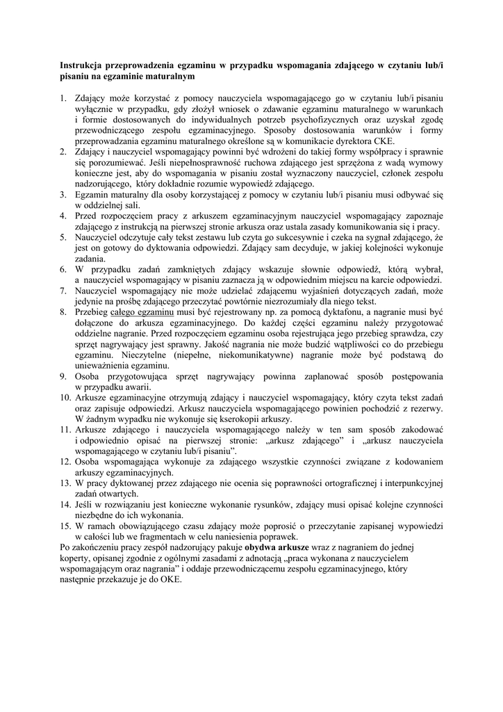 Instrukcja przeprowadzenia egzaminu w przypadku wspomagania zdającego w czytaniu lub/i pisaniu na egzaminie maturalnym 1. Zdający moŜe korzystać z pomocy nauczyciela wspomagającego go w czytaniu lub/i pisaniu wyłącznie w przypadku, gdy złoŜył wniosek o zdawanie egzaminu maturalnego w warunkach i formie dostosowanych do indywidualnych potrzeb psychofizycznych oraz uzyskał zgodę przewodniczącego zespołu egzaminacyjnego. Sposoby dostosowania warunków i formy przeprowadzania egzaminu maturalnego określone są w komunikacie dyrektora CKE. 2. Zdający i nauczyciel wspomagający powinni być wdroŜeni do takiej formy współpracy i sprawnie się porozumiewać. Jeśli niepełnosprawność ruchowa zdającego jest sprzęŜona z wadą wymowy konieczne jest, aby do wspomagania w pisaniu został wyznaczony nauczyciel, członek zespołu nadzorującego, który dokładnie rozumie wypowiedź zdającego. 3. Egzamin maturalny dla osoby korzystającej z pomocy w czytaniu lub/i pisaniu musi odbywać się w oddzielnej sali. 4. Przed rozpoczęciem pracy z arkuszem egzaminacyjnym nauczyciel wspomagający zapoznaje zdającego z instrukcją na pierwszej stronie arkusza oraz ustala zasady komunikowania się i pracy. 5. Nauczyciel odczytuje cały tekst zestawu lub czyta go sukcesywnie i czeka na sygnał zdającego, Ŝe jest on gotowy do dyktowania odpowiedzi. Zdający sam decyduje, w jakiej kolejności wykonuje zadania. 6. W przypadku zadań zamkniętych zdający wskazuje słownie odpowiedź, którą wybrał, a nauczyciel wspomagający w pisaniu zaznacza ją w odpowiednim miejscu na karcie odpowiedzi. 7. Nauczyciel wspomagający nie moŜe udzielać zdającemu wyjaśnień dotyczących zadań, moŜe jedynie na prośbę zdającego przeczytać powtórnie niezrozumiały dla niego tekst. 8. Przebieg całego egzaminu musi być rejestrowany np. za pomocą dyktafonu, a nagranie musi być dołączone do arkusza egzaminacyjnego. Do kaŜdej części egzaminu naleŜy przygotować oddzielne nagranie. Przed rozpoczęciem egzaminu osoba rejestrująca jego przebieg sprawdza, czy sprzęt nagrywający jest sprawny. Jakość nagrania nie moŜe budzić wątpliwości co do przebiegu egzaminu. Nieczytelne (niepełne, niekomunikatywne) nagranie moŜe być podstawą do uniewaŜnienia egzaminu. 9. Osoba przygotowująca sprzęt nagrywający powinna zaplanować sposób postępowania w przypadku awarii. 10. Arkusze egzaminacyjne otrzymują zdający i nauczyciel wspomagający, który czyta tekst zadań oraz zapisuje odpowiedzi. Arkusz nauczyciela wspomagającego powinien pochodzić z rezerwy. W Ŝadnym wypadku nie wykonuje się kserokopii arkuszy. 11. Arkusze zdającego i nauczyciela wspomagającego naleŜy w ten sam sposób zakodować i odpowiednio opisać na pierwszej stronie: „arkusz zdającego” i „arkusz nauczyciela wspomagającego w czytaniu lub/i pisaniu”. 12. Osoba wspomagająca wykonuje za zdającego wszystkie czynności związane z kodowaniem arkuszy egzaminacyjnych. 13. W pracy dyktowanej przez zdającego nie ocenia się poprawności ortograficznej i interpunkcyjnej zadań otwartych. 14. Jeśli w rozwiązaniu jest konieczne wykonanie rysunków, zdający musi opisać kolejne czynności niezbędne do ich wykonania. 15. W ramach obowiązującego czasu zdający moŜe poprosić o przeczytanie zapisanej wypowiedzi w całości lub we fragmentach w celu naniesienia poprawek. Po zakończeniu pracy zespół nadzorujący pakuje obydwa arkusze wraz z nagraniem do jednej koperty, opisanej zgodnie z ogólnymi zasadami z adnotacją „praca wykonana z nauczycielem wspomagającym oraz nagrania” i oddaje przewodniczącemu zespołu egzaminacyjnego, który następnie przekazuje je do OKE.