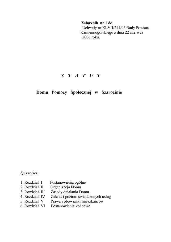 Załącznik nr 1 do Uchwały nr XLVII/211/06 Rady Powiatu Kamiennogórskiego z dnia 22 czerwca 2006 roku. S T A T U T Domu Pomocy Społecznej w Szarocinie Spis treści: 1. Rozdział 2. Rozdział 3. Rozdział 4. Rozdział 5. Rozdział 6. Rozdział I II III IV V VI Postanowienia ogólne Organizacja Domu Zasady działania Domu Zakres i poziom świadczonych usług Prawa i obowiązki mieszkańców Postanowienia końcowe ROZDZIAŁ I POSTANOWIENIA OGÓLNE §1 1. Dom Pomocy Społecznej w Szarocinie zwany dalej „Domem” jest samodzielną jednostką organizacyjną pomocy społecznej powiatu kamiennogórskiego. 2. Dom zapewnia całodobową opiekę oraz świadczy usługi bytowe, wspomagające i edukacyjne na poziomie obowiązującego standardu, w zakresie i formach wynikających z indywidualnych potrzeb osób w nim przebywających, zwanych dalej „mieszkańcami domu”. Dom umożliwia i organizuje mieszkańcom pomoc w korzystaniu ze świadczeń zdrowotnych. 3. Główną siedzibą Domu jest: 1/ wieś Szarocin na terenie gminy Kamienna Góra, 2/ filia - miasto Kamienna Góra. §2 Dom Pomocy Społecznej w Szarocinie jest Domem 1/ stałego pobytu 2/ dla osób niepełnosprawnych intelektualnie kobiet i mężczyzn. 3/ posiadającym 139 miejsc. §3 Dom działa na podstawie: 1/ ustawy z dnia 12 marca 2004 roku o pomocy społecznej (Dz.U. z 2004 r Nr 64 poz. 593 z późn. zm.), 2/ ustawy z dnia 30 czerwca 2005 roku o finansach publicznych (Dz.U. z 2005 roku Nr 249 poz. 2104 z późn. zm.), 3/ rozporządzenia Ministra Polityki Społecznej z dnia 19 października 2005 roku w sprawie domów pomocy społecznej (Dz.U z 2005 roku Nr 217 poz. 1837 z późn. zm.), 4/ innych obowiązujących w prowadzeniu Domu aktów prawnych, 5/ niniejszego statutu, 6/ regulaminu organizacyjnego Domu. §4 Dom położony jest: 1/ w Szarocinie na gruncie zabudowanym stanowiącym działkę Nr 136, 145/2, 309, 312 o powierzchni 5,03 ha znajdującym się w Szarocinie 1 dla którego Sąd Rejonowy w Kamiennej Górze prowadzi księgę wieczystą Nr 13329, 2/ w Kamiennej Górze na gruncie zabudowanym, stanowiącym działkę Nr 482 o powierzchni49,71 arów znajdującym się przy ulicy Armii Ludowej 5, dla którego Sąd Rejonowy w Kamiennej Górze prowadzi księgę wieczystą Nr 6338. §5 1. Dom jest zorganizowany w formie jednostki budżetowej. 2. Dom prowadzi samodzielną gospodarkę finansową zgodnie z obowiązującymi przepisami. 3. Środki finansowe gromadzone są na odrębnym rachunku bankowym. 4. Podstawą gospodarki finansowej Domu jest roczny plan finansowy. ROZDZIAŁ II ORGANIZACJA DOMU §6 Ilekroć w statucie jest mowa o: 1. DPS – należy przez to rozumieć Dom Pomocy Społecznej w Szarocinie i filię w Kamiennej Górze. 2. Staroście – należy przez to rozumieć Starostę Powiatu Kamiennogórskiego. 3. Zarządzie – należy przez to rozumieć Zarząd Powiatu Kamiennogórskiego. 4. Starostwie – należy przez to rozumieć Starostwo powiatu Kamiennogórskiego. 5. Dyrektorze – należy przez to rozumieć Dyrektora Domu Pomocy Społecznej. 6. Komórce organizacyjnej – należy przez to rozumieć dział, sekcję lub samodzielne stanowisko pracy w Domu Pomocy Społecznej. §7 W celu realizacji zadań DPS współdziała z organizacjami administracji samorządowej. §8 Domem Pomocy Społecznej kieruje oraz reprezentuje na zewnątrz Dyrektor zgodnie z zasadą jednoosobowego kierownictwa i ponosi odpowiedzialność przed Starostą. 1. Dyrektora DPS zatrudnia Zarząd. 2. Dyrektor DPS w stosunku do pracowników jest pracodawcą w rozumieniu przepisów Kodeksu pracy. 3. Dyrektor kieruje działalnością jednostki przy pomocy Z-cy Dyrektora, Głównego Księgowego i Kierowników działów. 4. Podczas nieobecności Dyrektora DPS kierownictwo pełni osoba przez niego upoważniona. §9 Komórki organizacyjne w Domu Pomocy Społecznej w Szarocinie. 1. W DPS tworzy się następujące komórki organizacyjne: A/ dział, B/ samodzielne stanowiska pracy. § 10 1. Dział jest komórką organizacyjną, zajmującą się określoną problematyką w sposób kompleksowy lub kilkoma zagadnieniami, których realizację w jednej komórce organizacyjnej ułatwia prawidłowe zarządzanie. 2. Działem kieruje Kierownik. 3. Samodzielne stanowisko pracy jest komórką organizacyjną, którą tworzy się w wypadku konieczności organizacyjnego wyodrębnienia określonej problematyki nie uzasadniającego powołania większej komórki organizacyjnej. Samodzielne stanowisko pracy tworzy się jako komórkę samodzielną. § 11 Struktura Domu Pomocy Społecznej. 1. W DPS tworzy się następujące komórki organizacyjne – działy, które podlegają Dyrektorowi: A/ Dział opiekuńczo – terapeutyczny. B/ Dział gospodarczy. C/ Dział żywienia. D/ Dział finansowo – księgowy E/ Samodzielne stanowiska - administracyjno – kadrowe, - kapelana, - starszy insp. ds. bhp i ppoż. - zamówień publicznych i pozyskiwania środków unijnych § 12 Kierownicy działów organizują i nadzorują pracę podległych im pracowników. § 13 Kontrolę wewnętrzną w Domu sprawuje dyrektor, główny księgowy i kierownicy działów. § 14 Szczegółową organizację i działanie Domu określa regulamin organizacyjny ustalony przez Dyrektora Domu. ROZDZIAŁ III ZASADY DZIAŁANIA DOMU § 15 Działalność Domu opiera się na następujących zasadach działania: 1/zasada poszanowania godności, intymności i samodzielności mieszkańców oraz ich przekonań religijnych, 2/zasada troski o rozwój osobowości i w miarę możliwości samodzielności mieszkańców, 3/zasada zapewnienia bezpieczeństwa i spokoju mieszkańców, 4/zasada uwzględniania fizycznej i psychicznej sprawności mieszkańców przy egzekwowaniu ich obowiązków, 5/zasada poszanowania prawa do utrzymania i rozwoju kontaktów z rodziną i środowiskiem lokalnym, 6/zasada rozwijania aktywności mieszkańców, udziału w zajęciach sportowych i rekreacyjnych oraz terapii zajęciowej, 7/zasada poszanowania prawa do