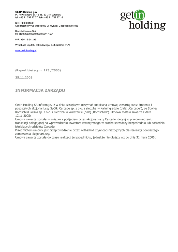 GETIN Holding S.A. Pl. Powstańców Śl. 16-18, 53-314 Wrocław tel. +48 71 797 77 77, faks +48 71 797 77 16 KRS 0000004335 Sąd Rejonowy we Wrocławiu VI Wydział Gospodarczy KRS Bank Millenium S.A. 91 1160 2202 0000 0000 6011 1521 NIP: 895-16-94-236 Wysokość kapitału zakładowego: 644.923.258 PLN www.getinholding.pl (Raport bieżący nr 123 /2005) 25.11.2005 INFORMACJA ZARZĄDU Getin Holding SA informuje, iż w dniu dzisiejszym otrzymał podpisaną umowę, zawartą przez Emitenta i pozostałych akcjonariuszy Spółki Carcade sp. z o.o. z siedzibą w Kaliningradzie (dalej „Carcade”), ze Spółką Rothschild Polska sp. z o.o. z siedziba w Warszawie (dalej „Rothschild”). Umowa została zawarta z data 17.11.2005r. Umowa zawarta została w związku z podjęciem przez akcjonariuszy Carcade, decyzji o przeprowadzeniu transakcji polegającej na wprowadzeniu inwestora zewnętrznego w drodze sprzedaży bezpośrednio lub pośrednio istniejących udziałów Carcade. Przedmiotem umowy jest przeprowadzenie przez Rothschild czynności niezbędnych dla realizacji powyższego zamierzenia akcjonariuszy. Umowa zawarta została do czasu realizacji jej przedmiotu, jednakże nie dłuższy niż do dnia 31 maja 2006r.
