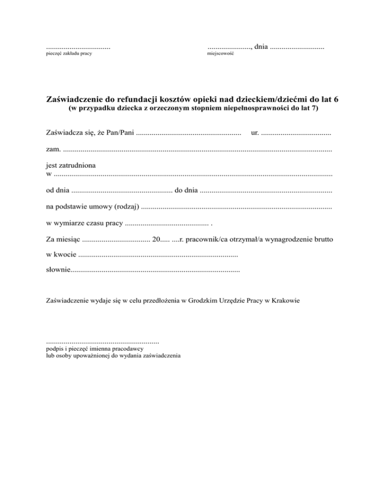 ................................. ......................, dnia ............................ pieczęć zakładu pracy miejscowość Zaświadczenie do refundacji kosztów opieki nad dzieckiem/dziećmi do lat 6 (w przypadku dziecka z orzeczonym stopniem niepełnosprawności do lat 7) Zaświadcza się, że Pan/Pani ...................................................... ur. .................................... zam. .......................................................................................................................................... jest zatrudniona w ............................................................................................................................................... od dnia .................................................... do dnia .................................................................... na podstawie umowy (rodzaj) .................................................................................................. w wymiarze czasu pracy ........................................... . Za miesiąc ................................... 20..... ....r. pracownik/ca otrzymał/a wynagrodzenie brutto w kwocie .................................................................................. słownie....................................................................................... Zaświadczenie wydaje się w celu przedłożenia w Grodzkim Urzędzie Pracy w Krakowie .......................................................... podpis i pieczęć imienna pracodawcy lub osoby upoważnionej do wydania zaświadczenia