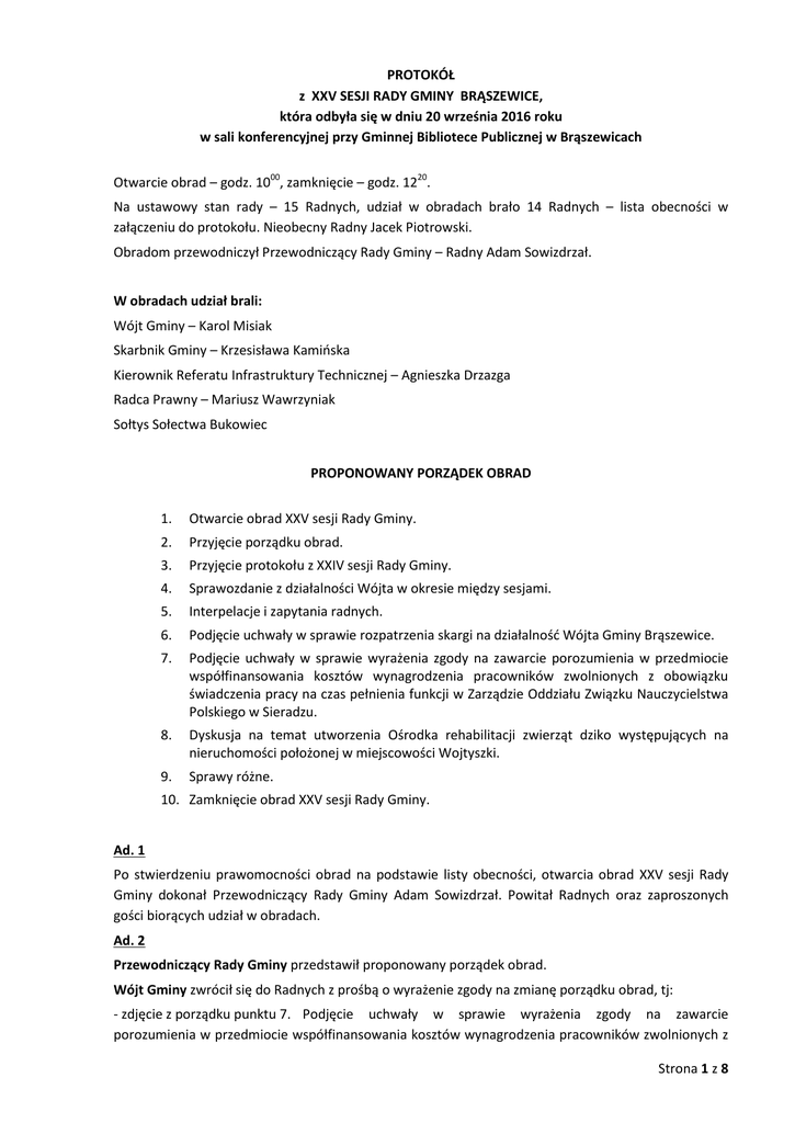 Strona 1 z 8 PROTOKÓŁ z XXV SESJI RADY GMINY BRĄSZEWICE