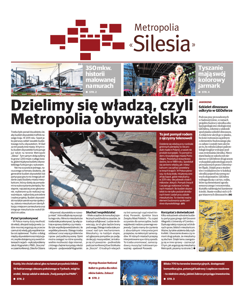 350mkw. historii malowanej namurach Tyszanie mają swój kolorowy jarmark a STR. 2 a STR. 4 Dzielimy się władzą, czyli Metropolia obywatelska Trzeba było ponad dwudziestu lat, aby budżet obywatelski trafił donaszego kraju. W 2011 roku Sopot jako pierwszy oddał kawałek budżetowego tortu obywatelom. W ślad zanimposzłyinnemiasta.Wtymroku budżet obywatelski funkcjonuje już także na terenie Metropolii „Silesia”. Tym samym dołączyliśmy to grona 1.200 miast z całego świata,gdzieinicjatywabudżetuobywatelskiego funkcjonuje z sukcesem. Nie ma oczywiście jednego, narzuconego schematu działania, ale generalnie budżet obywatelski lub partycypacyjnytonicinnegojakoddanie części budżetu miasta mieszkańcom, którzy dzielą się pomysłami na wykorzystanie pieniędzy. Następnie, najczęściej przez głosowanie, wybierane są do realizacji najważniejsze, najbardziej potrzebne i realne projekty. Budżet obywatelskimatakżeszerokiwymiarspołeczny, ułatwia mieszkańcom identyfikację z miejscem zamieszkania oraz integruje mieszkańców wokół bliskich im celów. Pytać i przekonywać – W Polsce mamy dużą nieufność dowładz,silnajesttradycjaweta.Ludzie mocniej angażują się przeciw czemuśniżwtedy,gdywspólnietrzeba coś zaplanować. Trudno o dialog międzyobywatelamiorazinstytucjami,zwykleobstajemyprzyswoichinteresachiracjach–wyliczałproblemy Jakub Wygnański z PBiIS „Stocznia” wczasiekonferencji„CitiesforCitizens To jest pomysł rodem z ojczyzny telenoweli Dzielenie się władzą przy rozdziale gminnych pieniędzy to nie produkt made in Poland, a nawet nie produkt europejski. To pomysł rodem z brazylijskiego miasta Porto Alegre. Powstał już stosunkowo dawno, bo w 1989 roku. Spodobał się zarówno władzy, jak i mieszkańcom i zaczął być powielany w innych krajach. W Polsce pierwszą, na dużą skalę, inicjatywą zaraził się Sopot, gdzie mieszkańcy w 2011 roku decydowali o losie 5 milionów złotych. Pomysł chwycił i zaczęto go realizować w kolejnych miastach. Bo budżet obywatelski to nie tylko podział określonych kwot i zadań przy udziale mieszkańców. To również ważny element budowania społeczeństwa obywatelskiego. (ET) – Aktywność obywatelska w rozwojumiast”,któraodbyłasięnapoczątkutegoroku.Mimotomieszkańców trzebastaleprzekonywać,bywłączalisięwsprawydzielnicyczymiasta.– Bo tyle współodpowiedzialności, ile współdecydowania. Dlatego trzeba oddawać coraz więcej problemów i spraw pod publiczną ocenę. Opinii można zasięgać na różne sposoby, wielkie możliwości daje internet, z którego chętnie korzystają młodzi iaktywni –podpowiadałWygnański. Słuchać i współdziałać –Wiele urzędów do konsultacji społecznych podchodzi na zasadzie, że trzeba je odfajkować. Ludzie nie dowierzają, że ich głos będzie brany poduwagę.Dlategotrzebastalepracować nad tym mechanizmem. Mieszkańcy na każdym etapie, od zgłaszania pomysłów po podjęciedecyzji,musząwidzieć,żetraktuje się ich poważnie – podkreślała podczas konferencji Ewa Stokłuska ze „Stoczni”. O trudnych relacjach na linii samorząd-rząd mówił Andrzej Porawski, dyrektor biura Związku Miast Polskich. –To, co jest oczywiste dla samorządów, budzi wątpliwościnadzoruprawnegowojewody. Często mamy do czynienia z absurdalnymi interpretacjami przepisów, na niekorzyść samorządów. W różnych miastach przepisy interpretowane są w różny sposób. To trzeba unormować, samorządowcy muszą być traktowani poważniej – apelował Porawski. JAWORZNO Szkielet dinozaura odkryto w GEOsferze Podczas prac prowadzonych w Sadowej Górze, w ramach projektu budowy ośrodka edukacji geologiczno-ekologicznej GEOsfera, robotnicy odsłonili spod piasku szkielet dinozaura. A właściwie ukryli go w piasku, bo kości notozaura są jednym z elementów budowanego placu zabaw i zostały tam ukryte po to, by młodzi adepci paleontologii mogli je wykopać podczas zwiedzania ośrodka. Nieco starsi badacze zakończyli niedawno w GEOsferze drugi sezon wykopalisk paleontologicznych prowadzonych przez Uniwersytet Śląski. Dzięki pracy studentów i wykładowców w kolekcji ośrodka pojawił się szereg nowych eksponatów. GEOsfera wzbogaciła się o 40 tys. roślin, które są elementami ogrodu sensorycznego i wrzosowiska. Kształtu nabierają też kamienne ścieżki. Stanie wzdłuż nich 12 figur triasowych dinozaurów. (M) Korzystać z doświadczeń Kilka wskazówek odnośnie budżetu partycypacyjnego dał Giovanni Allegretti z University of Coimbra. – Dyskusjęnależyrozpocząćoddrobnych spraw, bliskich mieszkańcom. Ważne, by takie ustalenia dały szybki efekt. Utworzenie skweru czy remont drogi pokaże, że mieszkańcy są słuchani. Dzięki temu zaangażują się w inne sprawy – zaznaczył. O tym, jak angażują się mieszkańcy Metropolii, piszemy na stronie 3. A Każdy, kto chciał zabrać głos na temat przyszłości blisko Występ Russian National Blisko 770 ha terenów inwestycyjnych, dostępność 10-hektarowego obszaru położonego w Tychach, mógł to Ballet to gratka dla miłoś- komunikacyjna, potencjał kadrowy i zaplecze naukowe zrobić, biorąc udział w debacie „Twój pomysł na PARK”. ników baletu. Zobacz! – to niektóre atuty, jakimi Zabrze przyciąga inwestorów. a STR. 2 a STR. 2 a STR. 3 2 Budżet w rękach mieszkańców Twójpomysłnaparkmożewygrać Jaki ma być tyski Park Południowy? Wiesz, to powiedz. Teraz na to czas! DAWID KOSTEMPSKI, PREZYDENT ŚWIĘTOCHŁOWIC I PRZEWODNICZĄCY GZM W wielumiastachŚląskaiZagłębia mieszkańcyodkilkumiesięcydecydująotym,nacochcąprzeznaczyć wprzyszłymrokuczęśćgminnych funduszy.Dziejesiętozasprawąbudżetówobywatelskich.Jakwidać naprzykładachposzczególnych gmin,mieszkańcybardzochętnie uczestnicząwtymbudżetowym przedsięwzięciu.Trudnoimsiędziwić,mająbowiemszansęnarealną zmianę najbliższegootoczenia.To właśnieichgłosmożezdecydować opows