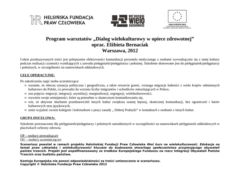 Program warsztatów „Dialog wielokulturowy w opiece zdrowotnej” oprac. Elżbieta Bernaciak Warszawa, 2012 Celem przekazywanych treści jest polepszenie efektywności komunikacji personelu medycznego z osobami wywodzącymi się z innej kultury podczas realizacji czynności wynikających z zawodu pielęgniarki/pielęgniarza i położnej. Szkolenie skierowane jest do pielęgniarek/pielęgniarzy i położnych, w szczególności na stanowiskach oddziałowych. CELE OPERACYJNE: Po zakończeniu zajęć osoba uczestnicząca: • rozumie, że obecna sytuacja polityczna i geograficzna, a także otwarcie granic, wzmaga migracje ludności z wielu krajów odmiennych kulturowo do Polski, co prowadzi do wzrostu liczby imigrantów i uchodźców mieszkających w Polsce, • zna pojęcia: migracji, integracji, asymilacji, marginalizacji, segregacji, wielokulturowości, • rozwinie swoje umiejętności, które są potrzebne w skutecznym komunikowaniu się, • wie, że aktywne słuchanie przedstawicieli innych kultur zwiększa szansę lepszej, skutecznej komunikacji, bez ograniczeń i barier kulturowych oraz językowych, • umie wyjaśnić swoim kolegom i koleżankom z pracy zasady „ Dobrej Praktyki” w kontaktach z osobami z innych kultur. GRUPA DOCELOWA: Szkolenie przeznaczone dla pielęgniarek/pielęgniarzy i położnych zatrudnionych w szczególności na stanowiskach pielęgniarek oddziałowych w placówkach ochrony zdrowia. OP – osoba/y prowadząca/e OU – osoba/y uczestnicząca/e Scenariusz powstał w ramach projektu Helsińskiej Fundacji Praw Człowieka Weź kurs na wielokulturowość. Edukacja na temat praw człowieka i wielokulturowości kluczem do budowania otwartego społeczeństwa przyjmującego obywateli państw trzecich. Projekt jest współfinansowany ze środków Europejskiego Funduszu na rzecz Integracji Obywateli Państw Trzecich oraz budżetu państwa. Komisja Europejska nie ponosi odpowiedzialności za treści umieszczone w scenariuszu. Copyright © Helsińska Fundacja Praw Człowieka 2012 Przebieg/treści programowe Czas Metody Niezbędne materiały Wprowadzenie a. przedstawienie siebie, osób uczestniczących, tematu zajęć, b. spisanie kontraktu z osobami uczestniczącymi, c. wysłuchanie i spisanie na tablicy wszystkich podawanych przez OU oczekiwań, d. omówienie spisanych oczekiwań zgodnie z celami i tematem zajęć. Moduł I. Wielokulturowość w społeczeństwie polskim 1. Krótkie wprowadzenie do zagadnienia: a. wstąpienie Polski do Unii Europejskiej spowodowało otwarcie granic, nasiliło migracje ludności z wielu krajów odmiennokulturowych, co spowodowało wzrost liczby imigrantów i uchodźców mieszkających w Polsce. b. mini wykład, którego celem jest przypomnienie i zapoznanie OU z zagadnieniami: kultura, tolerancja, akceptacja, migracja, integracja, asymilacja, marginalizacja, segregacja, wielokulturowość 2. Po krótkim wprowadzeniu do tematyki zajęć OU mają chwilę na zastanowienie się: a. czy spotkali się w życiu zawodowym lub osobistym z ludźmi z różnych kultur ? b. jak czuli się w takiej sytuacji, co ułatwiało im, a co utrudniało pogadanka wykład dyskusja burza mózgów flipchart mazaki 60 min. flipchart mazaki taśma klejąca wizytówki na imiona 90 min. Scenariusz powstał w ramach projektu Helsińskiej Fundacji Praw Człowieka Weź kurs na wielokulturowość. Edukacja na temat praw człowieka i wielokulturowości kluczem do budowania otwartego społeczeństwa przyjmującego obywateli państw trzecich. Projekt jest współfinansowany ze środków Europejskiego Funduszu na rzecz Integracji Obywateli Państw Trzecich oraz budżetu państwa. Komisja Europejska nie ponosi odpowiedzialności za treści umieszczone w scenariuszu. Copyright © Helsińska Fundacja Praw Człowieka 2012 3. 4. 5. 6. kontakt z ludźmi z innej kultury ? Na małych karteczkach OU spisują uczucia, emocje, zachowania, jakie towarzyszyły im przy tych spotkaniach. Chętna osoba/ osoby opowiadają swoją historię na forum grupy. Na planszy spisujemy spostrzeżenia (uczucia, emocje, zachowania) wszystkich OU. Podsumowując ustalamy z grupą 3- 4 najważniejsze elementy, które ułatwiały, bądź przeszkadzały w nawiązaniu relacji z drugim człowiekiem. Spisane spostrzeżenia umieszczamy na planszy i zawieszamy w widocznym miejscu. Przerwa Moduł II. Charakterystyka wybranych religii świata: Buddyzm, Chrześcijaństwo, Hinduizm, Islam, Świadkowie Jehowy oraz grupy etnicznej Romów, jako najbardziej „popularnych” grup pacjentów szpitali, a komunikacja interpersonalna 1. Prosimy OU o odliczenie do 6, następnie 1,2,3,4,5,6 łączą się w grupy (6 grup). Każda grupa dostaje opis jednej religii świata: Buddyzm, Chrześcijaństwo, Hinduizm, Islam, Świadkowie Jehowy oraz grupy etnicznej Romów. 2. Każda grupa zapoznaje się z opisem, a gdy jest gotowa przedstawia pozostałym grupom swoją religię/ grupę etniczną. 3. OU z każdej grupy ponownie odnoszą się do opisów i prowadzą dyskusję w grupie na temat swoich spostrzeżeń dotyczących kontaktów z tymi osobami (co może ułatwiać, a co utrudniać kontakt z tą osobą). 4. Prosimy, by każda grupa przeniosła opis wyznawcy religii/ osoby z grupy 15 min. 120 min. wykład burza mózgów dyskusja praca z tekstem mini flipcharty mazaki Scenariusz powstał w ramach projektu Helsińskiej Fundacji Praw Człowieka Weź kurs na wielokulturowość. Edukacja na temat praw człowieka i wielokulturowości kluczem do budowania otwartego społeczeństwa przyjmującego obywateli państw trzecich. Projekt jest współfinansowany ze środków Europejskiego Funduszu na rzecz Integracji Obywateli Państw Trzecich oraz budżetu państwa. Komisja Europejska nie ponosi odpowiedzialności za treści umieszczone w scenariuszu. Copyright © Helsińska Fundacja Praw Człowieka 2012 etnicznej na teren placówki ochrony zdrowia. Na flipchartach spisują najważniejsze elementy, na które należałoby zwrócić uwagę mając k