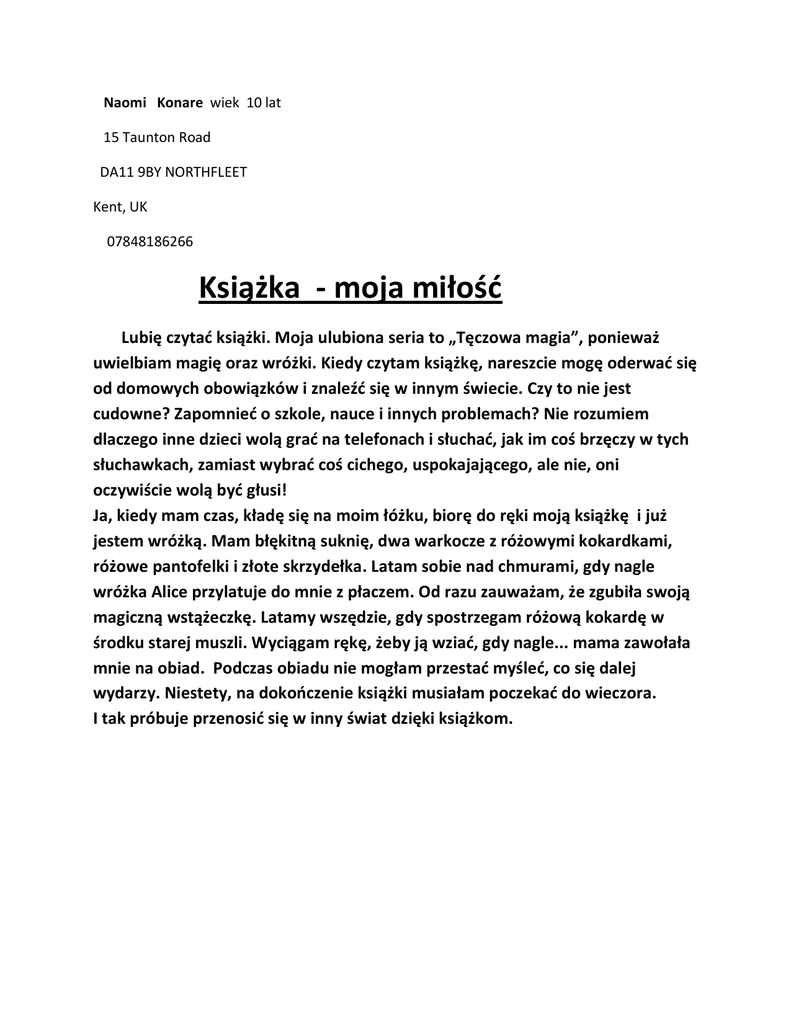 Naomi Konare wiek 10 lat 15 Taunton Road DA11 9BY NORTHFLEET Kent, UK 07848186266 Książka - moja miłość Lubię czytać książki. Moja ulubiona seria to „Tęczowa magia”, ponieważ uwielbiam magię oraz wróżki. Kiedy czytam książkę, nareszcie mogę oderwać się od domowych obowiązków i znaleźć się w innym świecie. Czy to nie jest cudowne? Zapomnieć o szkole, nauce i innych problemach? Nie rozumiem dlaczego inne dzieci wolą grać na telefonach i słuchać, jak im coś brzęczy w tych słuchawkach, zamiast wybrać coś cichego, uspokajającego, ale nie, oni oczywiście wolą być głusi! Ja, kiedy mam czas, kładę się na moim łóżku, biorę do ręki moją książkę i już jestem wróżką. Mam błękitną suknię, dwa warkocze z różowymi kokardkami, różowe pantofelki i złote skrzydełka. Latam sobie nad chmurami, gdy nagle wróżka Alice przylatuje do mnie z płaczem. Od razu zauważam, że zgubiła swoją magiczną wstążeczkę. Latamy wszędzie, gdy spostrzegam różową kokardę w środku starej muszli. Wyciągam rękę, żeby ją wziać, gdy nagle... mama zawołała mnie na obiad. Podczas obiadu nie mogłam przestać myśleć, co się dalej wydarzy. Niestety, na dokończenie książki musiałam poczekać do wieczora. I tak próbuje przenosić się w inny świat dzięki książkom.