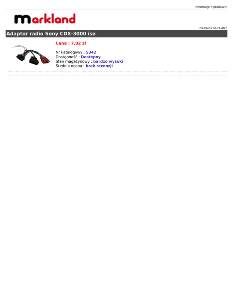Informacje o produkcie Utworzono 04-03-2017 Adaptor radio Sony CDX-3000 iso Cena : 7,02 zł Nr katalogowy : 5342 Dostępność : Dostępny Stan magazynowy : bardzo wysoki Średnia ocena : brak recenzji