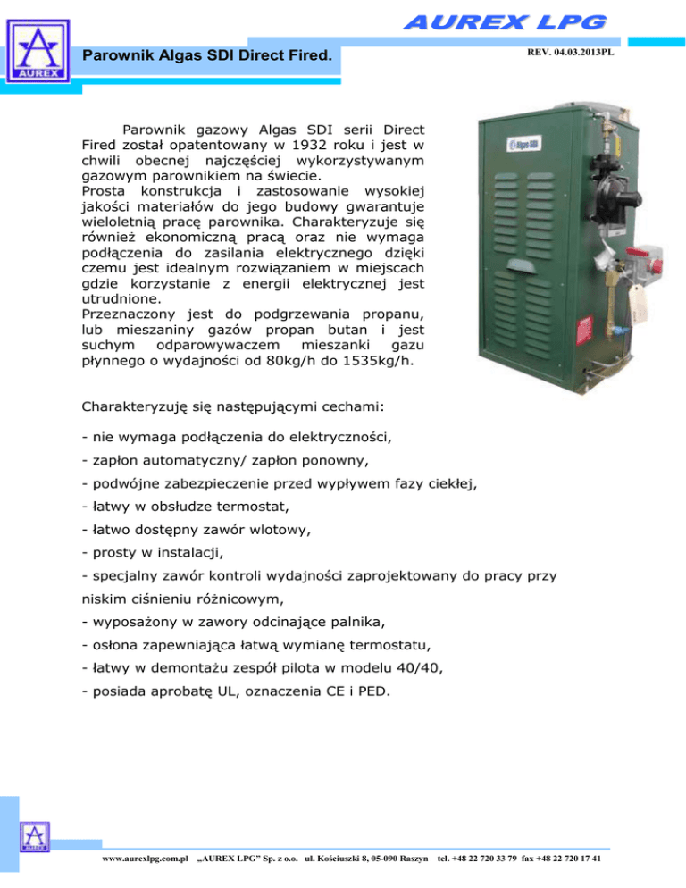 AUREX LPG Parownik Algas SDI Direct Fired. REV. 04.03.2013PL Parownik gazowy Algas SDI serii Direct Fired został opatentowany w 1932 roku i jest w chwili obecnej najczęściej wykorzystywanym gazowym parownikiem na świecie. Prosta konstrukcja i zastosowanie wysokiej jakości materiałów do jego budowy gwarantuje wieloletnią pracę parownika. Charakteryzuje się również ekonomiczną pracą oraz nie wymaga podłączenia do zasilania elektrycznego dzięki czemu jest idealnym rozwiązaniem w miejscach gdzie korzystanie z energii elektrycznej jest utrudnione. Przeznaczony jest do podgrzewania propanu, lub mieszaniny gazów propan butan i jest suchym odparowywaczem mieszanki gazu płynnego o wydajności od 80kg/h do 1535kg/h. Charakteryzuję się następującymi cechami: - nie wymaga podłączenia do elektryczności, - zapłon automatyczny/ zapłon ponowny, - podwójne zabezpieczenie przed wypływem fazy ciekłej, - łatwy w obsłudze termostat, - łatwo dostępny zawór wlotowy, - prosty w instalacji, - specjalny zawór kontroli wydajności zaprojektowany do pracy przy niskim ciśnieniu różnicowym, - wyposażony w zawory odcinające palnika, - osłona zapewniająca łatwą wymianę termostatu, - łatwy w demontażu zespół pilota w modelu 40/40, - posiada aprobatę UL, oznaczenia CE i PED. www.aurexlpg.com.pl „AUREX LPG” Sp. z o.o. ul. Kościuszki 8, 05-090 Raszyn tel. +48 22 720 33 79 fax +48 22 720 17 41 AUREX LPG Specyfikacja techniczna parowników serii Direct Fired. Model 40/40 80/40 120/60 160H 320H 480H 640H 800H Ciśnienie obliczeniowe 20, 0 bar 20, 0 bar 20, 0 bar 20, 0 bar 20, 0 bar 20, 0 bar 20, 0 bar 20, 0 bar Ciśnienie dopuszczalne 17,2 bar 17,2 bar 17,2 bar 17,2 bar 17,2 bar 17,2 bar 17,2 bar 17,2 bar Aprobata ASME, UL x x x x x x x x Oznaczenia CE, PED x x x - - - - - Wejście (FNPT) 3/4" 3/4" 3/4" 3/4" 2" 2" 2" 2" Wyjście (FNPT) 1" 1" 1" 1" 2" 2" 2" 1280 kg/h 2" 1535 kg/h 736 kg 2184 mm 920 kg 1092 mm 2743 mm 1931 mm Wydajność 80 kg/h Waga Wymiary: długość szerokość wysokość 160 kg/h 240 kg/h 320kg/h 640kg/h 960 kg/h 71 kg 100 kg 125 kg 184 kg 534 mm 534 mm 534 mm 915 mm 559 mm 1067 mm 889 mm 1067 mm 889 mm 1321 mm 915 mm 1727 mm 368 kg 1092 mm 1219 mm 1829 mm 552 kg 1092 mm 1727 mm 1827 mm 991 mm 1829 mm Schemat instalacji. www.aurexlpg.com.pl „AUREX LPG” Sp. z o.o. ul. Kościuszki 8, 05-090 Raszyn tel. +48 22 720 33 79 fax +48 22 720 17 41