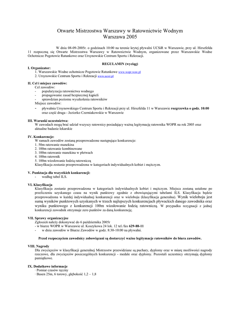 Otwarte Mistrzostwa Warszawy w Ratownictwie Wodnym Warszawa 2005 W dniu 08-09-2005r. o godzinach 10:00 na terenie krytej pływalni UCSiR w Warszawie, przy ul. Hirszfelda 11 rozpoczną się Otwarte Mistrzostwa Warszawy w Ratownictwie Wodnym, organizowane przez Warszawskie Wodne Ochotnicze Pogotowie Ratunkowe oraz Ursynowskie Centrum Sportu i Rekreacji. REGULAMIN (wyciąg) I. Organizator: 1. Warszawskie Wodne ochotnicze Pogotowie Ratunkowe www.wopr.waw.pl 2. Ursynowskie Centrum Sportu i Rekreacji www.ucsir.pl II. Cel i miejsce zawodów: Cel zawodów: popularyzacja ratownictwa wodnego propagowanie zasad bezpiecznej kąpieli sprawdzian poziomu wyszkolenia ratowników Miejsce zawodów: - pływalnia Ursynowskiego Centrum Sportu i Rekreacji przy ul. Hirszfelda 11 w Warszawie rozgrzewka o godz. 10:00 oraz część druga - Jeziorko Czerniakowskie w Warszawie III. Warunki uczestnictwa: W zawodach mogą brać udział wszyscy ratownicy posiadający ważną legitymację ratownika WOPR na rok 2005 oraz aktualne badanie lekarskie IV. Konkurencje: W ramach zawodów zostaną przeprowadzone następujące konkurencje: 1. 50m ratowanie manekina 2. 100m ratowanie kombinowane 3. 100m ratowanie manekina w płetwach 4. 100m ratownik 5. 100m wiosłowanie łodzią ratowniczą Klasyfikacja zostanie przeprowadzona w kategoriach indywidualnych kobiet i mężczyzn. V. Punktacja dla wszystkich konkurencji: według tabel ILS. VI. Klasyfikacja Klasyfikacja zostanie przeprowadzona w kategoriach indywidualnych kobiet i mężczyzn. Miejsca zostaną ustalone po przeliczeniu uzyskanego czasu na wynik punktowy zgodnie z obowiązującymi tabelami ILS. Klasyfikacja będzie przeprowadzona w każdej indywidualnej konkurencji oraz w wieloboju (klasyfikacja generalna). Wynik wieloboju jest sumą wyników punktowych uzyskanych w trzech najlepszych konkurencjach pływackich danego zawodnika oraz wyniku punktowego z konkurencji 100m wiosłowanie łodzią ratowniczą. W przypadku rezygnacji z jednej konkurencji zawodnik otrzymuje zero punktów za daną konkurencję. VII. Sprawy organizacyjne Zgłoszeń należy dokonywać do 6 października 2005r - w biurze WOPR w Warszawie ul. Koszykowa 24 lok. 12 tel./fax 629-88-11 w dniu zawodów w Biurze Zawodów w godz. 8:30-10:00 na pływalni. Przed rozpoczęciem zawodnicy zobowiązani są dostarczyć ważne legitymacje ratowników do biura zawodów. VIII. Nagrody Dla zwycięzców w klasyfikacji generalnej Mistrzostw przewidziane są puchary, dyplomy oraz w miarę możliwości nagrody rzeczowe, dla zwycięzców poszczególnych konkurencji - medale oraz dyplomy. Pozostali uczestnicy otrzymają dyplomy pamiątkowe. IX. Dodatkowe informacje · Pomiar czasów ręczny · Basen 25m, 6 torowy, głębokość 1,2 – 1,8 · Protesty i spory powinny być zgłaszane najpóźniej do 15 minut po zakończeniu konkurencji. Zostaną one w trybie natychmiastowym rozpatrzone przez kolegium sędziowskie. · Organizatorzy zastrzegają sobie prawo do ostatecznej interpretacji regulaminu. · Organizatorzy nie ponoszą odpowiedzialności za rzeczy wartościowe pozostawione na terenie basenu. · Manekiny i lodzie (takie jak na MP) zabezpieczają organizatorzy Opis konkurencji 50m ratowanie manekina Opis konkurencji Na sygnał startera zawodnik wykonuje skok do wody, następnie pokonuje dystans 25m stylem dowolnym. Na 25 metrze znajduje się zatopiony manekin, którego zawodnik wydobywa (podejmuje) nurkując. Zawodnik może odbijać się od dna lub ściany basenu. Między 25 a 30 metrem znajduje się strefa przeznaczona na wypływanie z manekinem. W tej 5-cio metrowej strefie manekin wyjątkowo może być zatapiany i zawodnik nie dostanie punktów karnych. Następnie do końca dystansu zawodnik holuje manekina sposobem dowolnym, zgodnym z przepisami ILS. Należy pamiętać, że manekin ma być holowany co najmniej jedną ręką i musi znajdować się w prawidłowej pozycji holowniczej zanim jego głowa przekroczy linię 5 m po jego wyciągnięciu. Podczas holowania twarz manekina nie może być zatapiana, natomiast może przez nią przelewać się woda (na skutek prędkości holowania lub robienia fali przez zawodnika). Dyskwalifikację można dostać za: a) Falstart (1. powtórzony bieg, 2. puszczony bieg, a zawodnik, który zrobił falstart DQ) b) Nie wynurzenie się przed zanurkowaniem po manekina. c) Korzystanie z pomocy jakichkolwiek urządzeń basenowych np. lin, torów, schodów itp. podczas wyciągania manekina. d) Wyciągnięcie manekina na powierzchnię wody za linią 5 m (liczone od czubka głowy). e) Używanie nieprawidłowej techniki holowania, f) Puszczenie manekina przed dotknięciem ściany mety. 100m ratowanie manekina w płetwach Opis konkurencji Na sygnał dźwiękowy zawodnik skacze do wody i przepływa stylem dowolnym 50 m w płetwach. Następnie zawodnik nurkuje po manekina, wyciąga go na powierzchnię wody w odległości nie przekraczającej 10 m od ściany nawrotowej i holuje go do mety. Strefa 10m oznacza tutaj strefę, w której manekin wyjątkowo może być zatapiany (lub wręcz holowany pod wodą) i zawodnik nie dostanie punktów karnych. Manekin ma być holowany co najmniej jedną ręką i musi znajdować się w prawidłowej pozycji holowniczej zanim jego głowa przekroczy linię 10 m od ściany po jego wyciągnięciu. Podczas holowania twarz manekina nie może być zatapiana, natomiast może przez nią przelewać się woda (na skutek prędkości holowania).. Jeżeli po starcie zawodnik zgubi jedną lub obie płetwy, może nadal kontynuować konkurencję. Zawodnik może odszukać płetwę (lub płetwy). Zawodnikowi nie wolno wystartować w innym biegu. Dyskwalifikacja grozi za: a) Falstart (1. powtórzony bieg, 2. puszczony bieg, a zawodnik, który zrobił falstart DQ) b) Korzystanie z pomocy jakichkolwiek urządzeń basenowych np. lin, torów, schodów itp. podczas wyciągania manekina. c) Wyciągnięcie manekina na powierzchnię wody za linią 10 m (liczone od czubka głowy). d) Używanie n
