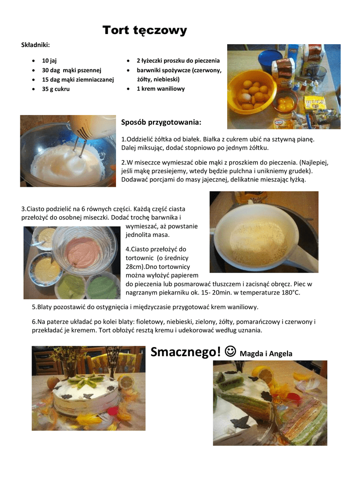 Tort tęczowy Składniki: 10 jaj 30 dag mąki pszennej 15 dag mąki ziemniaczanej 35 g cukru 2 łyżeczki proszku do pieczenia barwniki spożywcze (czerwony, żółty, niebieski) 1 krem waniliowy Sposób przygotowania: 1.Oddzielić żółtka od białek. Białka z cukrem ubić na sztywną pianę. Dalej miksując, dodać stopniowo po jednym żółtku. 2.W miseczce wymieszać obie mąki z proszkiem do pieczenia. (Najlepiej, jeśli mąkę przesiejemy, wtedy będzie pulchna i unikniemy grudek). Dodawać porcjami do masy jajecznej, delikatnie mieszając łyżką. 3.Ciasto podzielić na 6 równych części. Każdą część ciasta przełożyć do osobnej miseczki. Dodać trochę barwnika i wymieszać, aż powstanie jednolita masa. 4.Ciasto przełożyć do tortownic (o średnicy 28cm).Dno tortownicy można wyłożyć papierem do pieczenia lub posmarować tłuszczem i zacisnąć obręcz. Piec w nagrzanym piekarniku ok. 15- 20min. w temperaturze 180°C. 5.Blaty pozostawić do ostygnięcia i międzyczasie przygotować krem waniliowy. 6.Na paterze układać po kolei blaty: fioletowy, niebieski, zielony, żółty, pomarańczowy i czerwony i przekładać je kremem. Tort obłożyć resztą kremu i udekorować według uznania. Smacznego! Magda i Angela