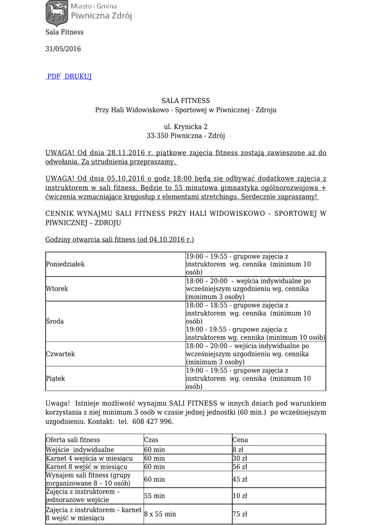 Sala Fitness 31/05/2016 PDF DRUKUJ SALA FITNESS Przy Hali Widowiskowo - Sportowej w Piwnicznej - Zdroju ul. Krynicka 2 33-350 Piwniczna - Zdrój UWAGA! Od dnia 28.11.2016 r. piątkowe zajęcia fitness zostają zawieszone aż do odwołania. Za utrudnienia przepraszamy. UWAGA! Od dnia 05.10.2016 o godz 18:00 będą się odbywać dodatkowe zajęcia z instruktorem w sali fitness. Będzie to 55 minutowa gimnastyka ogólnorozwojowa + ćwiczenia wzmacniające kręgosłup z elementami stretchingu. Serdecznie zapraszamy! CENNIK WYNAJMU SALI FITNESS PRZY HALI WIDOWISKOWO – SPORTOWEJ W PIWNICZNEJ – ZDROJU Godziny otwarcia sali fitness (od 04.10.2016 r.) 19:00 – 19:55 - grupowe zajęcia z instruktorem wg. cennika (minimum 10 osób) 18:00 – 20:00 – wejścia indywidualne po wcześniejszym uzgodnieniu wg. cennika (minimum 3 osoby) 18:00 – 18:55 - grupowe zajęcia z instruktorem wg. cennika (minimum 10 osób) 19:00 - 19:55 - grupowe zajęcia z instruktorem wg. cennika (minimum 10 osób) 18:00 – 20:00 – wejścia indywidualne po wcześniejszym uzgodnieniu wg. cennika (minimum 3 osoby) 19:00 – 19:55 - grupowe zajęcia z instruktorem wg. cennika (minimum 10 osób) Poniedziałek Wtorek Środa Czwartek Piątek Uwaga! Istnieje możliwość wynajmu SALI FITNESS w innych dniach pod warunkiem korzystania z niej minimum 3 osób w czasie jednej jednostki (60 min.) po wcześniejszym uzgodnieniu. Kontakt: tel. 608 427 996. Oferta sali fitness Czas Cena Wejście indywidualne Karnet 4 wejścia w miesiącu Karnet 8 wejść w miesiącu Wynajem sali fitness (grupy zorganizowane 8 – 10 osób) Zajęcia z instruktorem – jednorazowe wejście 60 min 60 min 60 min 8 zł 30 zł 56 zł 60 min 45 zł 55 min 10 zł Zajęcia z instruktorem – karnet 8 x 55 min 8 wejść w miesiącu 75 zł UWAGA Ze względu na coraz mniejsze zainteresowanie grupowymi zajęciami z instruktorem a w szczególności „pilatesem” oraz „zdrowym kręgosłupem” od dnia 06.06.2016r. zajęcia te zostają zawieszone aż do odwołania. Pozostałe zajęcia z instruktorem odbywać się będą tj: Poniedziałek TBC godz.19:00 Środa godz. TBC 19:00 Piątek godz.19:30 - obwód stacyjny. Za utrudnienia przepraszamy.
