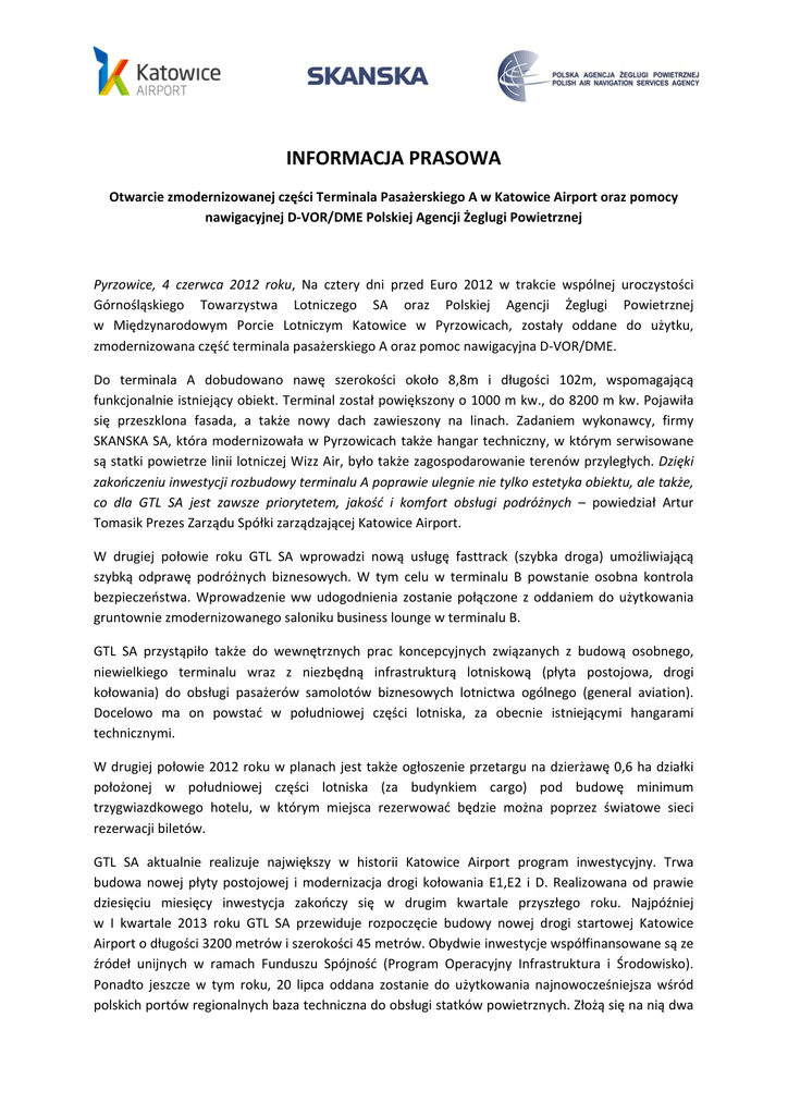 INFORMACJA PRASOWA Otwarcie zmodernizowanej części Terminala Pasażerskiego A w Katowice Airport oraz pomocy nawigacyjnej D‐VOR/DME Polskiej Agencji Żeglugi Powietrznej Pyrzowice, 4 czerwca 2012 roku, Na cztery dni przed Euro 2012 w trakcie wspólnej uroczystości Górnośląskiego Towarzystwa Lotniczego SA oraz Polskiej Agencji Żeglugi Powietrznej w Międzynarodowym Porcie Lotniczym Katowice w Pyrzowicach, zostały oddane do użytku, zmodernizowana część terminala pasażerskiego A oraz pomoc nawigacyjna D‐VOR/DME. Do terminala A dobudowano nawę szerokości około 8,8m i długości 102m, wspomagającą funkcjonalnie istniejący obiekt. Terminal został powiększony o 1000 m kw., do 8200 m kw. Pojawiła się przeszklona fasada, a także nowy dach zawieszony na linach. Zadaniem wykonawcy, firmy SKANSKA SA, która modernizowała w Pyrzowicach także hangar techniczny, w którym serwisowane są statki powietrze linii lotniczej Wizz Air, było także zagospodarowanie terenów przyległych. Dzięki zakończeniu inwestycji rozbudowy terminalu A poprawie ulegnie nie tylko estetyka obiektu, ale także, co dla GTL SA jest zawsze priorytetem, jakość i komfort obsługi podróżnych – powiedział Artur Tomasik Prezes Zarządu Spółki zarządzającej Katowice Airport. W drugiej połowie roku GTL SA wprowadzi nową usługę fasttrack (szybka droga) umożliwiającą szybką odprawę podróżnych biznesowych. W tym celu w terminalu B powstanie osobna kontrola bezpieczeństwa. Wprowadzenie ww udogodnienia zostanie połączone z oddaniem do użytkowania gruntownie zmodernizowanego saloniku business lounge w terminalu B. GTL SA przystąpiło także do wewnętrznych prac koncepcyjnych związanych z budową osobnego, niewielkiego terminalu wraz z niezbędną infrastrukturą lotniskową (płyta postojowa, drogi kołowania) do obsługi pasażerów samolotów biznesowych lotnictwa ogólnego (general aviation). Docelowo ma on powstać w południowej części lotniska, za obecnie istniejącymi hangarami technicznymi. W drugiej połowie 2012 roku w planach jest także ogłoszenie przetargu na dzierżawę 0,6 ha działki położonej w południowej części lotniska (za budynkiem cargo) pod budowę minimum trzygwiazdkowego hotelu, w którym miejsca rezerwować będzie można poprzez światowe sieci rezerwacji biletów. GTL SA aktualnie realizuje największy w historii Katowice Airport program inwestycyjny. Trwa budowa nowej płyty postojowej i modernizacja drogi kołowania E1,E2 i D. Realizowana od prawie dziesięciu miesięcy inwestycja zakończy się w drugim kwartale przyszłego roku. Najpóźniej w I kwartale 2013 roku GTL SA przewiduje rozpoczęcie budowy nowej drogi startowej Katowice Airport o długości 3200 metrów i szerokości 45 metrów. Obydwie inwestycje współfinansowane są ze źródeł unijnych w ramach Funduszu Spójność (Program Operacyjny Infrastruktura i Środowisko). Ponadto jeszcze w tym roku, 20 lipca oddana zostanie do użytkowania najnowocześniejsza wśród polskich portów regionalnych baza techniczna do obsługi statków powietrznych. Złożą się na nią dwa hangary techniczne, w których jednocześnie będzie można serwisować cztery samoloty wielkości Airbusa A320, Boeinga 737, oraz cała niezbędna infrastruktura liniowa (przed hangarowe płyty postojowe, nowe drogi kołowania). Drugą z inwestycji otwartych dzisiaj w Katowice Airport jest nowa katowicka radiolatarnia D‐VOR/DME. Przedsięwzięcie realizowała Polska Agencja Żeglugi Powietrznej, która kupiła i zainstalowała nowe urządzenia nawigacyjne. Po uzyskaniu stosownej zgody administracyjnej, opublikowała zmianę w AIP Polska, umożliwiającą w oparciu o nową radiolatarnie lepsze wykorzystanie pomocniczego kierunku podejścia do lądowania na pyrzowickim lotnisku. Lepsze oprzyrządowanie pomocniczego kierunku podejścia do lądowania ma duże znaczenie, gdyż pomocniczy kierunek podejścia do lądowania, w związku ze zmieniającą się strukturą wiatrów, jest coraz częściej operacyjnie wykorzystywany. Nowa radiolatarnia D‐VOR zainstalowana w komplecie z dalmierzem DME to system radiowy, który dzięki specjalnym odbiornikom w samolocie ‐ umożliwia pilotowi odczytanie namiaru prowadzącego do radiolatarni oraz podaje mu odległość od niej. Nowa radiolatarnia będzie wykorzystywana przede wszystkim, jako pomoc nawigacyjna w przypadku lądowania na pomocniczym kierunku RWY09. Na głównym kierunku RWY27, podstawową pomocą nawigacyjną pozostaje precyzyjny system ILS (Instrument Landing System). Sygnał nowej radiolatarni został już zmierzony z powietrza. Po uzyskaniu odpowiedniego zezwolenia na użytkowanie (9 lutego 2012 roku), została zarejestrowana w ULC w rejestrze lotniskowych urządzeń nawigacyjnych, a następnie zostały opublikowane zmodyfikowane procedury startów i lądowań uwzględniające nową pomoc nawigacyjną. Radiolatarnia jest już od 31 maja 2012 operacyjnie wykorzystana przez pilotów. Budowa nowego urządzenia kosztowała 3 mln zł.(wartość netto sprzętu, projektu i robót budowlanych 3 000 903,00 zł). PAŻP realizuje swoje inwestycje uwzględniając plany rozwoju lotnisk. Tak jest i w Katowicach. Nowe urządzenie D‐VOR/DME zostało posadowione w taki sposób, aby mogło być wykorzystywane również dla planowanej, nowej drogi startowej na Lotnisku Katowice – powiedział Krzysztof Banaszek Prezes PAŻP. Dodatkowych informacji udzielają: Grzegorz Hlebowicz Rzecznik prasowy Polskiej Agencji Żeglugi Powietrznej Nr tel. kom. +48 609 501 241 Cezary Orzech Rzecznik prasowy Górnośląskiego Towarzystwa Lotniczego SA Nr tel. kom. +48 600 281 798