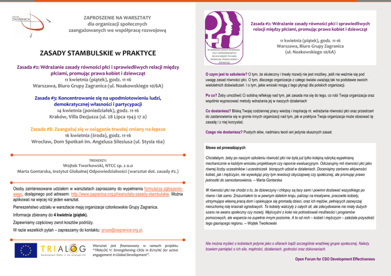 ZAPROSZENIE NA WARSZTATY dla organizacji społecznych zaangażowanych we współpracę rozwojową Zasada #2: Wdrażanie zasady równości płci i sprawiedliwych relacji między płciami, promując prawa kobiet i dziewcząt 11 kwietnia (piątek), godz. 11-16 Warszawa, Biuro Grupy Zagranica (ul. Noakowskiego 10/6A) ZASADY STAMBULSKIE w PRAKTYCE Zasada #2: Wdrażanie zasady równości płci i sprawiedliwych relacji między płciami, promując prawa kobiet i dziewcząt 11 kwietnia (piątek), godz. 11-16 Warszawa, Biuro Grupy Zagranica (ul. Noakowskiego 10/6A) Zasada #3: Koncentrowanie się na upodmiotowieniu ludzi, demokratycznej własności i partycypacji 14 kwietnia (poniedziałek), godz. 11-16 Kraków, Villa Decjusza (ul. 28 Lipca 1943 17 a) Zasada #8: Zaangażuj się w osiąganie trwałej zmiany na lepsze 16 kwietnia (środa), godz. 11-16 Wrocław, Dom Spotkań im. Angelusa Silesiusa (ul. Stysia 16a) O czym jest to szkolenie? O tym, że skuteczny i trwały rozwój nie jest możliwy, jeśli nie weźmie się pod uwagę zasad równości płci. O tym, dlaczego organizacje z całego świata uważają tak na podstawie swoich wieloletnich doświadczeń. I o tym, jakie wnioski mogą z tego płynąć dla polskich organizacji. Po co? Żeby umożliwić Ci solidną refleksję nad tym, jak zasada ma się do tego, co robi Twoja organizacja oraz wspólnie wypracować metody wdrażania jej w naszych działaniach Co dostaniesz? Bliską Twojej codziennej pracy wiedzę i inspirację nt. wdrażania równości płci oraz przestrzeń do zastanowienia się w gronie innych organizacji nad tym, jak w praktyce Twoja organizacja może stosować tę zasadę i z niej korzystać. Czego nie dostaniesz? Pustych słów, nadmiaru teorii ani jedynie słusznych zasad. Słowo od prowadzących TRENERZY: Wojtek Tworkowski, NTCC sp. z o.o Marta Gontarska, Instytut Globalnej Odpowiedzialności (warsztat dot. zasady #2.) Osoby zainteresowane udziałem w warsztatach zapraszamy do wypełnienia formularza zgłoszeniowego, dostępnego pod adresem: http://www.zagranica.org.pl/warsztaty-zasady-stambulskie. Można aplikować na więcej niż jeden warsztat. Pierwszeństwo udziału w warsztacie mają organizacje członkowskie Grupy Zagranica. Informacje zbieramy do 4 kwietnia (piątek). Zapewniamy częściowy zwrot kosztów podróży. Chciałabym, żeby po naszym szkoleniu równość płci nie była już tylko kolejną rubryką wypełnianą mechanicznie w każdym wniosku projektowym czy raporcie ewaluacyjnym. Odczarujmy mit równości płci jako równej liczby uczestników i uczestniczek biorących udział w działaniach. Doceniajmy zarówno aktywności kobiet, jak i mężczyzn, nie wywołując przy tym rewolucji obyczajowej czy społecznej, ale promując prawo jednostki do samostanowienia. -- Marta Gontarska W równości płci nie chodzi o to, że dziewczyny i chłopcy są tacy sami i powinni dostawać wszystkiego po równo i tak samo. Zrozumiałem to w pewnym dalekim kraju, patrząc na kreatywne, pracowite kobiety, utrzymujące własną pracą dom i opiekujące się gromadą dzieci, oraz ich mężów, pełniących zazwyczaj nieruchomą rolę krasnali ogrodowych. Te kobiety walczyły z całych sił, ale zdecydowanie nie miały dużych szans na awans społeczny czy rozwój. Mężczyźni z kolei nie potrzebowali możliwości i programów pomocowych, ale wsparcia na zupełnie innym poziomie. A to od nich – kobiet i mężczyzn – zależała przyszłość tego gasnącego regionu. -- Wojtek Tworkowski W razie wszelkich pytań – zapraszamy do kontaktu: [email protected]. Warsztat jest finansowany w ramach projektu “TRIALOG V: Strengthening CSOs in EU12/AC for active engagement in Global Development”. Nie można myśleć o kobietach jedynie jako o ofiarach bądź szczególnie wrażliwej grupie społecznej. Należy bowiem pamiętać o ich sile, mądrości, działaniach, godności oraz dokonaniach. Open Forum for CSO Development Effectiveness Zasada #3: Koncentrowanie się na upodmiotowieniu ludzi, demokratycznej własności i partycypacji Zasada #8: Zaangażuj się w osiąganie trwałej zmiany na lepsze 14 kwietnia (poniedziałek), godz. 11-16 Kraków, Villa Decjusza (ul. 28 Lipca 1943 17 a) 16 kwietnia (środa), godz. 11-16 Wrocław, Dom Spotkań im. Angelusa Silesiusa (ul. Stysia 16a) O czym jest to szkolenie? O tym, dlaczego rozwój może nastąpić i być trwały tylko wtedy, kiedy ludzie, których dotyczy są w niego czynnie zaangażowani jako podmioty działań i mają poczucie własności procesu zmiany, w którym uczestniczą. O czym jest to szkolenie? O tym, że chociaż fajnie jest po prostu komuś pomóc, to prawdziwa zmiana na lepsze powinna być trwała. O tym, jak planować, osiągać i sprawdzać, czy rzeczywiście dążymy do takiej zmiany. Po co? Żeby umożliwić Ci solidną refleksję nad tym, jak ta zasada ma się do tego, co robi Twoja organizacja oraz wspólnie wypracować metody wdrażania jej w naszych działaniach Po co? Żeby wspólnie zastanowić się nad tym, jak skuteczniej wykorzystać te ograniczone zasoby, które możemy zainwestować we współpracę z krajami Południa czy Wschodu i nadać naszym działaniom naprawdę długofalowe znaczenie. Co dostaniesz? Bliską Twojej codziennej pracy wiedzę i inspirację nt. demokratycznej własności procesów rozwoju i zaangażowania beneficjentów swoich działań jako ich właścicieli. Czego nie dostaniesz? Pustych słów, nadmiaru teorii ani jedynie słusznych zasad. Co dostaniesz? Bliską Twojej codziennej pracy wiedzę i inspirację do planowania i weryfikowania swoich działań pod kątem długofalowych, trwałych rezultatów i wpływu. Czego nie dostaniesz? Pustych słów, nadmiaru teorii ani jedynie słusznych zasad. Słowo od prowadzącego Słowo od prowadzącego Wszyscy znamy ten model: organizacja z zagranicy przyjeżdża; wie, co ma zrobić; robi to. I teoretycznie świat powinien się zmienić. Rok albo dwa później okazuje się, że tak się nie s