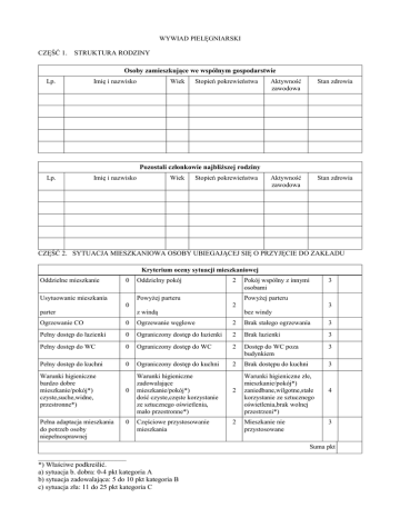 WYWIAD PIELĘGNIARSKI CZĘŚĆ 1. STRUKTURA RODZINY Osoby zamieszkujące we wspólnym gospodarstwie Lp. Imię i nazwisko Wiek Stopień pokrewieństwa Aktywność zawodowa Stan zdrowia Aktywność zawodowa Stan zdrowia Pozostali członkowie najbliższej rodziny Lp. Imię i nazwisko Wiek Stopień pokrewieństwa CZĘŚĆ 2. SYTUACJA MIESZKANIOWA OSOBY UBIEGAJĄCEJ SIĘ O PRZYJĘCIE DO ZAKŁADU Kryterium oceny sytuacji mieszkaniowej Oddzielne mieszkanie 0 Usytuowanie mieszkania Oddzielny pokój 2 Powyżej parteru 0 parter Pokój wspólny z innymi osobami 3 Powyżej parteru 2 z windą 3 bez windy Ogrzewanie CO 0 Ogrzewanie węglowe 2 Brak stałego ogrzewania 3 Pełny dostęp do łazienki 0 Ograniczony dostęp do łazienki 2 Brak łazienki 3 Pełny dostęp do WC 0 Ograniczony dostęp do WC 2 Dostęp do WC poza budynkiem 3 Pełny dostęp do kuchni 0 Ograniczony dostęp do kuchni 2 Brak dostępu do kuchni 3 Warunki higieniczne bardzo dobre mieszkanie/pokój*) czyste,suche,widne, przestronne*) Pełna adaptacja mieszkania do potrzeb osoby niepełnosprawnej 0 0 Warunki higieniczne zadowalające mieszkanie/pokój*) dość czyste,częste korzystanie ze sztucznego oświetlenia, mało przestronne*) Częściowe przystosowanie mieszkania 2 2 Warunki higieniczne złe, mieszkanie/pokój*) zaniedbane,wilgotne,stałe korzystanie ze sztucznego oświetlenia,brak wolnej przestrzeni*) Mieszkanie nie przystosowane 4 3 Suma pkt _________________________ *) Właściwe podkreślić. a) sytuacja b. dobra: 0-4 pkt kategoria A b) sytuacja zadowalająca: 5 do 10 pkt kategoria B c) sytuacja zła: 11 do 25 pkt kategoria C CZĘŚĆ 3. OCENA WYDOLNOŚCI OPIEKUŃCZEJ RODZINY/ŚRODOWISKA Zakres sprawowanej opieki Kategoria*) Pełna wydolność opiekuńcza rodziny A Niepełna wydolność opiekuńcza rodziny (zaangażowanie innych osób) B Brak opieki ze strony rodziny - pełna zależność od osób obcych C _______________________ *) Właściwe podkreślić CZĘŚĆ 4. ROZPOZNANIE PROBLEMÓW PIELĘGNACYJNYCH ....................................................................................................................................................................................... ....................................................................................................................................................................................... ....................................................................................................................................................................................... ....................................................................................................................................................................................... ....................................................................................................................................................................................... ....................................................................................................................................................................................... ....................................................................................................................................................................................... ....................................................................................................................................................................................... ....................................................................................................................................................................................... ....................................................................................................................................................................................... Zakres sprawowanej opieki Kategoria*) Nie wymaga ciągłej opieki pielęgniarskiej A Wymaga ciągłej opieki pielęgniarskiej B Wymaga kompleksowej intensywnej opieki pielęgniarskiej C ______________________ *) Właściwe podkreślić. ŁĄCZNIE UZYSKANE KATEGORIE W CZĘŚCIACH 2-4 ............................................................... (podpis pielęgniarki przeprowadzającej wywiad) ............................................................ (data) Oświadczenie osoby ubiegającej się o skierowanie do zakładu albo jej przedstawiciela ustawowego. Wyrażam/nie wyrażam zgody na gromadzenie i przechowywanie danych osobowych dotyczących osoby ubiegającej się o skierowanie do zakładu. ...................................................................... (data i podpis osoby kierowanej do zakładu lub jej przedstawiciela ustawowego*) ___________________________ *) Niepotrzebne skreślić