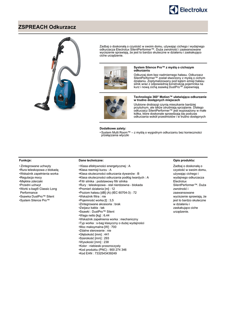 ZSPREACH Odkurzacz Zadbaj o doskonałą o czystość w swoim domu, używając cichego i wydajnego odkurzacza Electrolux SilentPerformer™. Duża zwrotność i zaawansowane wyciszenie sprawiają, że jest to bardzo skuteczne w działaniu i zaskakująco ciche urządzenie. System Silence Pro™ z myślą o cichszym odkurzaniu Odkurzaj dom bez nadmiernego hałasu. Odkurzacz SilentPerformer™ został stworzony z myślą o cichym działaniu. Zoptymalizowany pod kątem emisji hałasu silnik wraz z odpowiednią konstrukcją pojemnika na kurz i nową cichą ssawką DustPro™ zapewniają Technologia 360° Motion™ ułatwiająca odkurzanie w trudno dostępnych miejscach Ulubione drobiazgi czynią mieszkanie bardziej przytulnym, ale także utrudniają sprzątanie. Dlatego odkurzacz SilentPerformer™ jest wyposażony w małe kółka, które doskonale sprawdzają się podczas odkurzania wokół przedmiotów i w trudno dostępnych Dodatkowe zalety: • System Multi Room™ – z myślą o wygodnym odkurzaniu bez konieczności przełączania wtyczki Funkcje: Dane techniczne: Opis produktu: • Zintegrowane uchwyty •Rura teleskopowa z blokadą •Wskażnik zapełnienia worka •Regulacja mocy •Miękkie zderzaki •Przedni uchwyt •Worki s-bag® Classic Long Performance •Ssawka DustPro™ Silent •System Silence Pro™ • Klasa efektywności energetycznej : A •Klasa reemisji kurzu : A •Klasa skuteczności odkurzania dywanów : B •Klasa skuteczności odkurzania podłóg twardych : A •Filtr silnika : podstawowy filtr silnika •Rury : teleskopowa - stal nierdzewna - blokada •Promień działania [m] : 12 •Poziom hałasu [dB] (A) (IEC 60704-3) : 72 •Wskaźnik filtra : nie •Pojemność worka [l] : 3,5 •Zintegrowane akcesoria : brak •Zwijacz kabla : tak •Ssawki : DustPro™ Silent •Waga netto [kg] : 6,44 •Wskaźnik zapełnienia worka : mechaniczny •Typ worka : s-bag klasyczny o dużej wydajności •Moc maksymalna [W] : 700 •Zdalne sterowanie : nie •Głębokość [mm] : 441 •Szerokość [mm] : 293 •Wysokość [mm] : 238 •Kolor : niebieski przezroczysty •Kod produktu (PNC) : 900 274 346 •Kod EAN : 7332543439249 Zadbaj o doskonałą o czystość w swoim domu, używając cichego i wydajnego odkurzacza Electrolux SilentPerformer™. Duża zwrotność i zaawansowane wyciszenie sprawiają, że jest to bardzo skuteczne w działaniu i zaskakująco ciche urządzenie.