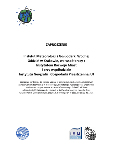 ZAPROSZENIE Instytut Meteorologii i Gospodarki Wodnej Oddział w Krakowie, we współpracy z Instytutem Rozwoju Miast i przy współudziale Instytutu Geografii i Gospodarki Przestrzennej UJ zapraszają serdecznie do wzięcia udziału w seminarium naukowym poświęconym zastosowaniom technik GIS w meteorologii, klimatologii, hydrologii oraz urbanistyce Seminarium zorganizowane w ramach Światowego Dnia GIS (GISDay) odbędzie się 19 listopada b.r. (środa) w Sali Seminaryjnej im. Henryka Słoty w Krakowskim Oddziale IMGW, przy ul. P. Borowego 14 w godz. od 10:00 do 14:15 Program Seminarium 10:00 – 10:15 Powitanie / wprowadzenie Sesja 1 – GIS w meteorologii, klimatologii i hydrologii 10:15 – 10:35 mgr inż. Jadwiga Niedbała (Biuro Prognoz Hydrologicznych IMGW OKk) – „Wykorzystanie narzędzi GIS w modelowaniu hydrologicznym stosowanym w Platformie Modelowania Systemu Hydrologii” 10:35 – 10:55 mgr Jakub Walawender (Ośrodek Teledetekcji Satelitarnej IMGW OKk, Zakład Klimatologii IGiGP UJ) – „GIS w badaniach pogody i klimatu” 10:55 – 11:15 dr hab. Zbigniew Ustrnul, Prof. UJ (Zakład Meteorologii IMGW OKk, Zakład Klimatologii IGiGP UJ) - “Doświadczenia z akcji COST-719 – The use of GIS in climatology and meteorology” 11:15 – 11:35 mgr Robert Pyrc (Zakład Meteorologii IMGW OKk) – „Próba regionalizacji klimatycznej z wykorzystaniem GIS" 11:35 – 11:55 mgr Andrzej Kotarba (Zakład Systemów Informacji Geograficznej, Kartografii i Teledetekcji IGiGP UJ) – „Satelitarne obserwacje zachmurzenia ogólnego nad Polską” 11:55 – 12:30 Przerwa Sesja 2 – Sied naukowa ‘Systemy Geoinformacyjne’ 12:30 – 12:50 mgr Małgorzata Barszczyoska (Zakład Systemów Wodnogospodarczych IMGW OKk) - "Dyrektywa INSPIRE w IMGW" 12:50 – 13:10 mgr inż. Paweł Madej (Zakład Systemów Wodnogospodarczych IMGW OKk) – „Sieciowe usługi geoprzestrzenne jako element infrastruktury danych przestrzennych” 13:10 – 13:30 mgr Janusz Jeżak (Instytut Rozwoju Miast) – „Audyt miejski – idea, koncepcja, technologia, wdrożenia” 13:30 – 13:50 mgr Janusz Jeżak, dr Wojciech Jarczewski (Instytut Rozwoju Miast) – „Metoda delimitacja obszarów wymagających wsparcia w ramach Lokalnych Programów Rewitalizacji na przykładzie miast Małopolski” 13:50 – 14:10 mgr Danuta Kubacka, mgr inż. Urszula Opial-Gałuszka (Zakład Systemów Wodnogospodarczych IMGW OKk) – „Możliwości wykorzystania GIS w modelowaniu jakości wód w zlewniach rolniczych” Jak do nas dojechad? Z Dworca Głównego - przystanek ‘Dworzec Główny’ – autobus 152 - przystanek ‘Dworzec Główny wschód’ – autobusy: 192, 292 Spod Hotelu Cracovia Przystanek ‘Cracovia’ – autobusy: 134, 152, 192, 292 Należy wysiąśd na przystanku ‘Strzelnica’ , cofnąd się o 150m i skręcid w lewo w ulicę Piotra Borowego, która prowadzi prosto do siedziby IMGW w Krakowie . Uwaga! Uprzejmie prosimy o potwierdzenie uczestnictwa w seminarium do dnia 17 listopada – poniedziałek! Udział w seminarium jest bezpłatny. Kontakt: Jakub Walawender tel.: 012 63-98-122 e-mail: [email protected] Małgorzata Barszczyoska tel.: 012 63-98-214 e-mail: [email protected]
