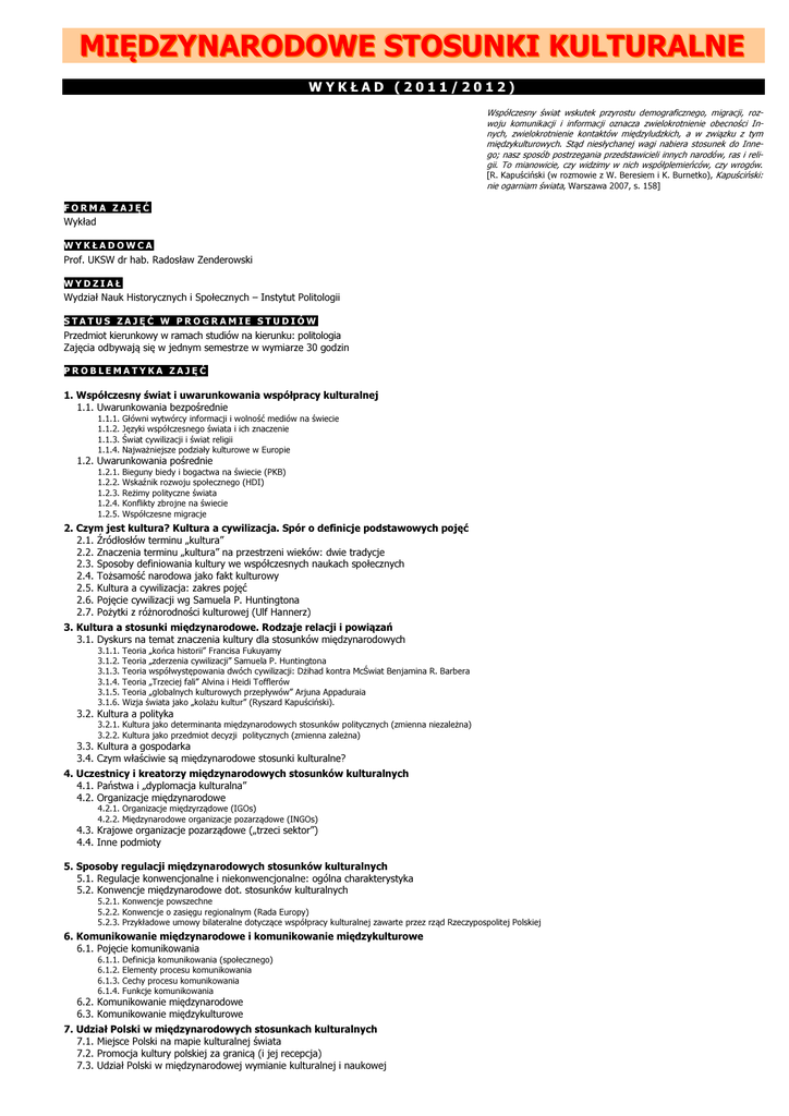 MIĘDZYNARODOWE STOSUNKI KULTURALNE WYKŁAD (2011/2012) Współczesny świat wskutek przyrostu demograficznego, migracji, rozwoju komunikacji i informacji oznacza zwielokrotnienie obecności Innych, zwielokrotnienie kontaktów międzyludzkich, a w związku z tym międzykulturowych. Stąd niesłychanej wagi nabiera stosunek do Innego; nasz sposób postrzegania przedstawicieli innych narodów, ras i religii. To mianowicie, czy widzimy w nich współplemieńców, czy wrogów. [R. Kapuściński (w rozmowie z W. Beresiem i K. Burnetko), Kapuściński: nie ogarniam świata, Warszawa 2007, s. 158] FORMA ZAJĘĆ Wykład WYKŁADOWCA Prof. UKSW dr hab. Radosław Zenderowski WYDZIAŁ Wydział Nauk Historycznych i Społecznych – Instytut Politologii STATUS ZAJĘĆ W PROGRAMIE STUDIÓW Przedmiot kierunkowy w ramach studiów na kierunku: politologia Zajęcia odbywają się w jednym semestrze w wymiarze 30 godzin PROBLEMATYKA ZAJĘĆ 1. Współczesny świat i uwarunkowania współpracy kulturalnej 1.1. Uwarunkowania bezpośrednie 1.1.1. 1.1.2. 1.1.3. 1.1.4. Główni wytwórcy informacji i wolność mediów na świecie Języki współczesnego świata i ich znaczenie Świat cywilizacji i świat religii Najważniejsze podziały kulturowe w Europie 1.2. Uwarunkowania pośrednie 1.2.1. 1.2.2. 1.2.3. 1.2.4. 1.2.5. Bieguny biedy i bogactwa na świecie (PKB) Wskaźnik rozwoju społecznego (HDI) Reżimy polityczne świata Konflikty zbrojne na świecie Współczesne migracje 2. Czym jest kultura? Kultura a cywilizacja. Spór o definicje podstawowych pojęć 2.1. Źródłosłów terminu „kultura” 2.2. Znaczenia terminu „kultura” na przestrzeni wieków: dwie tradycje 2.3. Sposoby definiowania kultury we współczesnych naukach społecznych 2.4. Tożsamość narodowa jako fakt kulturowy 2.5. Kultura a cywilizacja: zakres pojęć 2.6. Pojęcie cywilizacji wg Samuela P. Huntingtona 2.7. Pożytki z różnorodności kulturowej (Ulf Hannerz) 3. Kultura a stosunki międzynarodowe. Rodzaje relacji i powiązań 3.1. Dyskurs na temat znaczenia kultury dla stosunków międzynarodowych 3.1.1. 3.1.2. 3.1.3. 3.1.4. 3.1.5. 3.1.6. Teoria „końca historii” Francisa Fukuyamy Teoria „zderzenia cywilizacji” Samuela P. Huntingtona Teoria współwystępowania dwóch cywilizacji: Dżihad kontra McŚwiat Benjamina R. Barbera Teoria „Trzeciej fali” Alvina i Heidi Tofflerów Teoria „globalnych kulturowych przepływów” Arjuna Appaduraia Wizja świata jako „kolażu kultur” (Ryszard Kapuściński). 3.2. Kultura a polityka 3.2.1. Kultura jako determinanta międzynarodowych stosunków politycznych (zmienna niezależna) 3.2.2. Kultura jako przedmiot decyzji politycznych (zmienna zależna) 3.3. Kultura a gospodarka 3.4. Czym właściwie są międzynarodowe stosunki kulturalne? 4. Uczestnicy i kreatorzy międzynarodowych stosunków kulturalnych 4.1. Państwa i „dyplomacja kulturalna” 4.2. Organizacje międzynarodowe 4.2.1. Organizacje międzyrządowe (IGOs) 4.2.2. Międzynarodowe organizacje pozarządowe (INGOs) 4.3. Krajowe organizacje pozarządowe („trzeci sektor”) 4.4. Inne podmioty 5. Sposoby regulacji międzynarodowych stosunków kulturalnych 5.1. Regulacje konwencjonalne i niekonwencjonalne: ogólna charakterystyka 5.2. Konwencje międzynarodowe dot. stosunków kulturalnych 5.2.1. Konwencje powszechne 5.2.2. Konwencje o zasięgu regionalnym (Rada Europy) 5.2.3. Przykładowe umowy bilateralne dotyczące współpracy kulturalnej zawarte przez rząd Rzeczypospolitej Polskiej 6. Komunikowanie międzynarodowe i komunikowanie międzykulturowe 6.1. Pojęcie komunikowania 6.1.1. 6.1.2. 6.1.3. 6.1.4. Definicja komunikowania (społecznego) Elementy procesu komunikowania Cechy procesu komunikowania Funkcje komunikowania 6.2. Komunikowanie międzynarodowe 6.3. Komunikowanie międzykulturowe 7. Udział Polski w międzynarodowych stosunkach kulturalnych 7.1. Miejsce Polski na mapie kulturalnej świata 7.2. Promocja kultury polskiej za granicą (i jej recepcja) 7.3. Udział Polski w międzynarodowej wymianie kulturalnej i naukowej ROZKŁAD ZAJĘĆ 1. Wykład Wprowadzenie do problematyki wykładu. Zajęcia organizacyjne 2. Wykład Współczesny świat i uwarunkowania współpracy kulturalnej – (cz. 1) uwarunkowania bezpośrednie (prezentacja multimedialna) Literatura podstawowa: Zenderowski R., Współczesny świat i uwarunkowania współpracy kulturalnej, prezentacja multimedialna (udostępniona studentom). 3. Wykład Współczesny świat i uwarunkowania współpracy kulturalnej – (cz. 2) uwarunkowania pośrednie (prezentacja multimedialna) Literatura podstawowa: Zenderowski R., Współczesny świat i uwarunkowania współpracy kulturalnej, prezentacja multimedialna (udostępniona studentom). 4. Wykład Czym jest kultura? Kultura a cywilizacja. Spór o definicje podstawowych pojęć Literatura podstawowa: Jabłoński M., Obirek S., Cywilizacja, w: B. Szlachta (red.), Słownik społeczny, Kraków 2004, s. 101-107. Skoczyński J., Cywilizacja, w: Z. Bokszański i in. (red.), Encyklopedia socjologii, t. 1, Warszawa 1998, s. 101-103. Skoczyński J., Kultura, w: B. Szlachta (red.), Słownik społeczny, Kraków 2004, s. 614-619. Szacka B., Wprowadzenie do socjologii, Warszawa 2003, s. 73-91. Literatura uzupełniająca: Braudel F., Gramatyka cywilizacji, Warszawa 2006, s. 37-69. Dyczewski L., Tożsamość społeczno-kulturowa w globalizującym się świecie, „Kultura i Społeczeństwo” 2000 nr 1, s. 27-42. Gołembski F., Stosunki kulturalne na Bałkanach, Warszawa 2001, s. 7-31. Hannerz U., Powiązania transnarodowe. Kultura, ludzie, miejsca, Kraków 2006, s. 89-100. Huntington S.P., Zderzenie cywilizacji i nowy kształt ładu światowego, Warszawa 1997, s. 7-97. Kłoskowska A., Kultura masowa, Warszawa 2006. Kuper A., Kultura. Model antropologiczny, Kraków 2005, s. 21-40. Nowicka E., Dyfuzja kulturowa, w: Z. Bokszański i in. (red.), Encyklopedia socjologii, t. 1, Warszawa 1998, s. 152-156. Obarski E., Nowy Wspania