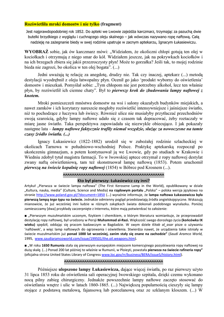 Rozświetliła mroki domostw i nie tylko (fragment) Jest najprawdopodobniej rok 1852. Do apteki we Lwowie zajeŜdŜa karczmarz, trzymając za pazuchą dwie butelki brzydkiego z wyglądu i cuchnącego oleju skalnego – jak wówczas nazywano ropę naftową. Całą nadzieję na zaŜegnanie biedy w swej rodzinie upatruje w zacnym aptekarzu, Ignacym Łukasiewiczu. WYOBRAŹ sobie, jak ów karczmarz mówi: „Widziałem, Ŝe okoliczni chłopi gotują ten olej w kociołkach i otrzymują z niego smar do kół. Widziałem jeszcze, jak na pokrywkach kociołków i na ich brzegach zbiera się jakiś przezroczysty płyn! MoŜe to gorzałka? Jeśli tak, to mojej rodzinie bieda nie zagrozi, bo okolica w ten olej bogata”. (...) Jedni uwaŜają tę relację za anegdotę, drudzy nie. Tak czy inaczej, aptekarz (...) metodą destylacji wyodrębnił z oleju łatwopalny płyn. Ocenił go jako ‘produkt wyborny do oświetlenia’ domostw i mieszkań. Pomyślał sobie: „Tym chłopom nie jest potrzebny alkohol, lecz ten właśnie płyn, by rozświetlił ich ciemne chaty”. Był to pierwszy krok do zbudowania lampy naftowej z knotem. Mroki pomieszczeń mnóstwa domostw na wsi i salony okazałych budynków miejskich, a nawet zamków i ich korytarzy nareszcie mogłoby rozświetlić intensywniejsze i jaśniejsze światło, niŜ to pochodzące z łuczywa lub świecy. RównieŜ ulice nie musiałyby przytłaczać przechodniów swoją szarością, gdyby lampy naftowe udało się z czasem tak dopracować, Ŝeby roztaczały w miarę jasne światło. Taka perspektywa zapowiadała się niezwykle obiecująco. I jak pokazały następne lata – lampy naftowe faktycznie trafiły niemal wszędzie, słuŜąc za nowoczesne na tamte czasy źródło światła. (...) Ignacy Łukasiewicz (1822-1882) urodził się w zuboŜałej rodzinie szlacheckiej w okolicach Tarnowa w południowo-wschodniej Polsce. Praktykę aptekarską rozpoczął po ukończeniu gimnazjum, a potem kontynuował ją we Lwowie, gdy po studiach w Krakowie i Wiedniu zdobył tytuł magistra farmacji. To w lwowskiej aptece otrzymał z ropy naftowej destylat zwany naftą oświetleniową, tam teŜ skonstruował lampę naftową (1853). Potem uruchomił pierwszą na świecie kopalnię ropy naftowej (1854) w Bóbrce pod Krosnem (...). ^^^^^^^^^^^^^^^^^^^^^^^^^^^^^^^^^^^^^^^^^^^^^ Kto był pierwszy: Łukasiewicz czy inni? Artykuł „Pierwsza w świecie lampa naftowa” (The First Kerosene Lamp in the World), opublikowany w dziale „Kultura, nauka, media” (Culture, Science and Media) na rządowym portalu „Polska” – polska wersja językowa na stronie http://www.poland.gov.pl/?document=1850 (...) wyraźnie informuje, że lampa naftowa Łukaszewicza była pierwszą lampą tego typu na świecie. Jednakże odmienny pogląd przedstawiają źródła angielskojęzyczne. Wskazują mianowicie, że już wcześniej inni ludzie w różnych zakątkach świata dokonali podobnego wynalazku. Poniżej zamieszczamy [dwa] przykłady zaczerpnięte z Internetu, które mają potwierdzać to założenie: ■ „Pierwszym muzułmańskim uczonym, fizykiem i chemikiem, o którym literatura wzmiankuje, że przeprowadził destylację ropy naftowej, był urodzony w Persji Muhammad al-Razi. Większość swego dorosłego życia (końcówka IX wieku) spędził, oddając się pracom badawczym w Bagdadzie. W swym dziele Kitab al_asar pisze o używaniu ‘naftówek’, a więc lamp naftowych do ogrzewania i oświetlenia. Stwierdza nawet, że urządzenia takie istniały w świecie muzułmańskim już ponad 1000 lat wcześniej, zanim stały się znane na zachodzie” (Saudi Aramco World, 1995, www.saudiaramcoworld.com/issue/199501/the.oil.weapons.htm). ■ „W roku 1650 Rumunia stała się pierwszym europejskim miejscem komercyjnego pozyskiwania ropy naftowej na dużą skalę. (...) Ponad 200 lat później to właśnie w Rumunii, w Ploieşti, powstała pierwsza na świecie rafineria ropy” (oficjalna strona United States Library of Congress www.loc.gov/rr/business/BERA/issue5/history.html). ^^^^^^^^^^^^^^^^^^^^^^^^^^^^^^^^^^^^^^^^^^^^ Późniejsze ulepszone lampy Łukasiewicza, dające więcej światła, po raz pierwszy uŜyto 31 lipca 1853 roku do oświetlenia sali operacyjnej lwowskiego szpitala, dzięki czemu wykonano nocą pilny zabieg chirurgiczny. JednakŜe powszechnie lampy naftowe zaczęto stosować do oświetlania wnętrz i ulic w latach 1860-1865. (...) Największą popularnością cieszyły się lampy stojące z podstawą metalową, fajansową lub porcelanową oraz ze szklanym kloszem. (...) W Rozświetliła mroki domostw i nie tylko (fragment) 2 drugiej połowie XIX wieku owe „naftówki” stanowiły w wielu krajach „najpopularniejszy i tani sposób oświetlania wnętrz mieszkalnych” – powiedziano w Encyklopedii odkryć i wynalazków. (...) Trzeba jednak dodać, Ŝe dość powszechnie stosowano teŜ naftowe lampy gazowe, a więc takie, w których niepalna siateczka świeciła na biało dzięki temu, Ŝe z wylotu dyszy (w pobliŜu siateczki) wydobywał się gaz powstały z nafty wlewanej do zbiornika słuŜącego zarazem za podstawę lampy. Gaz ten uzyskiwano poprzez zatłaczanie pompką ręczną powietrza do zbiornika, co sprzyjało parowaniu nafty czy teŜ „przekształcaniu” jej pod wpływem wysokiego ciśnienia wewnętrznego w opar gazowy. Światło lampy niewidocznej gołym okiem Lampa naftowa Łukasiewicza, jak równieŜ kaŜda inna lampa wynaleziona czy udoskonalona później, dostarcza jakŜe potrzebnego nam do funkcjonowania światła literalnego – widzialnego. Człowiek najwyraźniej zdołał „uchwycić” światło (lub raczej jego cząstkę) i je „ujarzmić”, aby było na jego „usługach”. Jeśli się bowiem głębiej zastanowić nad tym, skąd się wzięło światło – jest przecieŜ obecne nawet w odległym kosmosie – to nasuwa się oczywisty wniosek: Światło musi mieć gdzieś swoje źródło. (...) nie mamy dokładnej orientacji, czym naprawd
