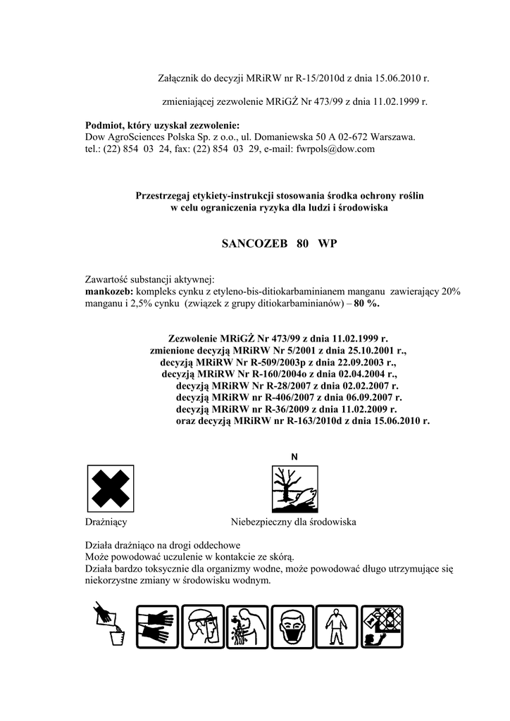 Załącznik do decyzji MRiRW nr R-15/2010d z dnia 15.06.2010 r. zmieniającej zezwolenie MRiGŻ Nr 473/99 z dnia 11.02.1999 r. Podmiot, który uzyskał zezwolenie: Dow AgroSciences Polska Sp. z o.o., ul. Domaniewska 50 A 02-672 Warszawa. tel.: (22) 854 03 24, fax: (22) 854 03 29, e-mail: [email protected] Przestrzegaj etykiety-instrukcji stosowania środka ochrony roślin w celu ograniczenia ryzyka dla ludzi i środowiska SANCOZEB 80 WP Zawartość substancji aktywnej: mankozeb: kompleks cynku z etyleno-bis-ditiokarbaminianem manganu zawierający 20% manganu i 2,5% cynku (związek z grupy ditiokarbaminianów) – 80 %. Zezwolenie MRiGŻ Nr 473/99 z dnia 11.02.1999 r. zmienione decyzją MRiRW Nr 5/2001 z dnia 25.10.2001 r., decyzją MRiRW Nr R-509/2003p z dnia 22.09.2003 r., decyzją MRiRW Nr R-160/2004o z dnia 02.04.2004 r., decyzją MRiRW Nr R-28/2007 z dnia 02.02.2007 r. decyzją MRiRW nr R-406/2007 z dnia 06.09.2007 r. decyzją MRiRW nr R-36/2009 z dnia 11.02.2009 r. oraz decyzją MRiRW nr R-163/2010d z dnia 15.06.2010 r. Drażniący Niebezpieczny dla środowiska Działa drażniąco na drogi oddechowe Może powodować uczulenie w kontakcie ze skórą. Działa bardzo toksycznie dla organizmy wodne, może powodować długo utrzymujące się niekorzystne zmiany w środowisku wodnym. 2 Uwaga! 1. Zabrania się stosowania środka w strefie bezpośredniej ochrony ujęć wody oraz na terenie uzdrowisk, otulin parków narodowych i rezerwatów. 2. Nie zanieczyszczać wód środkiem ochrony roślin lub jego opakowaniem. I OPIS DZIAŁANIA Środek grzybobójczy w formie proszku do sporządzania zawiesiny wodnej o działaniu kontaktowym do stosowania zapobiegawczego w ochronie roślin rolniczych, warzywnych, sadowniczych i ozdobnych przed chorobami grzybowymi. Działa hamująco na rozwój przędziorków. Środek przeznaczony jest do opryskiwania roślin i zaprawiania ziarna siewnego pszenicy ozimej i jarej oraz nasion warzyw w zaprawiarkach przystosowanych do suchego zaprawiania. II ZAKRES STOSOWANIA, TERMINY I DAWKI 1. ROŚLINY ROLNICZE A) PSZENICA OZIMA, PSZENICA JARA septorioza liści, septorioza plew, rdza brunatna, rdza źdźbłowa Zalecana dawka: 2 kg/ha. Zalecana ilość wody: 200-400 l/ha. Zalecane opryskiwanie: drobnokropliste. B) ZIEMNIAK zaraza ziemniaka Zalecane dawki: 2-3 kg/ha. Wyższą dawkę środka stosować w przypadku większego zagrożenia wystąpienia zarazy ziemniaka (przedłużające się opady deszczu) lub przy bujnie rozwiniętej naci ziemniaczanej. Zalecana ilość wody: 200-400 l/ha. Zalecane opryskiwanie: drobnokropliste. Środek stosować zapobiegawczo lub natychmiast po wystąpieniu pierwszych objawów choroby. Po wykonaniu pierwszego zabiegu środkiem o działaniu systemicznym lub wgłębnym, Sancozeb 80 WP stosować przemiennie z innymi fungicydami kontaktowymi. 2. ROŚLINY SADOWNICZE A) JABŁOŃ parch jabłoni Zalecana dawka: 3 kg/ha. Zalecana ilość wody: 500 – 750 l/ha. Etykieta Sancozeb 80 WP, załącznik do decyzji MRiRW 3 Środek o działaniu zapobiegawczym, można stosować przez cały sezon wegetacyjny co 7-14 dni, najlepiej nie częściej niż 2-3 razy w sezonie. drobna plamistość liści Zalecana dawka: 3 kg/ha Zalecana ilość wody: 500 – 750 l/ha Stosować w okresie różowego pąka kwiatowego oraz po kwitnieniu 2-3 krotnie w odstępach co 7-14 dni. 3) ROŚLINY WARZYWNE A) POMIDOR antraknoza, alternarioza, zaraza ziemniaka, septorioza, zgorzel podstawy łodyg, brunatna plamistość liści B) GROCH askochytoza, rdza C) FASOLA antraknoza, rdza D) BÓB askochytoza, rdza E) DYNIOWATE parch dyniowatych, antraknoza, mączniak rzekomy Zalecane dawki: 2-3 kg/ha. Zalecana ilość wody: 600-800 l/ha. Zalecane opryskiwanie – drobnokropliste UWAGA: 1. Wyższą dawkę środka stosować w przypadku większego nasilenia choroby lub na rośliny silnie wyrośnięte. 2. Środek stosować zapobiegawczo lub natychmiast po zauważęniu pierwszych objawów chrób, następnie w miarę potrzeby co 7 – 14 dni 4) ROŚLINY WARZYWNE (NASIENNE) A) BÓB, GROCH askochytoza, rdza Etykieta Sancozeb 80 WP, załącznik do decyzji MRiRW 4 B) SAŁATA mączniak rzekomy C) MARCHEW, PIETRUSZKA alternarioza, chwościk marchwi, mączniak rzekomy D) KAPUSTA, KALAFIOR alternarioza, czerń krzyżowych, mączniak rzekomy E) BURAK ĆWIKŁOWY chwościk F) CEBULA mączniak rzekomy G) POMIDOR antraknoza, alternarioza, zaraza ziemniaka, septorioza, zgorzel podstawy łodyg, brunatna plamistość liści H) DYNIOWATE parch dyniowatych, antraknoza, mączniak rzekomy Zalecane dawki: 2-3 kg/ha. Zalecana ilość wody: 200-400 l/ha. Zalecane opryskiwanie: drobnokropliste UWAGA: 1. Wyższą dawkę środka stosować w przypadku większego nasilenia choroby lub na rośliny silnie wyrośnięte. 2. Środek stosować zapobiegawczo lub natychmiast po zauważeniu pierwszych objawów chorób, następnie w miarę potrzeby co 7 – 14 dni. 5) ROŚLINY OZDOBNE (W GRUNCIE I POD OSŁONAMI) alternarioza, antraknoza, askochytoza, czarna plamistość, fuzaryjna zgnilizna,mączniak prawdziwy, mączniak rzekomy, rdza, septorioza, szara pleśń cebulowych roślin ozdobnych, zgorzel zgnilakowa Zalecane stężenie: 0,2% (200g środka w 100 litrach wody). Zalecana ilość cieczy użytkowej: 500-1000 l/ha. Środek stosować zapobiegawczo lub natychmiast po zauważeniu pierwszych objawów chorób. Etykieta Sancozeb 80 WP, załącznik do decyzji MRiRW 5 UWAGI: 1. W przypadku opryskiwania roślin pokrytych nalotem woskowym wskazane jest dodanie do cieczy użytkowej środka zwiększającego równomierność pokrycia roślin cieczą użytkową. 2. Środek stosować przemiennie z fungicydami należącymi do innych grup chemicznych. III OKRES KARENCJI okres od dnia ostatniego zabiegu do dnia zbioru roślin przeznaczonych do konsumpcji PSZENICA OZIMA I JARA – 42 DNI, ZIEMNIAK- 14 DNI, JABŁONIE - 14 DNI, GROCH, FASOLA, BÓB – 14 DNI, POMIDOR - 4 DNI, ROŚLINY DYNIOWATE – 4 DNI IV OKRES PREWENCJI DLA PSZCZÓŁ, LUDZI I ZWIERZĄT 