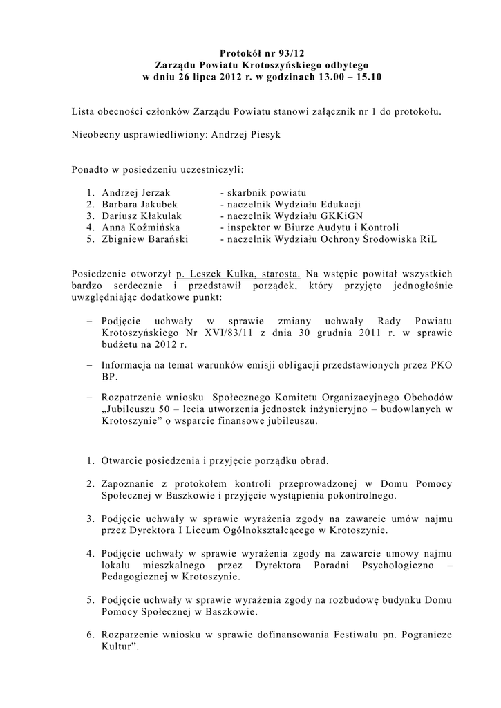 Protokół nr 93/12 Zarządu Powiatu Krotoszyńskiego odbytego w