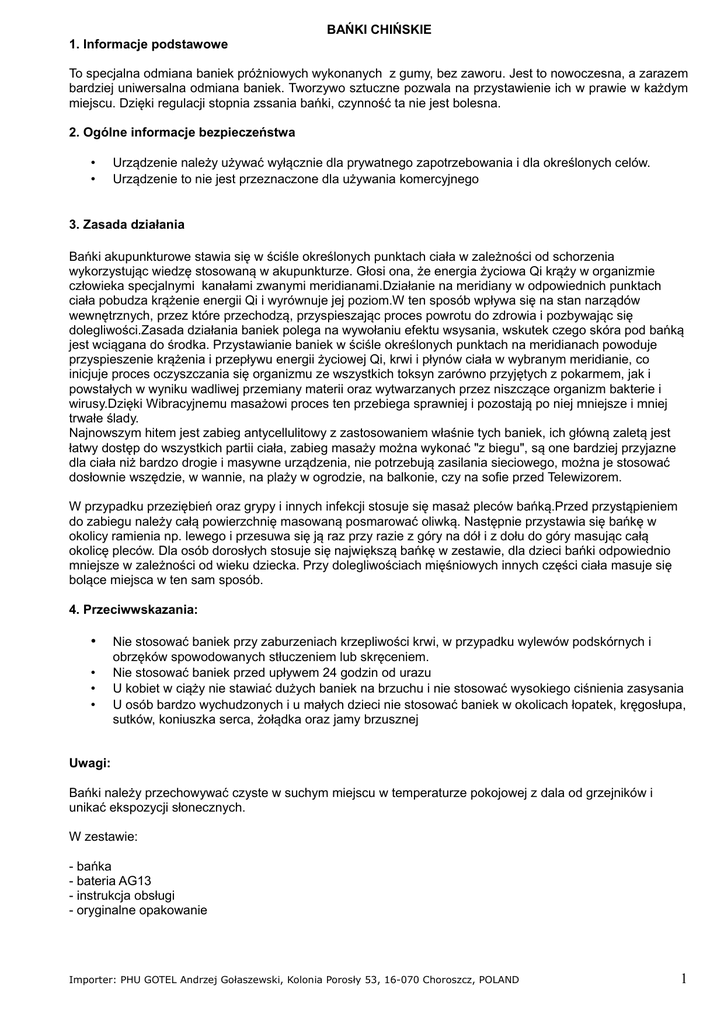 BAŃKI CHIŃSKIE 1. Informacje podstawowe To specjalna odmiana baniek próżniowych wykonanych z gumy, bez zaworu. Jest to nowoczesna, a zarazem bardziej uniwersalna odmiana baniek. Tworzywo sztuczne pozwala na przystawienie ich w prawie w każdym miejscu. Dzięki regulacji stopnia zssania bańki, czynność ta nie jest bolesna. 2. Ogólne informacje bezpieczeństwa • • Urządzenie należy używać wyłącznie dla prywatnego zapotrzebowania i dla określonych celów. Urządzenie to nie jest przeznaczone dla używania komercyjnego 3. Zasada działania Bańki akupunkturowe stawia się w ściśle określonych punktach ciała w zależności od schorzenia wykorzystując wiedzę stosowaną w akupunkturze. Głosi ona, że energia życiowa Qi krąży w organizmie człowieka specjalnymi kanałami zwanymi meridianami.Działanie na meridiany w odpowiednich punktach ciała pobudza krążenie energii Qi i wyrównuje jej poziom.W ten sposób wpływa się na stan narządów wewnętrznych, przez które przechodzą, przyspieszając proces powrotu do zdrowia i pozbywając się dolegliwości.Zasada działania baniek polega na wywołaniu efektu wsysania, wskutek czego skóra pod bańką jest wciągana do środka. Przystawianie baniek w ściśle określonych punktach na meridianach powoduje przyspieszenie krążenia i przepływu energii życiowej Qi, krwi i płynów ciała w wybranym meridianie, co inicjuje proces oczyszczania się organizmu ze wszystkich toksyn zarówno przyjętych z pokarmem, jak i powstałych w wyniku wadliwej przemiany materii oraz wytwarzanych przez niszczące organizm bakterie i wirusy.Dzięki Wibracyjnemu masażowi proces ten przebiega sprawniej i pozostają po niej mniejsze i mniej trwałe ślady. Najnowszym hitem jest zabieg antycellulitowy z zastosowaniem właśnie tych baniek, ich główną zaletą jest łatwy dostęp do wszystkich partii ciała, zabieg masaży można wykonać "z biegu", są one bardziej przyjazne dla ciała niż bardzo drogie i masywne urządzenia, nie potrzebują zasilania sieciowego, można je stosować dosłownie wszędzie, w wannie, na plaży w ogrodzie, na balkonie, czy na sofie przed Telewizorem. W przypadku przeziębień oraz grypy i innych infekcji stosuje się masaż pleców bańką.Przed przystąpieniem do zabiegu należy całą powierzchnię masowaną posmarować oliwką. Następnie przystawia się bańkę w okolicy ramienia np. lewego i przesuwa się ją raz przy razie z góry na dół i z dołu do góry masując całą okolicę pleców. Dla osób dorosłych stosuje się największą bańkę w zestawie, dla dzieci bańki odpowiednio mniejsze w zależności od wieku dziecka. Przy dolegliwościach mięśniowych innych części ciała masuje się bolące miejsca w ten sam sposób. 4. Przeciwwskazania: • • • • Nie stosować baniek przy zaburzeniach krzepliwości krwi, w przypadku wylewów podskórnych i obrzęków spowodowanych stłuczeniem lub skręceniem. Nie stosować baniek przed upływem 24 godzin od urazu U kobiet w ciąży nie stawiać dużych baniek na brzuchu i nie stosować wysokiego ciśnienia zasysania U osób bardzo wychudzonych i u małych dzieci nie stosować baniek w okolicach łopatek, kręgosłupa, sutków, koniuszka serca, żołądka oraz jamy brzusznej Uwagi: Bańki należy przechowywać czyste w suchym miejscu w temperaturze pokojowej z dala od grzejników i unikać ekspozycji słonecznych. W zestawie: - bańka - bateria AG13 - instrukcja obsługi - oryginalne opakowanie Importer: PHU GOTEL Andrzej Gołaszewski, Kolonia Porosły 53, 16-070 Choroszcz, POLAND 1 To urządzenie jest oznaczone zgodnie z Dyrektywą Europejską 2002/96/WE oraz polską Ustawą o zużytym sprzęcie elektrycznym i elektronicznym symbolem przekreślonego kontenera na odpady. Takie oznakowanie informuje, że sprzęt ten, po okresie jego użytkowania nie może być umieszczany łącznie z innymi odpadami pochodzącymi z gospodarstwa domowego. Użytkownik jest zobowiązany do oddania go prowadzącym zbieranie zużytego sprzętu elektrycznego i elektronicznego. Prowadzący zbieranie, w tym lokalne punkty zbiórki, sklepy oraz gminne jednostki, tworzą odpowiedni system umożliwiający oddanie tego sprzętu. Właściwe postępowanie ze zużytym sprzętem elektrycznym i elektronicznym przyczynia się do uniknięcia szkodliwych dla zdrowia ludzi i środowiska naturalnego konsekwencji, wynikających z obecności składników niebezpiecznych oraz niewłaściwego składowania i przetwarzania takiego sprzętu. W urządzeniu ograniczono niektóre substancje mogące negatywnie oddziaływać na środowisko w okresie użytkowania tego produktu oraz po ich zużyciu. Importer: PHU GOTEL Andrzej Gołaszewski, Kolonia Porosły 53, 16-070 Choroszcz, POLAND 2