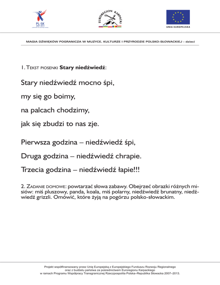 MAGIA DŹWIĘKÓW POGRANICZA W MUZYCE, KULTURZE I PRZYRODZIE POLSKO-SŁOWACKIEJ – dzieci 1. TEKST PIOSENKI Stary niedźwiedź: Stary niedźwiedź mocno śpi, my się go boimy, na palcach chodzimy, jak się zbudzi to nas zje. Pierwsza godzina – niedźwiedź śpi, Druga godzina – niedźwiedź chrapie. Trzecia godzina – niedźwiedź łapie!!! 2. ZADANIE DOMOWE: powtarzać słowa zabawy. Obejrzeć obrazki różnych misiów: miś pluszowy, panda, koala, miś polarny, niedźwiedź brunatny, niedźwiedź grizzli. Omówić, które żyją na pogórzu polsko-słowackim. Projekt współÞnansowany przez Unię Europejską z Europejskiego Funduszu Rozwoju Regionalnego oraz z budżetu państwa za pośrednictwem Euroregionu Karpackiego w ramach Programu Współpracy Transgranicznej Rzeczpospolita Polska–Republika Słowacka 2007–2013. MAGIA DŹWIĘKÓW POGRANICZA W MUZYCE, KULTURZE I PRZYRODZIE POLSKO-SŁOWACKIEJ – dzieci 2. SCHEMAT RYTMICZNO-SYLABOWY