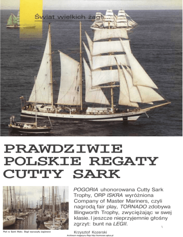 PRAWDZIWIE POLSKIE REGATY CUTTY SARK POGORIA uhonorowana Cutty Sark Trophy, ORP ISKRA wyróżniona Company of Master Mariners, czyli nagrodą fair play, TORNADO zdobywa lllingworth Trophy, zwyciężając w swej klasie. l jeszcze nieprzyjemnie głośny zgrzyt: bunt na LEGII. \ Port w Saint Malo. Stąd wyruszyły żaglowce Krzysztof Kozerski Archiwum magazynu Rejs http://kormoran.aplus.pl 21 sierpnia w duńskim Aalborgu zakończyły się trwające miesiąc kolejne Regaty Cutty Sark. Żaglowce wyruszyły z Saint Mało - w ponad 1200-milową trasę - 23 lipca, aby po drodze zawinąć do Greenock w Szkocji, Lerwick na Szetlandach i dotrzeć do Aalborga 18 sierpnia. W Regatach Cutty Sark biorą udział żaglowce i jachty podzielone na klasy: A - żaglowców rejowych, B-żaglowców z ożaglowaniem skośnym, C - jachtów (klasa podzielona dodatkowo na trzy grupy). Na starcie w Saint Mało, wśród 13 żaglowców klasy A i około 70 jachtów, stanęły polskie żaglowce ORP ISKRA, POGORIA oraz jachty LEGIA, POLSKI LEN, SMUGA CIENIA i TORNADO. Na trasie pierwszego wyścigu z Saint Malo do Greenock największy sukces odniósł TORNADO z Jacht Klubu Marynarki Wojennej „Kotwica" pod dowództwem kapitana Macieja Polańskiego. Był on pierwszy na mecie, a także wygrał swoją grupę po przeliczeniu, pokonując takie jachty jak PEN DUICK VI i ETOILE MAXI. Pomiędzy Greenock (gdzie z imprezy wycofała się LEGIA) a Lerwick nie było wyścigu, a uczestniczące jednostki pływały towarzysko, dokonując międzynarodowych wymian załóg i zwiedzając porty północnozachodniej Szkocji. W tej części imprezy, z powodu awarii silnika na Kanale Kaledońskim, nie dopłynął do Lerwick na start drugiego wyścigu POLSKI LEN. Zjawił się on dopiero na zakończeniu imprezy wAalborgu. TORNADO podczas drugiego wyścigu z Lerwick do Aalborga przypłynął na drugim miejscu za PEN DUICKIEM VI z Francji, utrzymując w ten sposób pierwsze miejsce po obu wyścigach. Na mecie Regat spotkało się siedemdziesiąt żaglowców z piętnastu krajów. Na ich pokładach znajdowało się trzy tysiące trzystu członków załóg, a zacumowane w Aalborgu jednostki przez cztery dni obejrzało około siedmiuset tysięcy widzów. W parku miejskim w Aalborgu książę Fryderyk wręczył nagrody biorącym udział w regatach. Najważniejsza - Cutty Sark Trophy przypadła w udziale naszej POGORII, której załoga, w opinii kapitanów i załóg innych jednostek, wniosła największy wkład w budowę międzynarodowej przyjaźni i marynarskiej solidarności. lllingworth Trophy, przyznawane za zajęcie w regatach najlepszego miejsca w klasie C III, otrzymał nasz TORNADO z Jacht Klubu Marynarki Wojennej „Kotwica". Wiele radości sprawiła nam także ORP ISKRA, którą wyróżniono nagrodą honorową Company of Master Mariners (nagroda „fair play"), przyznawaną za umiejętności żeglarskie. ORP ISKRA została uhonorowana tą nagrodą za długodystansowe holowanie holenderskiego jachtu po zakończeniu regat. Radości z tych sukcesów nie mógł z m ą c i ć jedyny polski zgrzyt mianowicie bunt na LEGII. Fot. Ajs Nielsen Książę Fryderyk wręcza nagrodę Cutty Sark Trophy fi Zatoga POGORII ze swoim trofeum Archiwum magazynu Rejs http://kormoran.aplus.pl