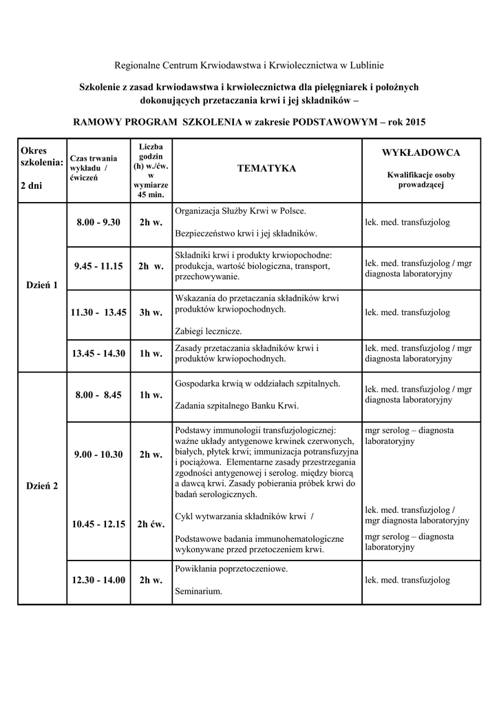 Regionalne Centrum Krwiodawstwa i Krwiolecznictwa w Lublinie Szkolenie z zasad krwiodawstwa i krwiolecznictwa dla pielęgniarek i położnych dokonujących przetaczania krwi i jej składników – RAMOWY PROGRAM SZKOLENIA w zakresie PODSTAWOWYM – rok 2015 Okres szkolenia: Czas trwania 2 dni wykładu / ćwiczeń Liczba godzin (h) w./ćw. w wymiarze 45 min. WYKŁADOWCA TEMATYKA Kwalifikacje osoby prowadzącej Organizacja Służby Krwi w Polsce. 8.00 - 9.30 lek. med. transfuzjolog 2h w. Bezpieczeństwo krwi i jej składników. 9.45 - 11.15 2h w. Dzień 1 11.30 - 13.45 3h w. Składniki krwi i produkty krwiopochodne: produkcja, wartość biologiczna, transport, przechowywanie. lek. med. transfuzjolog / mgr diagnosta laboratoryjny Wskazania do przetaczania składników krwi produktów krwiopochodnych. lek. med. transfuzjolog Zabiegi lecznicze. 13.45 - 14.30 1h w. 8.00 - 8.45 1h w. Zasady przetaczania składników krwi i produktów krwiopochodnych. Gospodarka krwią w oddziałach szpitalnych. Zadania szpitalnego Banku Krwi. 9.00 - 10.30 2h w. Dzień 2 10.45 - 12.15 2h ćw. lek. med. transfuzjolog / mgr diagnosta laboratoryjny lek. med. transfuzjolog / mgr diagnosta laboratoryjny Podstawy immunologii transfuzjologicznej: mgr serolog – diagnosta ważne układy antygenowe krwinek czerwonych, laboratoryjny białych, płytek krwi; immunizacja potransfuzyjna i pociążowa. Elementarne zasady przestrzegania zgodności antygenowej i serolog. między biorcą a dawcą krwi. Zasady pobierania próbek krwi do badań serologicznych. Cykl wytwarzania składników krwi / lek. med. transfuzjolog / mgr diagnosta laboratoryjny Podstawowe badania immunohematologiczne wykonywane przed przetoczeniem krwi. mgr serolog – diagnosta laboratoryjny Powikłania poprzetoczeniowe. 12.30 - 14.00 2h w. lek. med. transfuzjolog Seminarium. Regionalne Centrum Krwiodawstwa i Krwiolecznictwa w Lublinie Szkolenie z zasad krwiodawstwa i krwiolecznictwa dla pielęgniarek i położnych dokonujących przetaczania krwi i jej składników – RAMOWY PROGRAM SZKOLENIA w zakresie UZUPEŁNIAJĄCYM – rok 2015 Okres szkolenia: Czas trwania 1 dzień wykładu / ćwiczeń Liczba godzin (h) w./ćw. w wymiarze 45 min. WYKŁADOWCA TEMATYKA Kwalifikacje osoby prowadzącej Organizacja Służby Krwi w Polsce. 8.00 - 9.30 2h w. Bezpieczeństwo krwi i jej składników. lek. med. transfuzjolog Wskazania do przetaczania składników krwi i produktów krwiopochodnych. Składniki krwi i produkty krwiopochodne: produkcja, wartość biologiczna, transport, przechowywanie. 9.35 - 11.50 3h w. Zasady przetaczania składników krwi i produktów krwiopochodnych. lek. med. transfuzjolog / mgr diagnosta laboratoryjny Gospodarka krwią w oddziałach szpitalnych. Dzień 1 Zadania szpitalnego Banku Krwi. 1h w. Immunologia transfuzjologiczna. 1h ćw. Cykl wytwarzania składników krwi. mgr serolog - diagnosta laboratoryjny 11.55 - 13.25 lek. med. transfuzjolog / mgr diagnosta laboratoryjny Zabiegi lecznicze. 13.30 - 15.00 2h w. Powikłania poprzetoczeniowe. Seminarium. lek. med. transfuzjolog