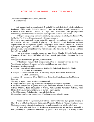 KONKURS MISTRZOWIE „ DOBRYCH MANIER” „Grzeczność nie jest nauką łatwą, ani małą” A. Mickiewicz Już po raz drugi w naszej szkole 7 maja 2015r. odbył się finał międzyszkolnego konkursu „Mistrzowie dobrych manier”. Jest to konkurs współorganizowany z Klubem Rotary Gdynia Orłowo, a jego ideą przewodnią jest propagowanie kulturalnego zachowania się w różnych sytuacjach na co dzień i od święta. W tegorocznej edycji konkursu spotkały się drużyny z 8 szkół gdyńskich : SP 6, 8, 10, 16, 17, 40 oraz Gimnazjum nr 2 i Gimnazjum nr 4. Uczniowie zaprezentowali swoje autorskie pomysły na zachęcanie do kulturalnego zachowania: wiersze, piosenki i plakaty . W drugiej części konkursu drużyny odpowiadały na szczegółowe pytania dotyczące zasad savoir vivre’u w różnych sytuacjach życiowych. Okazało się, że uczestnicy konkursu są bardzo dobrze przygotowani. Czasami jednak były wątpliwości, jako że nauka ta wcale nie jest taka łatwa !!! ani mała !!! Nad wszystkim czuwało szacowne jury: Panie Claudia Filippi-Chodorowska (Honorowy Konsul Republiki Włoskiej), Ewa Łukasik (polonistka, długoletni dyrektor szkoły) i Małgorzata Sokołowska (pisarka, dziennikarka). W konkursie wszyscy byli zwycięzcami. Była to i nauka i wspólna zabawa. Wyróżniono najlepszych uczniów dyplomami i licznymi nagrodami. Laureatami konkursu zostali: ● miejsce I – uczniowie Gimnazjum nr 4 (Klaudia Bekalarek, Dominika Płotka i Gustaw Matuszewski) ● miejsce II – uczniowie SP nr 17 (Konstancja Frycz, Aleksandra Wierzbicka i Jakub Leżohupski) ● miejsce III – uczniowie SP nr 8 (Wiktoria Tokarska, Maja Baranowska, Mateusz Bzoma) Nagrody w tegorocznym konkursie ufundowali: ● Urząd Miasta Gdyni – gry planszowe rozwijające kreatywne myślenie ● Muzeum Marynarki Wojennej w Gdyni, Akademia Morska w Gdyni, Klub Rotary Gdynia Orłowo, Teatr Muzyczny w Gdyni, Park Kolibki Adventure Gdynia, Kino Helios Gdynia, restauracja Kotwica w Gdyni – zaproszenia ● Pani Małgorzata Sokołowska – nagrody książkowe Uczestnikom serdecznie gratulujemy. Fundatorom nagród dziękujemy. Nasza szkoła w tegorocznym konkursie reprezentowana była przez drużynę z klasy I a, w składzie: Klaudia Bekalarek, Dominika Płotka i Gustaw Matuszewski. Nasi reprezentanci okazali się najlepsi we współzawodnictwie międzyszkolnym. W tym roku szkolnym do konkursu przygotowywały się drużyny wszystkich klas pierwszych. Spotkania odbywały się przez kilka miesięcy i w różnej formie wspólnie poznawaliśmy zasady dobrych manier. Czytaliśmy literaturę, dzieliliśmy się swoją wiedzą. Byliśmy na zajęciach edukacyjnych w Zespole Szkół HotelarskoGastronomicznych, gdzie pod okiem maturzystów nasze drużyny ćwiczyły sztukę nakrywania stołów i poznawały ważne zasady zachowania się przy stole. Wspólnie bawiliśmy się także odgrywając różne życiowe scenki, pod okiem Pani Ireny Matczak. Podczas zajęć drużyny robiły plakat, który w formie „uśmiechniętej” był zbiorem najważniejszych zasad savoir vivre’u. 29.04.2015r, odbył się etap szkolny konkursu. Wszystkie drużyny bardzo dobrze się przygotowały, różnice w punktacji były niewielkie. I miejsce przypadło drużynie z klasy I a, drugie miejsce: drużynom z klas I b (Mateusz Galas, Szymon Pierog, Alicja Gajek) i I e (Karolina Stolc, Paulina Zaborowska, Aleksandra Homza), trzecie miejsce klasom I c (Łukasz Kozerski, Maciej Guzek, Natalia Sidor) i Id (Kinga Bonder, Krystian Palach, Patryk Orzechowski). Wyróżnienie uzyskała Kinga Bonder z klasy I d. za szczególne zaangażowanie i wkład pracy. Konkurs odbył się dzięki pracy wielu nauczycieli i uczniów. Podziękowania za przygotowanie kierujemy do Pani Katarzynie Kozery, która przygotowała scenariusz i pytania do etapu szkolnego i międzyszkolnego. Pomagali: Pani Aleksandra Kornacka, Irena Matczak, Halina Masłowska, Alina Zielińska, Marzena Łockiewicz, Radosław Masłowski, Bartłomiej Szczypczyk. Uczniowie Agata Grożyńska i Alan Mordyl z klasy II b, Tomasz Sobijanek i Kamil Pałubicki z klasy III b, Maciej Głowacki i Alan Wittbrodt z klasy III a, Zuzanna Wittbrodt, Natalia Kucner z klasy I a. Podziękowania także dla administracji szkolnej i uczniów SU za pomoc przy organizacji. Zapraszamy za rok !!!!