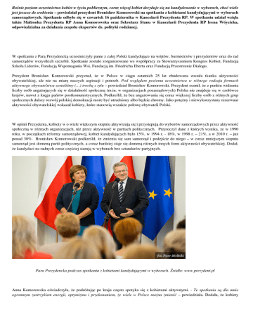 Rośnie poziom uczestnictwa kobiet w życiu publicznym, coraz więcej kobiet decyduje się na kandydowanie w wyborach, choć wiele jest jeszcze do zrobienia – powiedział prezydent Bronisław Komorowski na spotkaniu z kobietami kandydującymi w wyborach samorządowych. Spotkanie odbyło się w czwartek 16 października w Kancelarii Prezydenta RP. W spotkaniu udział wzięła także Małżonka Prezydenta RP Anna Komorowska oraz Sekretarz Stanu w Kancelarii Prezydenta RP Irena Wóycicka, odpowiedzialna za działania zespołu ekspertów ds. polityki rodzinnej. W spotkaniu z Parą Prezydencką uczestniczyły panie z całej Polski kandydujące na wójtów, burmistrzów i prezydentów oraz do rad samorządów wszystkich szczebli. Spotkanie zostało zorganizowane we współpracy ze Stowarzyszeniem Kongres Kobiet, Fundacją Szkoła Liderów, Fundacją Wspomagania Wsi, Fundacją im. Friedricha Eberta oraz Fundacją Przestrzenie Dialogu. Prezydent Bronisław Komorowski przyznał, że w Polsce w ciągu ostatnich 25 lat zbudowana została tkanka aktywności obywatelskiej, ale nie na miarę naszych aspiracji i potrzeb. Pod względem poziomu uczestnictwa w różnego rodzaju formach aktywnego obywatelstwa zostaliśmy (…) trochę z tyłu – powiedział Bronisław Komorowski. Prezydent ocenił, że z punktu widzenia liczby osób angażujących się w działalność społeczną (m.in. w organizacjach pozarządowych) Polska nie znajduje się w czołówce krajów, nawet z kręgu państw postkomunistycznych. Podkreślił, że bez angażowania się coraz większej liczby osób z różnych grup społecznych dalszy rozwój polskiej demokracji może być utrudniony albo będzie chromy. Jako potężny i niewykorzystany rezerwuar aktywności obywatelskiej wskazał kobiety, które stanowią wszakże połowę obywateli Polski. W opinii Prezydenta, kobiety w o wiele większym stopniu aktywizują się i przystępują do wyborów samorządowych przez aktywność społeczną w różnych organizacjach, niż przez aktywność w partiach politycznych. Przytoczył dane z których wynika, że w 1990 roku, w początkach reformy samorządowej, kobiet kandydujących było 15%, w 1994 r. - 18%, w 1998 r. – 21%, a w 2010 r. – już ponad 30%. Bronisław Komorowski podkreślił, że zmienia się sam samorząd i podejście do niego – w coraz mniejszym stopniu samorząd jest domeną partii politycznych, a coraz bardziej staje się domeną różnych innych form aktywności obywatelskiej. Dodał, że kandydaci na radnych coraz częściej starują w wyborach bez sztandarów partyjnych. Para Prezydencka podczas spotkania z kobietami kandydującymi w wyborach. Źródło: www.prezydent.pl Anna Komorowska oświadczyła, że podróżując po kraju często spotyka się z kobietami aktywnymi. - Te spotkania są dla mnie ogromnym zastrzykiem energii, optymizmu i przekonaniem, że wiele w Polsce można zmienić – powiedziała. Dodała, że kobiety swoim zaangażowaniem dają przykład także córkom i synom, że warto być aktywnym. - Panie pokazują to praktyce - dodała. Po wystąpieniu Pary Prezydenckiej głos zabrała prof. Małgorzata Fuszara, Pełnomocnik Rządu ds. Równego Statusu Kobiet i Mężczyzn, która potwierdziła, że niewątpliwie stratą społeczną jest niewykorzystany potencjał kobiet, często świetnie wykształconych. Według statystyk ze wszystkich szczebli samorządu najmniej kobiet działa w powiatach, zaś w organach wykonawczych (na stanowiskach wójtów, burmistrzów, prezydentów) ich odsetek wynosi tylko 9%. Prof. Joanna Regulska z Uniwersytetu Rutgersa (Nowy Brunszwik, Stany Zjednoczone), która wystąpiła wspólnie z prof. Małgorzatą Fuszarą, podkreśliła, że mimo iż udział kobiet w życiu publicznym rośnie, to bariery, które napotykają kobiety nie zmieniły się od 25 lat. Są to m.in. bariery obyczajowe czy systemowe. Kobietom często trudno jest pogodzić obowiązki rodzinne z aktywnym życiem publicznym. Na niekorzyść kobiet działają także stereotypy, które mówią iż ich obecność w polityce głównie „łagodzi obyczaje” (bez doceniania ich wiedzy merytorycznej). Kobiety zazwyczaj są także skromne i nie chwalą się swoimi osiągnięciami. Po wystąpieniach wprowadzających, uczestniczki spotkały się w czterech grupach, by porozmawiać o przygotowaniach do zbliżających się wyborów samorządowych. Pierwsza grupa przeznaczona była dla kobiet kandydujących na wójtów, burmistrzów i prezydentów. Dyskusję moderowała Dorota Warakomska. Udział w dyskusji wzięły Hanna Gronkiewicz-Waltz – Prezydent m.st. Warszawy, Elżbieta Polak – Marszałkini Województwa Lubuskiego oraz Helena Żukowska– Wójcina Gminy Kowale Oleckie. W drugiej grupie spotkały się kandydatki do rad gmin. Dyskusja moderowana była przez Beatę Jakoniuk-Wojcieszak i odbyła się z udziałem Katarzyny Knopik – Radnej Miasta Kościerzyny, Jolanty Kwiatkowskiej – Wójciny Gminy Stegna oraz Bożeny Dominiak – Wójciny Gminy Grzegorzew. Grupa trzecia przeznaczona była dla pań kandydujących do rad gmin (okręgi wielomandatowe). Dyskusja moderowana była przez Renatę Kim, a udział w niej wzięły Dorota Chałat – Radna Miejska Koszalina, Agnieszka Odachowska – Z-czyni Burmistrza w Urzędzie Miejskim w Pyrzycach oraz Małgorzata Chrapek – Wójcina Gminy Wieprz. W czwartej grupie spotkały się kandydatki do rad powiatu i województwa. Dyskusja moderowana przez Beatę Maciejewską odbyła się z udziałem Olgi Krzyżanowskiej – Radnej Społecznej przy Rzeczniku Praw Obywatelskich, Małgorzaty Tkacz-Janik – Radnej Sejmiku Śląskiego oraz Alicji Wąsik – Radnej powiatu olsztyńskiego. Dyskusja kobiet kandydujących do rad gmin (okręgi wielomandatowe). Dyskusja moderowana przez Renatę Kim z udziałem: Doroty Chałat – Radnej Miejskiej Koszalina, Agnieszki Odachowskiej –Zastępczyni Burmistrza w Urzędzie Miejskim w Pyrzycach oraz Małgorzaty Chrapek – Wójciny Gminy W