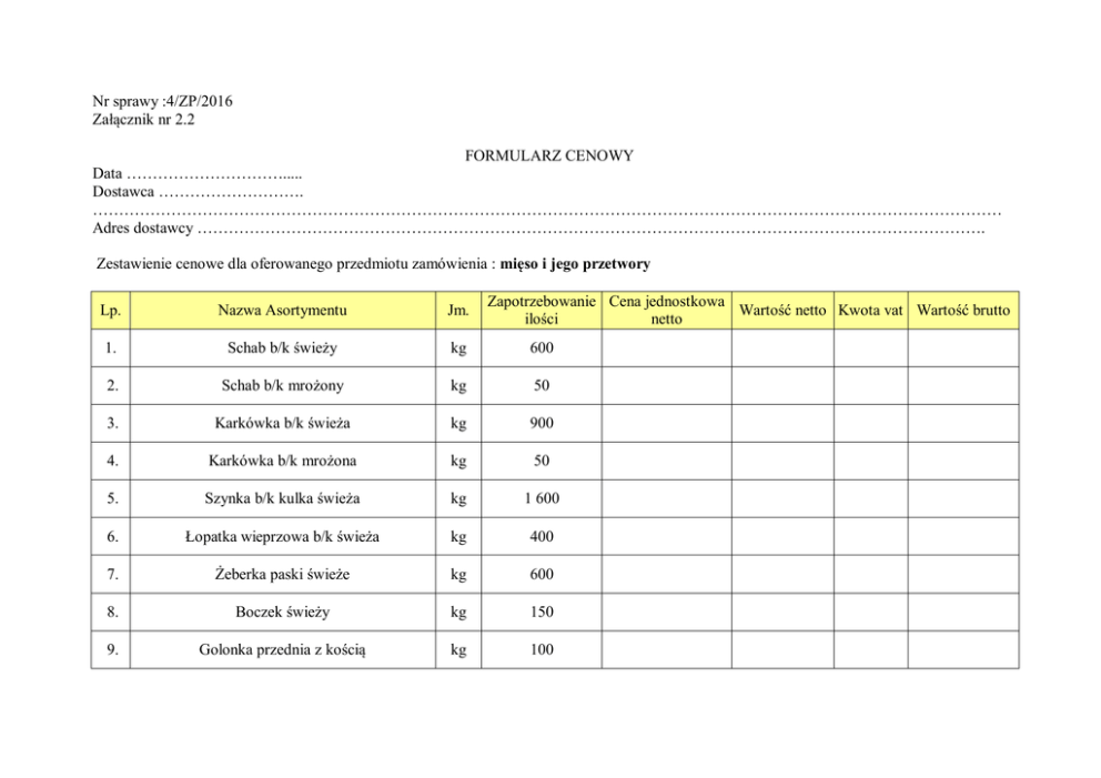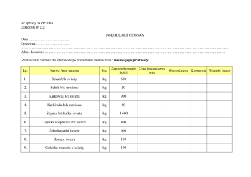 Nr sprawy :4/ZP/2016 Załącznik nr 2.2 FORMULARZ CENOWY Data …………………………..... Dostawca ………………………. ………………………………………………………………………………………………………………………………………………………… Adres dostawcy ……………………………………………………………………………………………………………………………………. Zestawienie cenowe dla oferowanego przedmiotu zamówienia : mięso i jego przetwory Zapotrzebowanie Cena jednostkowa Wartość netto Kwota vat Wartość brutto ilości netto Lp. Nazwa Asortymentu Jm. 1. Schab b/k świeży kg 600 2. Schab b/k mrożony kg 50 3. Karkówka b/k świeża kg 900 4. Karkówka b/k mrożona kg 50 5. Szynka b/k kulka świeża kg 1 600 6. Łopatka wieprzowa b/k świeża kg 400 7. Żeberka paski świeże kg 600 8. Boczek świeży kg 150 9. Golonka przednia z kością kg 100 10. Polędwiczki wieprzowe świeże kg 30 11. Polędwica wołowa świeża kg 20 12. Wołowina extra świeża kg 120 13. Filet drobiowy świeży kg 1 500 14. Filet drobiowy mrożony kg 50 15. Filet indyczy świeży kg 20 16. Udziec z indyka świeży kg 20 17. Pałki drobiowe świeże kg 700 18. Udo drobiowe świeże kg 1 600 19. Skrzydełka drobiowe świeże kg 900 20. Wątróbka drobiowa świeża kg 300 21. Porcje rosołowe drobiowe świeże kg 650 22. Słonina świeża kg 150 23. Flaki wołowe gotowane kg 100 24. Kiełbasa biała surowa wieprzowa kg 300 25. Boczek wędzony parzony rolowany kg 90 26. Boczek wędzony parzony kg 300 27. Kiełbasa śląska kg 900 28. Szynka wieprzowa gotowana babuni kg 150 29. Szynka wieprzowa gotowana kg 600 30. Kiełbasa podwawelska kg 150 31. Baleron tradycyjny kg 180 32. Polędwica sopocka kg 450 33. Ogonówka parzona kg 450 34. Wędzonka tradycyjna kg 420 35. Kiełbasa żywiecka sucha kg 180 36. Szynka delikatesowa z kurcząt kg 80 37. Polędwica surowa wędzona kg 20 38. Polędwica z kurcząt kg 165 39. Schab drobiowy w majeranku kg 50 40. Filet z indyka pieczony formowany kg 160 41. Krakowska sucha kg 220 42. Salami koszalińskie kg 200 43. Kabanosy drobiowe extra kg 20 44. Kabanosy wieprzowe extra kg 20 45. Kiełbasa jałowcowa sucha kg 20 46. Kiełbasa myśliwska sucha kg 20 47. Kiełbasa polska surowa kg 20 48. Kaszanka kg 200 49. Pasztetowa podwędzana kg 30 50. Pieczeń wieprzowa zapiekana kg 40 51. Pasztet zapiekany- różne smaki firmowy naturalny, z grzybami, ze śliwką, pietruszką kg 350 52. Przysmak wieprzowy w galarecie kg 120 53. Szynka konserwowa prasowana kg 40 54. Szynka wieprzowa gotowana wiśniowa kg 120 55. 56. 57. Szynka mielona tyrolska Parówki cielęce Zawartość mięsa 83 % Parówki wieprzowe hot-dog typu"Pawełki" Zawartość mięsa 60 % 58. Parówka serdelka Razem …………………..dnia ………………..2016 r. /miejscowość/ Podpis i pieczęć osoby/osób reprezentujących Wykonawcę …………………………………………………………….. kg 30 kg 1 200 kg 60 kg 250