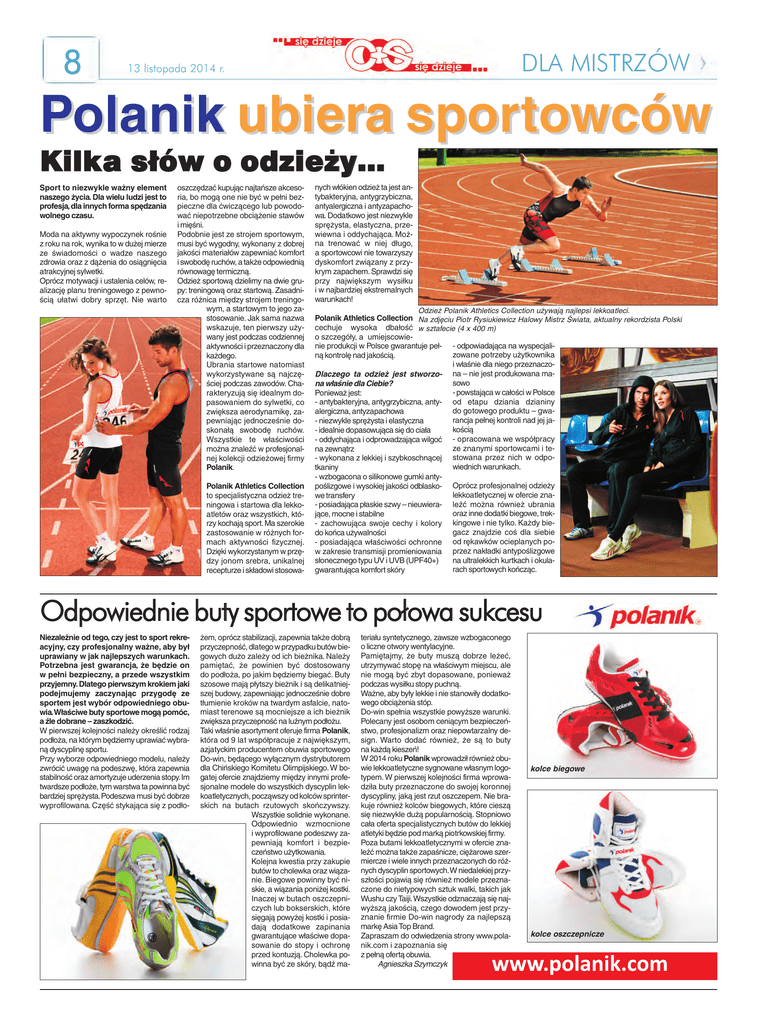8 16 13 listopada 2014 r. DLA MISTRZÓW 18 września 2014 r. Polanik ubierP aolanik spor topoma wcówga Kilka słów o odzieży… Sport to niezwykle ważny element naszego życia. Dla wielu ludzi jest to profesja, dla innych forma spędzania wolnego czasu. Moda na aktywny wypoczynek rośnie z roku na rok, wynika to w dużej mierze ze świadomości o wadze naszego zdrowia oraz z dążenia do osiągnięcia atrakcyjnej sylwetki. Oprócz motywacji i ustalenia celów, realizację planu treningowego z pewnością ułatwi dobry sprzęt. Nie warto oszczędzać kupując najtańsze akcesoria, bo mogą one nie być w pełni bezpieczne dla ćwiczącego lub powodować niepotrzebne obciążenie stawów i mięśni. Podobnie jest ze strojem sportowym, musi być wygodny, wykonany z dobrej jakości materiałów zapewniać komfort i swobodę ruchów, a także odpowiednią równowagę termiczną. Odzież sportową dzielimy na dwie grupy: treningową oraz startową. Zasadnicza różnica między strojem treningowym, a startowym to jego zastosowanie. Jak sama nazwa wskazuje, ten pierwszy używany jest podczas codziennej aktywności i przeznaczony dla każdego. Ubrania startowe natomiast wykorzystywane są najczęściej podczas zawodów. Charakteryzują się idealnym dopasowaniem do sylwetki, co zwiększa aerodynamikę, zapewniając jednocześnie doskonałą swobodę ruchów. Wszystkie te właściwości można znaleźć w profesjonalnej kolekcji odzieżowej firmy Polanik. Polanik Athletics Collection to specjalistyczna odzież treningowa i startowa dla lekkoatletów oraz wszystkich, którzy kochają sport. Ma szerokie zastosowanie w różnych formach aktywności fizycznej. Dzięki wykorzystanym w przędzy jonom srebra, unikalnej recepturze i składowi stosowa- Był piątkowy deszczowy wieczór, kiedy na stadionie lekkoatletycznym w Zurychu do koła po raz trzeci nych włókien odzież ta jest antybakteryjna, antygrzybiczna, antyalergiczna i antyzapachowa. Dodatkowo jest niezwykle sprężysta, elastyczna, przewiewna i oddychająca. Można trenować w niej długo, a sportowcowi nie towarzyszy dyskomfort związany z przykrym zapachem. Sprawdzi się przy największym wysiłku i w najbardziej ekstremalnych warunkach! wchodziła murowana faworytka do złotego medalu w rzucie młotem – Anita Włodarczyk. Jak do tej pory konkurs o Mistrzostwo Europy nie układał się po jej myśli. Dwie wcześniejsze próby wyrzucone poza promień powodowały, że był to rzut decydujący o być albo nie być Polki w konkursie. W przypadku pomyłki na- Kilka dni później odbywa się kolejna wy sza faworytka pożegnała- jątkowa impreza: 5. Memoriał Kami Skolimowskiej. W kole wicemistrz Eu by się z rywalizacją. Skoncentrowana Anita ropy Paweł Fajdek. Wykonuje kolejn Odzież Polanik Athletics Collection używają najlepsi lekkoatleci. dobry rzut i posyła młot Polanik Pre Włodarczyk rozpoczęła Polanik Athletics Collection Na zdjęciu Piotr Rysiukiewicz Halowy Mistrz Świata, aktualny rekordzista Polski swoją próbę... jeden obrót, mium Line na imponującą odległość 8 cechuje wysoka dbałość w sztafecie (4 x 400 m) drugi, trzeci, czwarty... młot metrów i 48 centymetrów! Tym samym o szczegóły, a umiejscowiepiotrkowskiej firmy „Pola- młotem Ziolkowski Hammer Black po nie produkcji w Polsce gwarantuje peł- - odpowiadająca na wyspecjalinik” poszybował wysoko prawił 13-letni rekord Polski… Szymo zowane potrzeby użytkownika ną kontrolę nad jakością. w górę i przeleciał blisko 76 na Ziółkowskiego, który wyno i właśnie dla niego przeznaczoWynik 75,88 dał sił 83,38 m. maDlaczego ta odzież jest stworzo- na – nie jest produkowanametrów. Anicie Włodarczyk prowa- – Jestem w szoku, nie myślałem o tym sowo na właśnie dla Ciebie? dzenie i praktycznie za- że dziś mogę rzucić sześć razy powy - powstająca w całości w Polsce Ponieważ jest: pewnił Mistrzostwo Europy. żej 80 metrów. Nie wiem jak to się stało - antybakteryjna, antygrzybiczna, anty- od etapu dziania dzianiny tym jednak nasza za- że młot poleciał tak daleko, bo prze do gotowego produktu – Na gwaalergiczna, antyzapachowa wodniczka nie poprzestała ostatnie dni najczęściej leżałem w łóżk rancja pełnej kontroli nad jej ja- niezwykle sprężysta i elastyczna i w każdej próbie piotrkow- i miałem tylko dwa rozruchy.Dla mnie t kością - idealnie dopasowująca się do ciała ski młot wyrzucała coraz kosmos, co dzisiaj zrobiłem – mówił Pa - oddychająca i odprowadzająca wilgoć - opracowana we współpracy ze znanymi sportowcamidalej. i te- Ostatecznie wyni- weł Fajdek, jako świeżo upieczony re na zewnątrz kiem 78,76 m poprawiła re- kordzista Polski w rzucie młotem. - wykonana z lekkiej i szybkoschnącej stowana przez nich w odpokord mistrzostw Europy, re- Memoriał obfitował w emocjonując wiednich warunkach. tkaniny kord Polski oraz swój wła- wydarzenia, takie jak wspominany re - wzbogacona o silikonowe gumki antysny najlepszy w tym sezo- kord Polski Pawła Fajdka czy 9,9 poślizgowe i wysokiej jakości odblasko- Oprócz profesjonalnej odzieży wynik na świecie i zdo- na 100 m Usaina Bolta, a wszystk lekkoatletycznej w ofercienie znawe transfery przy żywiołowym dopingu 20 000 kib była złoto. - posiadająca płaskie szwy – nieuwiera- leźć można również ubrania ców zgromadzonych na Stadionie Na oraz inne dodatki biegowe, trekjące, mocne i stabilne rodowym w Warszawie. Polanik jak źródło: www.piotrkow.pl - zachowująca swoje cechy i kolory kingowe i nie tylko. Każdy bieFoto: zbiory własne Anity gacz Włodarczyk Sponsor i Dostawca sprzętu na 5. Me znajdzie coś dla siebie do końca używalności - posiadająca właściwości ochronne od rękawków ocieplanych pow zakresie transmisji promieniowania przez nakładki antypoślizgowe na ultralekkich kurtkach i okulasłonecznego typu UV i UVB (UPF40+) rach sportowych kończąc. gwarantująca komfort skóry Odpowiednie buty sportowe