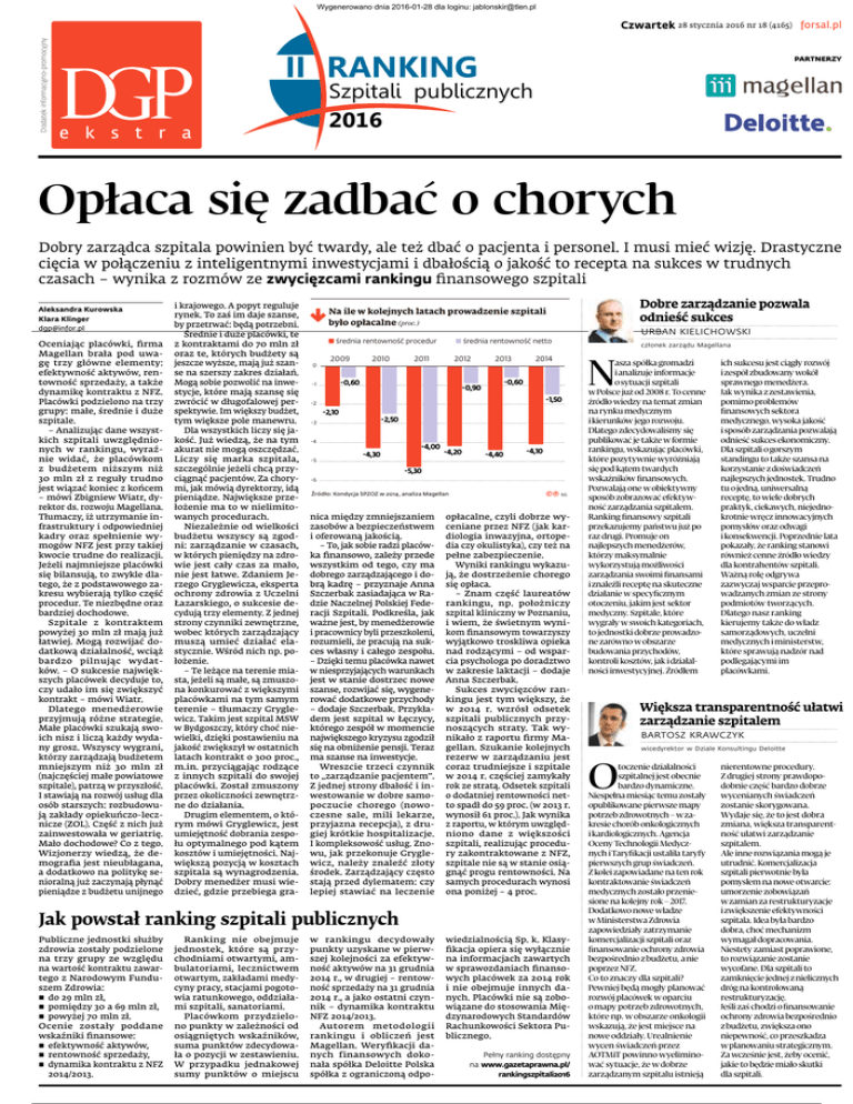 [email protected] Wygenerowano dnia 2016-01-28 dla loginu: [email protected] Dodatek informacyjno-promocyjny Czwartek 28 stycznia 2016 nr 18 (4165) forsal.pl partnerzy II RANKING Szpitali publicznych 2016 e k s t r a Opłaca się zadbać o chorych Dobry zarządca szpitala powinien być twardy, ale też dbać o pacjenta i personel. I musi mieć wizję. Drastyczne cięcia w połączeniu z inteligentnymi inwestycjami i dbałością o jakość to recepta na sukces w trudnych czasach – wynika z rozmów ze zwycięzcami rankingu finansowego szpitali Aleksandra Kurowska Klara Klinger [email protected] Oceniając placówki, firma Magellan brała pod uwagę trzy główne elementy: efektywność aktywów, rentowność sprzedaży, a także dynamikę kontraktu z NFZ. Placówki podzielono na trzy grupy: małe, średnie i duże szpitale. – Analizując dane wszystkich szpitali uwzględnionych w rankingu, wyraźnie widać, że placówkom z budżetem niższym niż 30 mln zł z reguły trudno jest wiązać koniec z końcem – mówi Zbigniew Wiatr, dyrektor ds. rozwoju Magellana. Tłumaczy, iż utrzymanie infrastruktury i odpowiedniej kadry oraz spełnienie wymogów NFZ jest przy takiej kwocie trudne do realizacji. Jeżeli najmniejsze placówki się bilansują, to zwykle dlatego, że z podstawowego zakresu wybierają tylko część procedur. Te niezbędne oraz bardziej dochodowe. Szpitale z kontraktem powyżej 30 mln zł mają już łatwiej. Mogą rozwijać dodatkową działalność, wciąż bardzo pilnując wydatków. – O sukcesie największych placówek decyduje to, czy udało im się zwiększyć kontrakt – mówi Wiatr. Dlatego menedżerowie przyjmują różne strategie. Małe placówki szukają swoich nisz i liczą każdy wydany grosz. Wszyscy wygrani, którzy zarządzają budżetem mniejszym niż 30 mln zł (najczęściej małe powiatowe szpitale), patrzą w przyszłość. I stawiają na rozwój usług dla osób starszych: rozbudowują zakłady opiekuńczo-lecznicze (ZOL). Część z nich już zainwestowała w geriatrię. Mało dochodowe? Co z tego. Wizjonerzy wiedzą, że demografia jest nieubłagana, a dodatkowo na politykę senioralną już zaczynają płynąć pieniądze z budżetu unijnego i krajowego. A popyt reguluje rynek. To zaś im daje szanse, by przetrwać: będą potrzebni. Średnie i duże placówki, te z kontraktami do 70 mln zł oraz te, których budżety są jeszcze wyższe, mają już szanse na szerszy zakres działań. Mogą sobie pozwolić na inwestycje, które mają szansę się zwrócić w długofalowej perspektywie. Im większy budżet, tym większe pole manewru. Dla wszystkich liczy się jakość. Już wiedzą, że na tym akurat nie mogą oszczędzać. Liczy się marka szpitala, szczególnie jeżeli chcą przyciągnąć pacjentów. Za chorymi, jak mówią dyrektorzy, idą pieniądze. Największe przełożenie ma to w nielimitowanych procedurach. Niezależnie od wielkości budżetu wszyscy są zgodni: zarządzanie w czasach, w których pieniędzy na zdrowie jest cały czas za mało, nie jest łatwe. Zdaniem Jerzego Gryglewicza, eksperta ochrony zdrowia z Uczelni Łazarskiego, o sukcesie decydują trzy elementy. Z jednej strony czynniki zewnętrzne, wobec których zarządzający muszą umieć działać elastycznie. Wśród nich np. położenie. – Te leżące na terenie miasta, jeżeli są małe, są zmuszona konkurować z większymi placówkami na tym samym terenie – tłumaczy Gryglewicz. Takim jest szpital MSW w Bydgoszczy, który choć niewielki, dzięki postawieniu na jakość zwiększył w ostatnich latach kontrakt o 300 proc., m.in. przyciągając rodzące z innych szpitali do swojej placówki. Został zmuszony przez okoliczności zewnętrzne do działania. Drugim elementem, o którym mówi Gryglewicz, jest umiejętność dobrania zespołu optymalnego pod kątem kosztów i umiejętności. Największą pozycją w kosztach szpitala są wynagrodzenia. Dobry menedżer musi wiedzieć, gdzie przebiega gra- URBAN KIELICHOWSKI ■ średnia rentowność procedur ■ średnia rentowność netto 2009 2012 2010 2011 2013 2014 0 -0,60 -0,60 -1 -0,90 -1,50 -2 -2,10 -2,50 -3 -4 -4,00 -4,30 -4,20 -4,40 -4,10 -5 -5,30 -6 Źródło: Kondycja SPZOZ w 2014, analiza Magellan nica między zmniejszaniem zasobów a bezpieczeństwem i oferowaną jakością. – To, jak sobie radzi placówka finansowo, zależy przede wszystkim od tego, czy ma dobrego zarządzającego i dobrą kadrę – przyznaje Anna Szczerbak zasiadająca w Radzie Naczelnej Polskiej Federacji Szpitali. Podkreśla, jak ważne jest, by menedżerowie i pracownicy byli przeszkoleni, rozumieli, że pracują na sukces własny i całego zespołu. – Dzięki temu placówka nawet w niesprzyjających warunkach jest w stanie dostrzec nowe szanse, rozwijać się, wygenerować dodatkowe przychody – dodaje Szczerbak. Przykładem jest szpital w Łęczycy, którego zespół w momencie największego kryzysu zgodził się na obniżenie pensji. Teraz ma szanse na inwestycje. Wreszcie trzeci czynnik to „zarządzanie pacjentem”. Z jednej strony dbałość i inwestowanie w dobre samopoczucie chorego (nowoczesne sale, mili lekarze, przyjazna recepcja), z drugiej krótkie hospitalizacje. I kompleksowość usług. Znowu, jak przekonuje Gryglewicz, należy znaleźć złoty środek. Zarządzający często stają przed dylematem: czy lepiej stawiać na leczenie ©℗ NS opłacalne, czyli dobrze wyceniane przez NFZ (jak kardiologia inwazyjna, ortopedia czy okulistyka), czy też na pełne zabezpieczenie. Wyniki rankingu wykazują, że dostrzeżenie chorego się opłaca. – Znam część laureatów rankingu, np. położniczy szpital kliniczny w Poznaniu, i wiem, że świetnym wynikom finansowym towarzyszy wyjątkowo troskliwa opieka nad rodzącymi – od wsparcia psychologa po doradztwo w zakresie laktacji – dodaje Anna Szczerbak. Sukces zwycięzców rankingu jest tym większy, że w 2014 r. wzrósł odsetek szpitali publicznych przynoszący