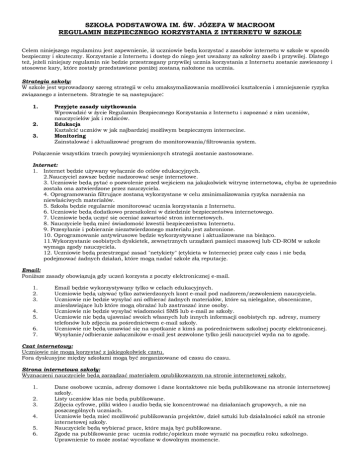 SZKOŁA PODSTAWOWA IM. ŚW. JÓZEFA W MACROOM REGULAMIN BEZPIECZNEGO KORZYSTANIA Z INTERNETU W SZKOLE Celem niniejszego regulaminu jest zapewnienie, iż uczniowie będą korzystać z zasobów internetu w szkole w sposób bezpieczny i skuteczny. Korzystanie z Internetu i dostęp do niego jest uważany za szkolny zasób i przywilej. Dlatego też, jeżeli niniejszy regulamin nie będzie przestrzegany przywilej ucznia korzystania z Internetu zostanie zawieszony i stosowne kary, które zostały przedstawione poniżej zostaną nałożone na ucznia. Strategia szkoły: W szkole jest wprowadzony szereg strategii w celu zmaksymalizowania możliwości kształcenia i zmniejszenie ryzyka związanego z internetem. Strategie te są następujące: 1. 2. 3. Przyjęte zasady użytkowania Wprowadzić w życie Regulamin Bezpiecznego Korzystania z Internetu i zapoznać z nim uczniów, nauczycielów jak i rodziców. Edukacja Kształcić uczniów w jak najbardziej możliwym bezpiecznym internecine. Monitoring Zainstalować i aktualizować program do monitorowania/filtrowania system. Połączenie wszystkim trzech powyżej wymienionych strategii zostanie zastosowane. Internet: 1. Internet będzie używany wyłącznie do celów edukacyjnych. 2.Nauczyciel zawsze będzie nadzorować sesje internetowe. 3. Uczniowie będą pytać o pozwolenie przed wejściem na jakąkolwiek witrynę internetową, chyba że uprzednio została ona zatwierdzone przez nauczyciela. 4. Oprogramowania filtrujące zostaną wykorzystane w celu zminimalizowania ryzyka narażenia na niewłaściwych materiałów. 5. Szkoła będzie regularnie monitorować ucznia korzystania z Internetu. 6. Uczniowie będą dodatkowo przeszkoleni w dziedzinie bezpieczeństwa internetowego. 7. Uczniowie będą uczyć się oceniać zawartość stron internetowych. 8. Nauczyciele będą mieć świadomość kwestii bezpieczeństwa Internetu. 9. Przesyłanie i pobieranie niezatwierdzonego materiału jest zabronione. 10. Oprogramowanie antywirusowe będzie wykorzystywane i aktualizowane na bieżąco. 11.Wykorzystanie osobistych dyskietek, zewnętrznych urządzeń pamięci masowej lub CD-ROM w szkole wymaga zgody nauczyciela. 12. Uczniowie będą przestrzegać zasad "netykiety" (etykieta w Internecie) przez cały czas i nie będą podejmować żadnych działań, które mogą nadać szkole złą reputację. Email: Poniższe zasady obowiązują gdy uczeń korzysta z poczty elektronicznej e-mail. 1. 2. 3. 4. 5. 6. 7. Email będzie wykorzystywany tylko w celach edukacyjnych. Uczniowie będą używać tylko zatwierdzonych kont e-mail pod nadzorem/zezwoleniem nauczyciela. Uczniowie nie będzie wysyłać ani odbierać żadnych materiałów, które są nielegalne, obsceniczne, zniesławiające lub które mogą obrażać lub zastraszać inne osoby. Uczniowie nie będzie wysyłać wiadomości SMS lub e-mail ze szkoły. Uczniowie nie będą ujawniać swoich własnych lub innych informacji osobistych np. adresy, numery telefonów lub zdjęcia za pośrednictwem e-mail szkoły. Uczniowie nie będą umawiać się na spotkanie z kimś za pośrednictwem szkolnej poczty elektronicznej. Wysyłanie/odbieranie załączników e-mail jest zezwolone tylko jeśli nauczyciel wyda na to zgodę. Czat internetowy: Uczniowie nie mogą korzystać z jakiegokolwiek czatu. Fora dyskusyjne między szkołami mogą być zorganizowane od czasu do czasu. Strona internetowa szkoły: Wyznaczeni nauczyciele będą zarządzać materiałem opublikowanym na stronie internetowej szkoły. 1. 2. 3. 4. 5. 6. Dane osobowe ucznia, adresy domowe i dane kontaktowe nie będą publikowane na stronie internetowej szkoły. Listy uczniów klas nie będą publikowane. Zdjęcia cyfrowe, pliki wideo i audio będą się koncentrować na działaniach grupowych, a nie na poszczególnych uczniach. Uczniowie będą mieć możliwość publikowania projektów, dzieł sztuki lub działalności szkół na stronie internetowej szkoły. Nauczyciele będą wybierać prace, które mają być publikowane. Zgodę na publikowanie prac ucznia rodzic/opiekun może wyrazić na początku roku szkolnego. Uprawnienie to może zostać wycofane w dowolnym momencie. 7. Uczniowie nadal będą właścicielami praw autorskich do każdej opublikowanej pracy. Legalizacja: Szkoła dostarczy informacji na temat następujących przepisów dotyczących korzystania z Internetu, z którymi nauczyciele, uczniowie i rodzice powinni się zapoznać: • • • • • Ochrona danych (Amendment) Akt 2003 Handel ludźmi i pornografią Akt 1998 Przechwytywanie Akt 1993 Nagrywanie plików wideo Akt 1989 Ustawa o ochronie danych 1988 Strony wsparcia: Porady na temat bezpiecznego korzystania z Internetu przez dzieci są zawarte na stronach www.ncte.ie i www.scoilnet.ie Obowiązki ucznia: Uczniowie są odpowiedzialni za dobre zachowanie w internecie. 1. Dostęp do internetu jest przywilejem a nie prawem . 2. Uczeń powinien pytać o pozwolenie nauczyciela za każdym razem gdy chce coś wydrukować/pobrać z internet. 3. Informacje osobiste tj. adres domowy, numery telefoniczne lub osobiste informacje na temat innych ludzi nigdy nie powinny być udostępniane. 4. Wykorzystanie osobistych dyskietek lub płyt CD-ROM lub USBs w szkole wymaga zgody nauczyciela. 5. Uczniowie będą przestrzegać zasady "Netykiety" o każdym czasie i nie będzą podejmować żadnych działań, które mogą przynieść szkole złą reputację. 6. Jeśli którykolwiek z tych zasad zostaną złamane, przywilej użytkowania internetu zostanie wycofany i kary, które zostały przedstawione poniżej zostaną nałożone. Kary: Niewłaściwe korzystanie z Internetu przez dłuższy czas może doprowadzić do postępowania dyscyplinarnego, w tym: Upomienie ustne Uwaga do rodziców (w dzienniczku) Cofnięcie uprawnień dostępu - krótkoterminowe / długoterminowe Jakiekolwiek nielegalne działania zostaną przekazane odpowiednim władzom. ----------------------------------------------------------------------