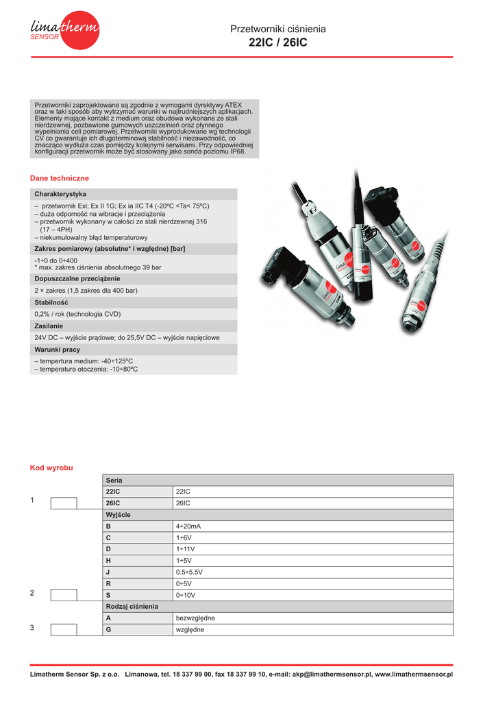 Przetworniki ciśnienia SENSOR 22IC / 26IC Przetworniki zaprojektowane są zgodnie z wymogami dyrektywy ATEX oraz w taki sposób aby wytrzymać warunki w najtrudniejszych aplikacjach. Elementy mające kontakt z medium oraz obudowa wykonane ze stali nierdzewnej, pozbawione gumowych uszczelnień oraz płynnego wypełniania celi pomiarowej. Przetworniki wyprodukowane wg technologii CV co gwarantuje ich długoterminową stabilność i niezawodność, co znacząco wydłuża czas pomiędzy kolejnymi serwisami. Przy odpowiedniej konfiguracji przetwornik może być stosowany jako sonda poziomu IP68. Dane techniczne Charakterystyka – przetwornik Exi; Ex II 1G; Ex ia IIC T4 (-20ºC <Ta< 75ºC) – duża odporność na wibracje i przeciążenia – przetwornik wykonany w całości ze stali nierdzewnej 316 (17 – 4PH) – niekumulowalny błąd temperaturowy Zakres pomiarowy (absolutne* i względne) [bar] -1÷0 do 0÷400 * max. zakres ciśnienia absolutnego 39 bar Dopuszczalne przeciążenie 2 × zakres (1,5 zakres dla 400 bar) Stabilność 0,2% / rok (technologia CVD) Zasilanie 24V DC – wyjście prądowe; do 25,5V DC – wyjście napięciowe Warunki pracy – tempertura medium: -40÷125ºC – temperatura otoczenia: -10÷80ºC Kod wyrobu Seria 1 22IC 22IC 26IC 26IC Wyjście 2 B 4÷20mA C 1÷6V D 1÷11V H 1÷5V J 0.5÷5.5V R 0÷5V S 0÷10V Rodzaj ciśnienia 3 A bezwzględne G względne Limatherm Sensor Sp. z o.o. Limanowa, tel. 18 337 99 00, fax 18 337 99 10, e-mail: [email protected], www.limathermsensor.pl Przetworniki ciśnienia SENSOR 22IC / 26IC Zakres ciśnienia 4 A10 0-1 bar A16 0-1,6 bar A25 0-2,5 bar A40 0-4 bar A60 0-6 bar B10 0-10 bar B16 0-16 bar B25 0-25 bar B40 0-40 bar B60 0-60 bar C10 0-100 bar C16 0-160 bar C25 0-250 bar C40 0-400 bar Vac Vac=-1 bar 1A0 Vac-0 bar 1A6 Vac-0,6 bar 2A5 Vac-1,5 bar 4A0 Vac-3 bar 6A0 Vac-5 bar 1B0 Vac-9 bar 1B6 Vac-15 bar 2B5 Vac-24 bar 4B0 Vac-39 bar Przyłącze procesowe 5 01 G¼ zewnętrzny 02 ¼-18NPT zewntrzny 03 G½” 04 7/16UNF zewnętrzny 05 G¼ zewnętrzny + uszczelka 08 ⅛NPT zewnętrzny 09 G⅛ wewntrzny 00 G¼ wewnętrzny 0A R¼ zewnętrzny 19 bez przyłącza (tylko 2600) Podłączenie elektryczne dla 22IC A złącza przemysłowe DIN z wtyczką B A-złącza przemysłowe DIN F przewód zanurzeniowy IP67 Podłączenie elektryczne dla 2600 6 C wtyczka typ Mil–C rozmiar 10-6 G złącze przemysłowe DIN 43650 M zanurzeniowy max. 200m 1 wtyczka typ Mil–C rozmiar 8-4 3 wyjście przewodowe ½NPT T mikro DIN 43650 Limatherm Sensor Sp. z o.o. Limanowa, tel. 18 337 99 00, fax 18 337 99 10, e-mail: [email protected], www.limathermsensor.pl Przetworniki ciśnienia SENSOR 22IC / 26IC Ochrona aparatu 7 B bariera zenera tylko ćiśnienie względne G izolacja galwaniczna Ex EEx ia IIC t4 (-20 < Ta < 75ºC) Długość przewodu 8 U brak D 1m E 3m F 5m G 10m H 15m J 20m K 25m L 30m M 40m N 50m R 125m Dokładność/błąd temperatury 9 A 25%/1,5% B 15%/1,0% Inne parametry 10 inne parametry wg uzgodnień 2 1 – 3 – 4 – Przykład zamówienia: 5 – 6 – 7 – 8 – 9 – 10 – Przetwornik cisnienia 2600 B–A60–03–G–3–U–A Limatherm Sensor Sp. z o.o. Limanowa, tel. 18 337 99 00, fax 18 337 99 10, e-mail: [email protected], www.limathermsensor.pl