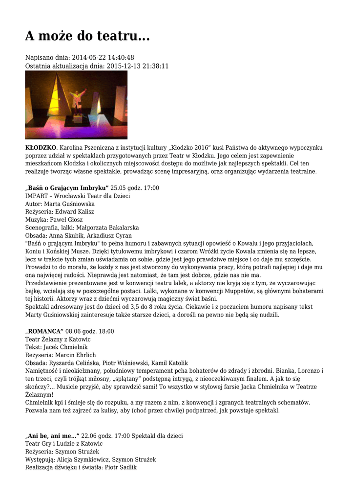 A może do teatru... Napisano dnia: 2014-05-22 14:40:48 Ostatnia aktualizacja dnia: 2015-12-13 21:38:11 KŁODZKO. Karolina Pszeniczna z instytucji kultury „Kłodzko 2016” kusi Państwa do aktywnego wypoczynku poprzez udział w spektaklach przygotowanych przez Teatr w Kłodzku. Jego celem jest zapewnienie mieszkańcom Kłodzka i okolicznych miejscowości dostępu do możliwie jak najlepszych spektakli. Cel ten realizuje tworząc własne spektakle, prowadząc scenę impresaryjną, oraz organizując wydarzenia teatralne. „Baśń o Grającym Imbryku” 25.05 godz. 17:00 IMPART – Wrocławski Teatr dla Dzieci Autor: Marta Guśniowska Reżyseria: Edward Kalisz Muzyka: Paweł Głosz Scenografia, lalki: Małgorzata Bakalarska Obsada: Anna Skubik, Arkadiusz Cyran "Baśń o grającym Imbryku" to pełna humoru i zabawnych sytuacji opowieść o Kowalu i jego przyjaciołach, Koniu i Końskiej Musze. Dzięki tytułowemu imbrykowi i czarom Wróżki życie Kowala zmienia się na lepsze, lecz w trakcie tych zmian uświadamia on sobie, gdzie jest jego prawdziwe miejsce i co daje mu szczęście. Prowadzi to do morału, że każdy z nas jest stworzony do wykonywania pracy, którą potrafi najlepiej i daje mu ona najwięcej radości. Nieprawdą jest natomiast, że tam jest dobrze, gdzie nas nie ma. Przedstawienie prezentowane jest w konwencji teatru lalek, a aktorzy nie kryją się z tym, że wyczarowując bajkę, wcielają się w poszczególne postaci. Lalki, wykonane w konwencji Muppetów, są głównymi bohaterami tej historii. Aktorzy wraz z dziećmi wyczarowują magiczny świat baśni. Spektakl adresowany jest do dzieci od 3,5 do 8 roku życia. Ciekawie i z poczuciem humoru napisany tekst Marty Guśniowskiej zainteresuje także starsze dzieci, a dorośli na pewno nie będą się nudzili. „ROMANCA” 08.06 godz. 18:00 Teatr Żelazny z Katowic Tekst: Jacek Chmielnik Reżyseria: Marcin Ehrlich Obsada: Ryszarda Celińska, Piotr Wiśniewski, Kamil Katolik Namiętność i nieokiełznany, południowy temperament pcha bohaterów do zdrady i zbrodni. Bianka, Lorenzo i ten trzeci, czyli trójkąt miłosny, „splątany” podstępną intrygą, z nieoczekiwanym finałem. A jak to się skończy?… Musicie przyjść, aby sprawdzić sami! To wszystko w stylowej farsie Jacka Chmielnika w Teatrze Żelaznym! Chmielnik kpi i śmieje się do rozpuku, a my razem z nim, z konwencji i zgranych teatralnych schematów. Pozwala nam też zajrzeć za kulisy, aby (choć przez chwilę) podpatrzeć, jak powstaje spektakl. „Ani be, ani me…” 22.06 godz. 17:00 Spektakl dla dzieci Teatr Gry i Ludzie z Katowic Reżyseria: Szymon Strużek Występują: Alicja Szymkiewicz, Szymon Strużek Realizacja dźwięku i światła: Piotr Sadlik Zwariowany profesor Decybeliusz i jego poukładana asystentka Zosia zabiorą widzów w świat pełen dźwięków. Przeżyją śmieszne, ale i pełne grozy przygody. Do czego potrzebny im soniczny detonator? Dlaczego krowa mieszka w laboratorium? I wreszcie, czy uda im się naprawić nieudany eksperyment i doprowadzić dźwiękowy świat do porządku? "Ani me, ani be..." to autorska bajka inspirowana i oparta na dźwiękach, które często giną pośród codziennych obowiązków. Pozornie surowa scenografia, na oczach widzów zmienia się w magiczne laboratorium, gdzie prawa fizyki nie zawsze działają tak jak powinny. W spektaklu wykorzystano grę światłem i cieniem, a jak na historię o dźwiękach przystało - są one nieodłącznym towarzyszem teatralnego widowiska. (kp) NZ.: Kadr ze spektaklu pt. „Ani me, ani be”
