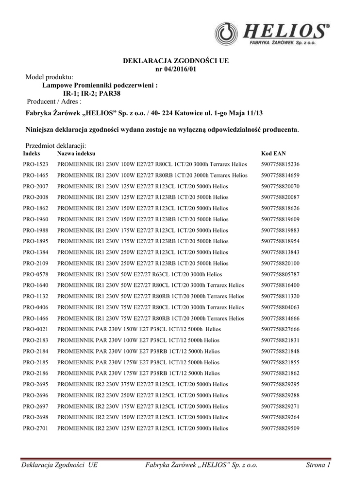 Deklaracja CE - Fabryka Żarówek HELIOS