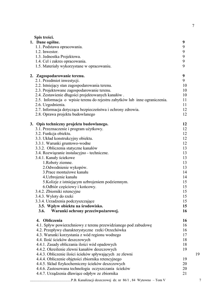 7 Spis treści. 1. Dane ogólne. 1.1. Podstawa opracowania. 1.2. Inwestor. 1.3. Jednostka Projektowa. 1.4. Cel i zakres opracowania. 1.5. Materiały wykorzystane w opracowaniu. 9 9 9 9 9 9 2. Zagospodarowanie terenu. 2.1. Przedmiot inwestycji. 2.2. Istniejący stan zagospodarowania terenu. 2.3. Projektowane zagospodarowanie terenu. 2.4. Zestawienie długości projektowanych kanałów . 2.5. Informacja o wpisie terenu do rejestru zabytków lub inne ograniczenia. 2.6. Uzgodnienia. 2.7. Informacja dotycząca bezpieczeństwa i ochrony zdrowia. 2.8. Oprawa projektu budowlanego 9 9 10 10 10 11 11 12 12 3. Opis techniczny projektu budowlanego. 3.1. Przeznaczenie i program użytkowy. 3.2. Funkcja obiektu. 3.3. Układ konstrukcyjny obiektu. 3.3.1. Warunki gruntowo-wodne 3.3.2. Obliczenia statyczne kanałów 3.4. Rozwiązanie instalacyjno - techniczne. 3.4.1. Kanały ściekowe 1.Roboty ziemne. 2.Odwodnienie wykopów. 3.Prace montażowe kanału 4.Uzbrojenie kanału 5.Kolizje z istniejącym uzbrojeniem podziemnym. 6.Odbiór częściowy i końcowy. 3.4.2. Zbiorniki retencyjne 3.4.3. Wyloty do rzeki 3.3.4. Urzadzenia podczyszczające 3.5. Wpływ obiektu na środowisko. 3.6. Warunki ochrony przeciwpożarowej. 12 12 12 12 12 13 13 13 13 13 14 14 15 15 15 15 15 15 16 4. Obliczenia 4.1. Spływ powierzchniowy z terenu przewidzianego pod zabudowę 4.2. Przepływy charakterystyczne rzeki Orzechówka 4.3. Warunki korzystania z wód regionu wodnego 4.4. Ilość ścieków deszczowych 4.4.1. Zasady obliczania ilości wód opadowych 4.4.2. Określenie zlewni kanałów deszczowych 4.4.3. Obliczenie ilości ścieków spływających ze zlewni 4.4.4. Obliczenie objętości zbiornika retencyjnego 4.4.5. Skład fizykochemiczny ścieków deszczowych 4.4.6. Zastosowana technologia oczyszczania ścieków 4.4.7. Urządzenia dławiące odpływ ze zbiornika ..............................................P.B. Kanalizacji deszczowej dz. nr 86/1 , 84 Wytowno – Tom V 16 16 16 17 18 18 19 19 19 20 20 21 7 8 5. Spis Tabel 1. Tabela 1. Zbiorcze zestawienie materiałów do budowy kanalizacji deszczowej 2. Tabela 2. Obliczenia hydrauliczne kanalizacji deszczowej 3. Tabela 3. Obliczenie spływu powierzchniowego z terenu przed zabudową 4. Tabela 4. Obliczenie pojemności zbiornika retencyjnego 22 23 24 24 5. Część graficzna. 1. Plan poglądowy kanalizacji deszczowej 2. Projekt zagospodarowania i sytuacyjno-wysokościowy kanalizacji deszczowej wraz z przykanalikami od wpustów 3. Profile podłużne kanałów deszczowych 4. Profile podłużne przykanalików odpustów 5. Wylot do rowu szczegółowego 6. Układ konstrukcyjno-technologiczny urządzenia podczyszczającego 7. Rozmieszczenie kanału ściekowego i deszczowego jednym wykopie 8. Zbiornik retencyjny ..............................................P.B. Kanalizacji deszczowej dz. nr 86/1 , 84 Wytowno – Tom V 8 9 1. Dane ogólne . 1.1. Podstawa opracowania . Zlecenie i umowa zawarta z Pomerania Nieruchomości Ustka , na opracowanie dokumentacji infrastruktury technicznej na działkach nr 83/2 i 86/1 obręb Wytowno. 1.2. Inwestor . Pomerania Nieruchomości Ustka Sp. z o.o ul. Sportowa , 76-200 Słupsk 1.3. Przedmiot i zakres opracowania . Przedmiotem opracowania jest projekt budowlany kanalizacji deszczowej wraz z przyłączami na działkach 83/2 i 86/1/ przed podziałem/. Zakres opracowania zgodny z Rozporządzeniem Ministra Infrastruktury z dnia 3.07.2003 r. w sprawie szczegółowego zakresu i formy projektu budowlanego / Dz.U . nr.120, poz. 1133 / . 1.3. Przedmiot i zakres opracowania . Przedmiotem opracowania jest projekt budowlany kanalizacji deszczowej wraz z przykanalikami od wpustów ulicznych umożliwiającej odprowadzenie po retencjonowaniu ścieków deszczowych poprzez rów szczegółowy do rzeki Orzechówka. Zakres opracowania zgodny z Rozporządzeniem Ministra Infrastruktury z dnia 3.07.2003 r. w sprawie szczegółowego zakresu i formy projektu budowlanego / Dz.U . nr.120, poz. 1133 / 1.4. Jednostka projektowa . Pracownia Projektowa „ Projektowanie i Nadzór Autorski ”, inż. Milita Gruszecka, Koszalin , ul. Stoczniowców 10 . 1.5. Materiały wykorzystane w opracowaniu . - Koncepcja kanalizacji deszczowej na działkach 341, 20/3 obręb Wytowno , lipiec 2011 r - Wypis z miejscowego planu zagospodarowania - Decyzja celu publicznego wydana przez Wójta Gminy Ustka - Warunki techniczne na wykonanie kanalizacji ściekowej wydane przez Zakład Usług Wodnych w Słupsku - Warunki wydane przez ZMiUW WP w Gdańsku, Terenowy oddz. w Słupsku - Mapy do celów projektowych - Normy , zarządzenia i literatura techniczna dotycząca rozwiązywanego zagadnienia, - Pomiary uzupełniające i wizja lokalna , - Uzgodnienia z poszczególnymi użytkownikami uzbrojenia podziemnego – ZUDP w Słupsku - Uzgodnienia z właścicielami działek przez które projektowana jest kanalizacja ściekowa 2. Zabudowa i zagospodarowanie terenu. 2.1. Przedmiot inwestycji. Zamierzeniem budowlanym obejmującym poniższy tom jest budowa kanałów deszczowych i przykanalików od wpustów obejmującego tereny dróg wewnętrznych na działkach objętych opracowaniem. ..............................................P.B. Kanalizacji deszczowej dz. nr 86/1 , 84 Wytowno – Tom V 9 10 Projektowana kanalizacja deszczowa umożliwi odwodnienie układu komunikacyjnego i odprowadzenie ścieków deszczowych poprzez rów szczegółowy do rzeki Orzechówka poprzez projektowany zbiornik retencyjny. Wody opadowe z powierzchni niezabudowanej na terenie działki będą odprowadzane bezpośrednio do gruntu natomiast z dachów i tarasów będą retencjonowane z zbiornikach i wykorzystywane do podlewania zieleni. Odpływy z terenu utwardzonego – podjazdy do garażu i chodniki będą odprowadzane do gruntu poprzez studzienki chłonne. Kanały deszczowe na terenie osiedla projektowane są w pasie rozgraniczającym projektowanych ciągów komunikacyjnych. Zgodnie z warunkami wydanymi przez ZMiUW , oddział terenowy w Słupsku ,