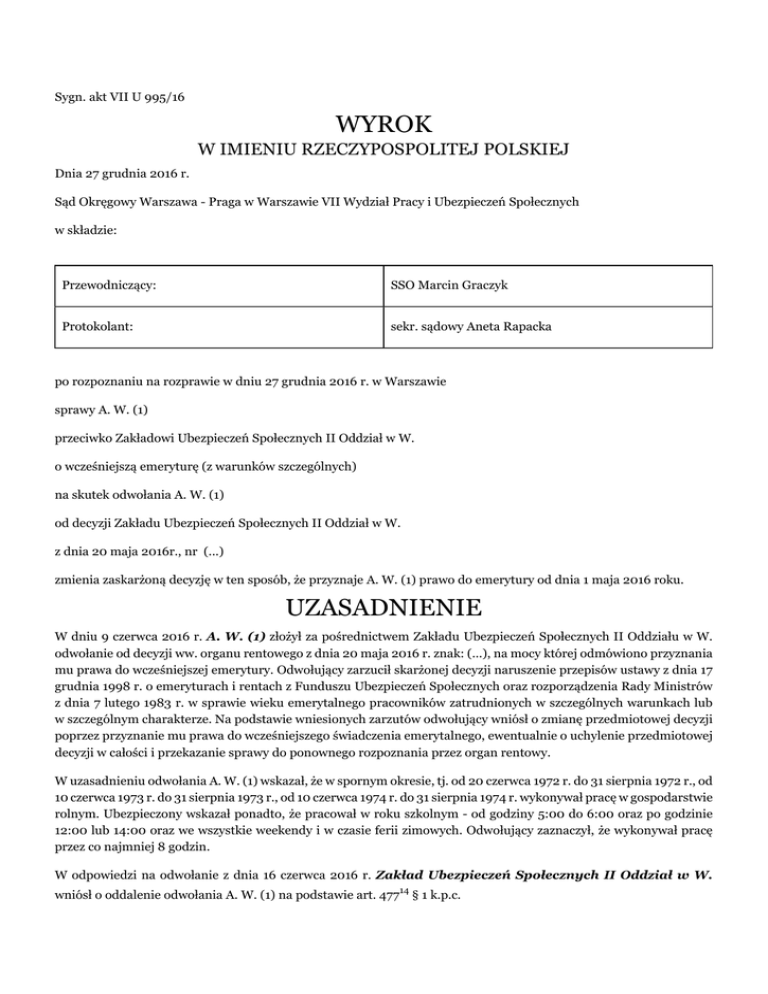 Sygn. akt VII U 995/16 WYROK W IMIENIU RZECZYPOSPOLITEJ POLSKIEJ Dnia 27 grudnia 2016 r. Sąd Okręgowy Warszawa - Praga w Warszawie VII Wydział Pracy i Ubezpieczeń Społecznych w składzie: Przewodniczący: SSO Marcin Graczyk Protokolant: sekr. sądowy Aneta Rapacka po rozpoznaniu na rozprawie w dniu 27 grudnia 2016 r. w Warszawie sprawy A. W. (1) przeciwko Zakładowi Ubezpieczeń Społecznych II Oddział w W. o wcześniejszą emeryturę (z warunków szczególnych) na skutek odwołania A. W. (1) od decyzji Zakładu Ubezpieczeń Społecznych II Oddział w W. z dnia 20 maja 2016r., nr (...) zmienia zaskarżoną decyzję w ten sposób, że przyznaje A. W. (1) prawo do emerytury od dnia 1 maja 2016 roku. UZASADNIENIE W dniu 9 czerwca 2016 r. A. W. (1) złożył za pośrednictwem Zakładu Ubezpieczeń Społecznych II Oddziału w W. odwołanie od decyzji ww. organu rentowego z dnia 20 maja 2016 r. znak: (...), na mocy której odmówiono przyznania mu prawa do wcześniejszej emerytury. Odwołujący zarzucił skarżonej decyzji naruszenie przepisów ustawy z dnia 17 grudnia 1998 r. o emeryturach i rentach z Funduszu Ubezpieczeń Społecznych oraz rozporządzenia Rady Ministrów z dnia 7 lutego 1983 r. w sprawie wieku emerytalnego pracowników zatrudnionych w szczególnych warunkach lub w szczególnym charakterze. Na podstawie wniesionych zarzutów odwołujący wniósł o zmianę przedmiotowej decyzji poprzez przyznanie mu prawa do wcześniejszego świadczenia emerytalnego, ewentualnie o uchylenie przedmiotowej decyzji w całości i przekazanie sprawy do ponownego rozpoznania przez organ rentowy. W uzasadnieniu odwołania A. W. (1) wskazał, że w spornym okresie, tj. od 20 czerwca 1972 r. do 31 sierpnia 1972 r., od 10 czerwca 1973 r. do 31 sierpnia 1973 r., od 10 czerwca 1974 r. do 31 sierpnia 1974 r. wykonywał pracę w gospodarstwie rolnym. Ubezpieczony wskazał ponadto, że pracował w roku szkolnym - od godziny 5:00 do 6:00 oraz po godzinie 12:00 lub 14:00 oraz we wszystkie weekendy i w czasie ferii zimowych. Odwołujący zaznaczył, że wykonywał pracę przez co najmniej 8 godzin. W odpowiedzi na odwołanie z dnia 16 czerwca 2016 r. Zakład Ubezpieczeń Społecznych II Oddział w W. wniósł o oddalenie odwołania A. W. (1) na podstawie art. 47714 § 1 k.p.c. Przedstawiając swoje stanowisko w sprawie organ rentowy podkreślił, że z zeznań świadków przedłożonych przez ubezpieczonego wynika, że w okresie od 20 czerwca 1972 r. do 30 sierpnia 1972 r. oraz od 22 czerwca 1973 r. do 30 sierpnia 1973 r. i od 23 czerwca 1974 r. do 30 sierpnia 1974 r. ubezpieczony pracował po 8 godzin, natomiast w pozostałych okresach, a więc podczas ferii zimowych oraz w sobotę, odwołujący pracował w wymiarze 3 godzin. Wobec czego gdyby nawet hipotetycznie wliczyć powyższe okresy do stażu pracy, to odwołujący nie spełniłby warunku 25 lat okresów składkowych, nieskładkowych i uzupełniających. Z tych powodów Zakład Ubezpieczeń Społecznych II Oddział w W. w dniu 20 maja 2016 r. wydał decyzję znak: (...) odmawiającą A. W. (1) prawa do roszczonego świadczenia. Sąd Okręgowy ustalił następujący stan faktyczny: A. W. (1) urodzony (...) uczęszczał do (...) Szkoły Zawodowej w P.. W okresie wakacyjnym od 20 czerwca 1972 r. do 30 sierpnia 1972 r., od 22 czerwca 1973 r. do 30 sierpnia 1973 r., oraz od 23 czerwca 1974 r. do 30 sierpnia 1974 r. pracował w około 6 hektarowym gospodarstwie rolnym rodziców H. i A. W. (2). Odwołujący mieszkał w tym czasie wraz z rodzicami oraz bratem. W powyższym okresie pracował 6 dni w tygodniu od poniedziałku do soboty, choć jeżeli była taka potrzeba pracował również w niedziele. Jego praca polegała na wykonywaniu prac polowych. W okresie letnim odwołujący pracował przy zbiorze truskawek i malin. W gospodarstwie rolnym rodziców A. W. (1) znajdował się sad drzew owocowych, z którego ubezpieczony zrywał jabłka, gruszki oraz śliwki, a następnie wraz z rodzicami transportowali owoce do skupów, albo na targ znajdujący się w miejscowości Z.. Na targu i skupie ubezpieczony spędzał wiele godzin sprzedając własne zbiory. W okresie wiosennym przygotowywał ziemniaki do sadzenia, które musiał sadzić ręcznie. Ponadto pielił truskawki i maliny, na jesieni wycinał gałęzie malin, natomiast w okresie zimowym ciął sieczkę. W ramach pracy na gospodarstwie rolnym ubezpieczony pomagał również w pracy przy żniwach. Zebrane zbiory, które zostały zebrane z pola, ubezpieczony z rodzicami przewozili za pomocą wozu zaprzęgniętego do konia. W gospodarstwie rolnym rodziców ubezpieczonego była także brukiew przeznaczona dla krów, która wymagała pielenia i przycinania liści, które to czynności należały również do obowiązków A. W. (1). Dodatkowo odwołujący pomagał przy obrządku zwierząt hodowlanych. W gospodarstwie rolnym rodziców bowiem znajdowała się trzoda chlewna - około 8 świń, dodatkowo posiadali 2 konie, 2 krowy oraz drób. Ubezpieczony stale zajmował się zwierzętami, dokarmiał je oraz nosił im wodę, którą czerpał początkowo ze strugi, a w późniejszym okresie ze studni. Ubezpieczony 2 razy dziennie rano i wieczorem musiał wydoić krowy i czynności te musiał wykonywać każdego dnia. Każdego dnia ubezpieczony w gospodarstwie rolnym wykonywał prace w wymiarze ponad 4 godzinnym, wielokrotnie praca to przedłużała się do 8 a nawet 10 godzin dziennie. Z kolei w okresie od 30 sierpnia 1972 r. do 30 sierpnia 1974 r., w czasie trwania roku szkolnego ubezpieczony uczęszczał do szkoły, która znajdowała się około 25 km od miejsca zamieszkania ubezpieczonego. Odwołujący w czasie trwania szkolnego okresu w godzinach porannych, przez zajęciami szkolnymi wyprowadzał krowy na działkę znajdującą się w odległości około 3 km od jego domu, karmił zwierzęta znajdujące się w gospodarstwie rolnym a następnie udawał się na przystanek autobusowy. Ze szkoły wracał około 